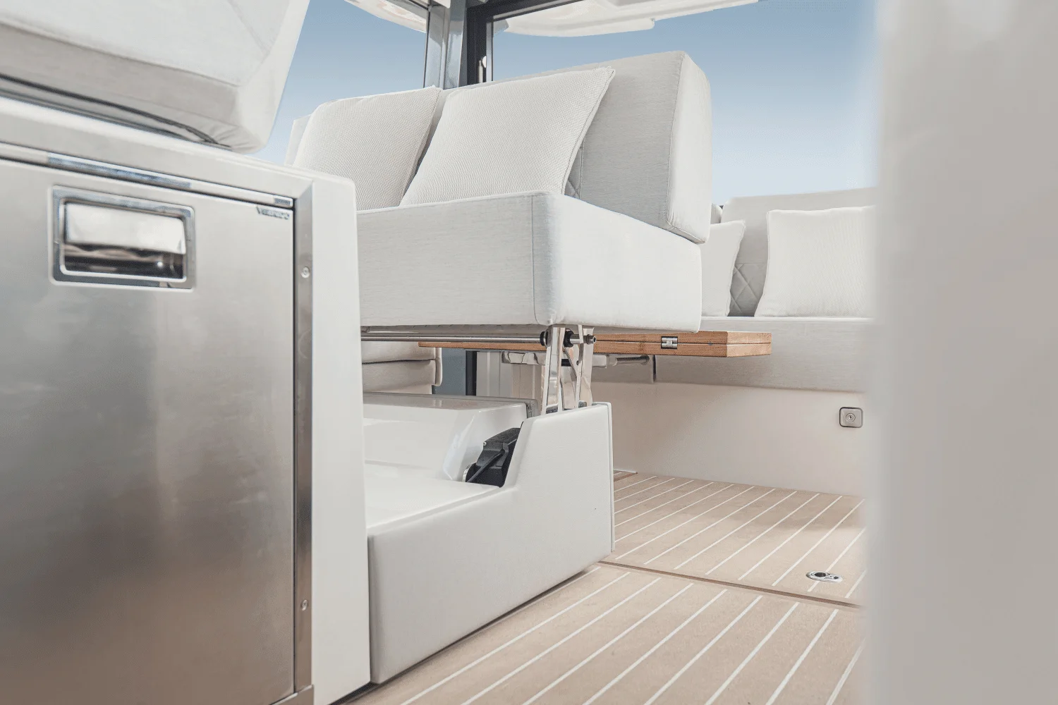 Convertible Comfort - A push-button sunroof slides open for fresh air or clases for shade in seconds. The rear sofa pulls out into a spacious sunbed, while the cockpit fridge and stern grill keep snacks and drinks within easy reach.