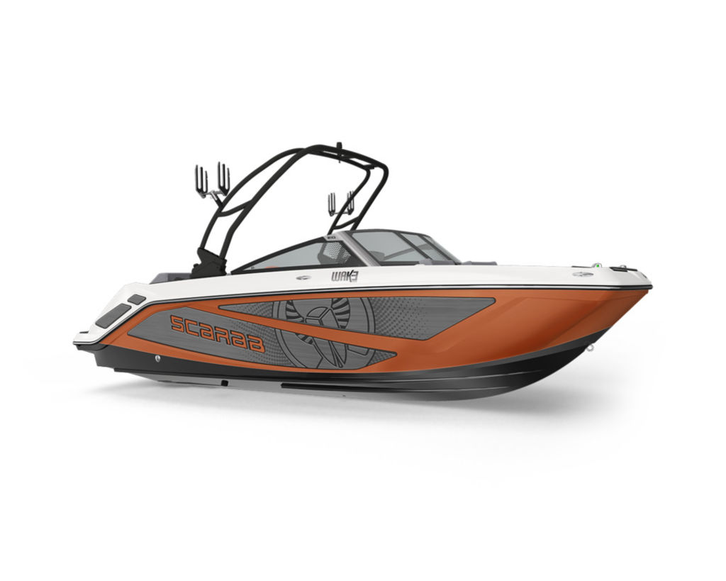 Striking Design: Finished in a bold Black / Afterburner Orange hull color, the boat’s sporty look is accentuated by its wake graphics and aerodynamic lines.
