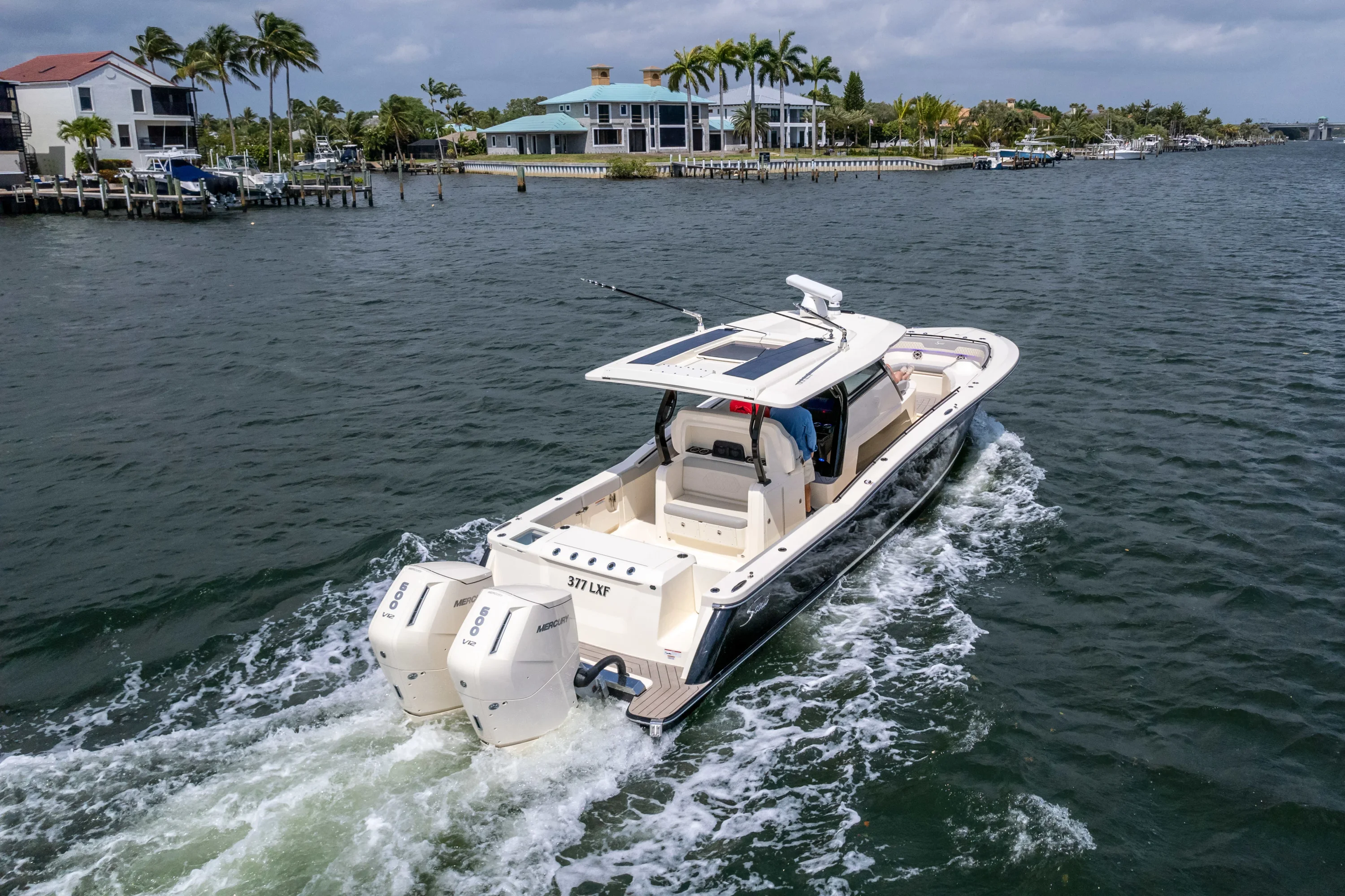 The 377 LXF is built as the ideal blend of performance, luxury and stylie. Loaded with Scout innovation, this model has a lithium ion bettery with battery management system (no generator necessary); portside swing-in boarding door with ladder; double sun deck lounge with cushions, armrests and underside storage forward of the console; key fob remote controlled lights; spacious cabin down below and an enclosed head with a porcelain vessel sink with Corian vanity and mirror; marine head with electric overboard discharge with an 11 gallon holding tank; 120V air conditioning and head in the cabin and at the helm; and so much more. Upgrade your experience out on the water with an available Seakeeper 3 gyro stabilizer; optional summer kitchen complete with grill, sink, cutting board, manual slide-out cooler, seat cushion and bolster; and your choice of upholstery color package. Dive in to discover more. Key Features Epitome of Luxury - Experience the epitome of luxury with the all-new 2026 Scout 377 LXF. Crafted with precision by Scout, this vessel promises unparalleled performance and sophistication.