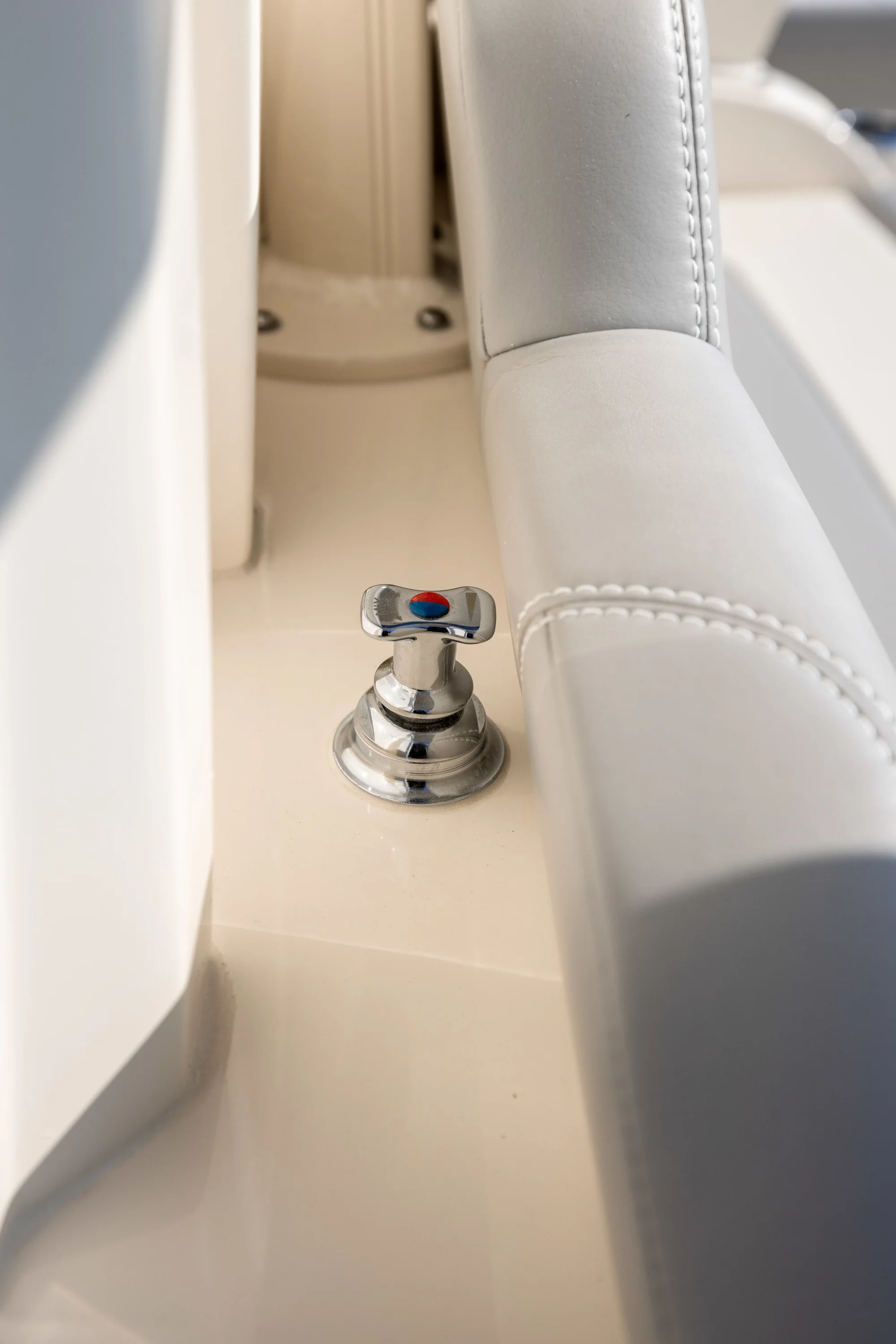 Electronically-Actuated Convertible Hideaway - Patent-pending. Push a button and the aft facing mezzanine seat and foot rest fold up to reveal an entertainment/bait prep station complete with hidden sink, cutting board, grill, tackle drawer and storage. Incredible space-saving, unique design that completely transforms the ultility of your boat in mere seconds.