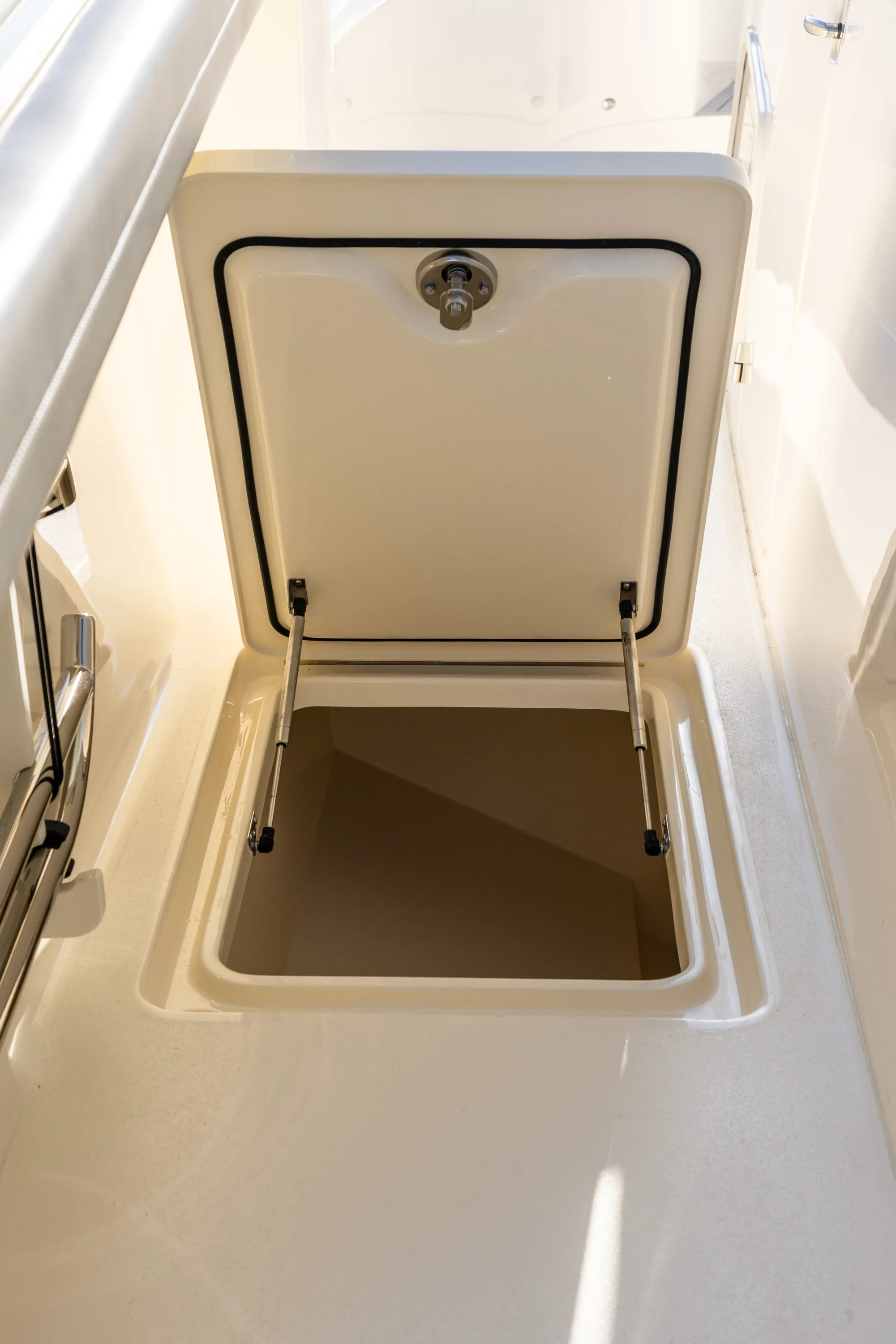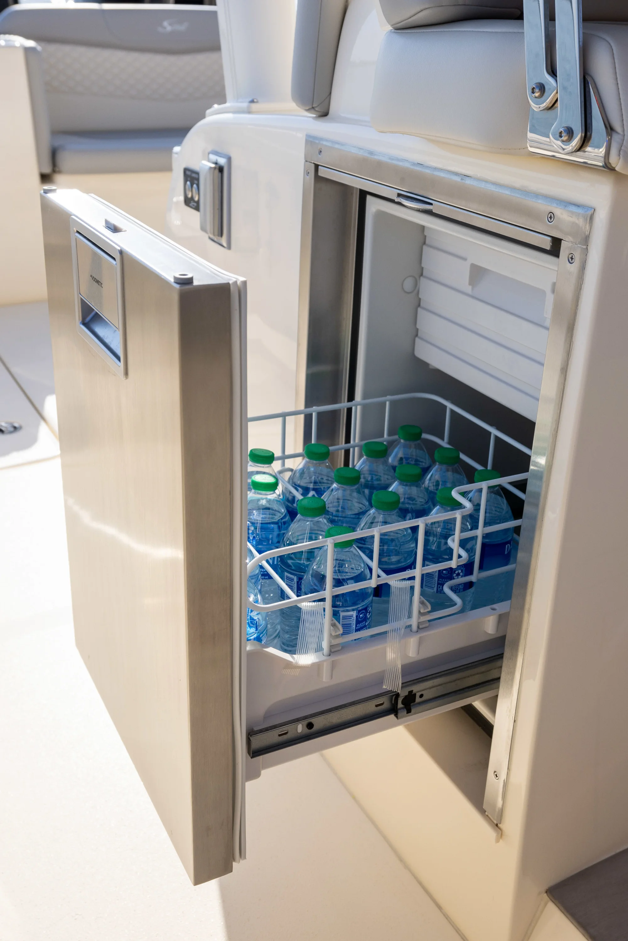 Electronically-Actuated Convertible Hideaway - Patent-pending. Push a button and the aft facing mezzanine seat and foot rest fold up to reveal an entertainment/bait prep station complete with hidden sink, cutting board, grill, tackle drawer and storage. Incredible space-saving, unique design that completely transforms the ultility of your boat in mere seconds.