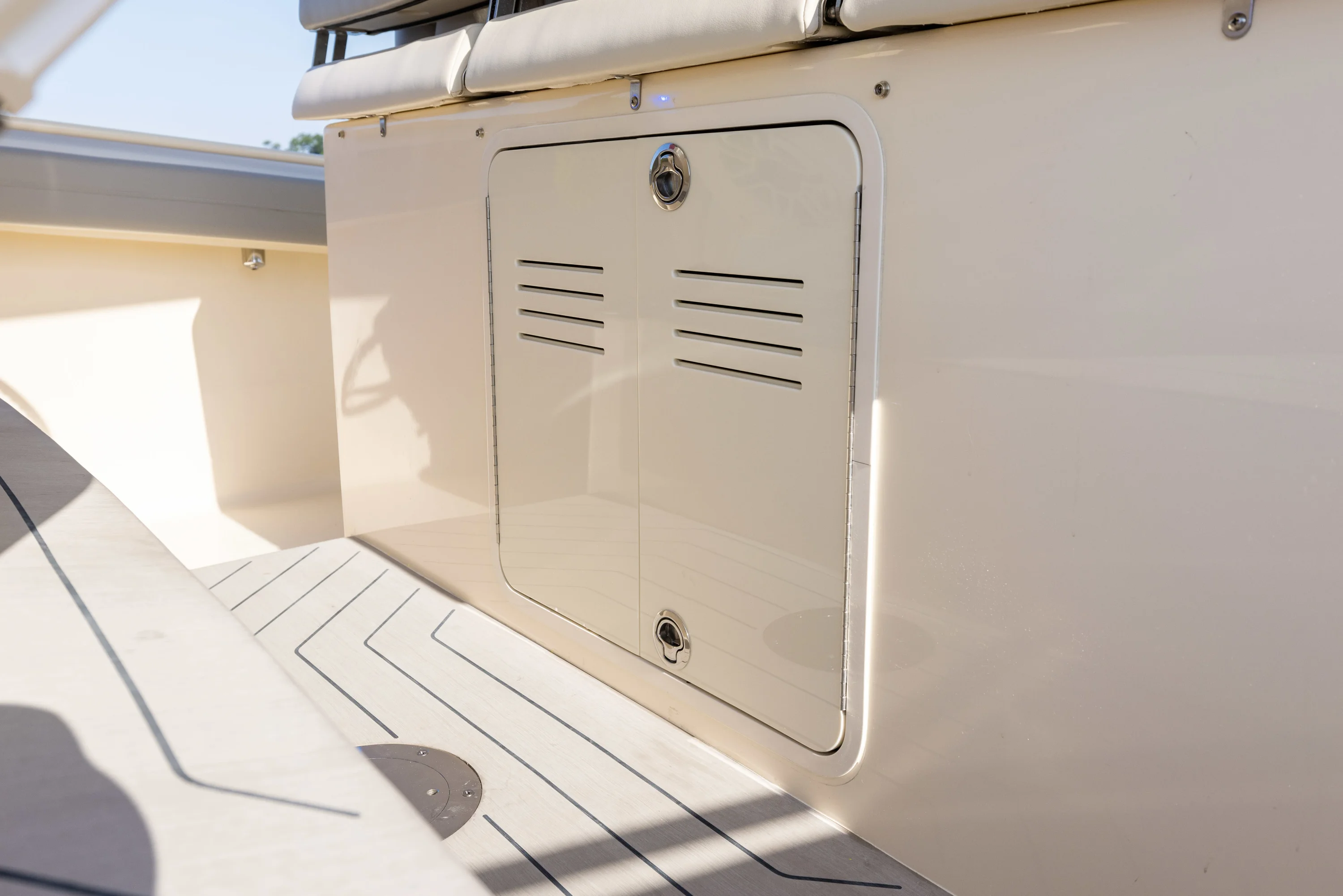 Electronically-Actuated Convertible Hideaway - Patent-pending. Push a button and the aft facing mezzanine seat and foot rest fold up to reveal an entertainment/bait prep station complete with hidden sink, cutting board, grill, tackle drawer and storage. Incredible space-saving, unique design that completely transforms the ultility of your boat in mere seconds.