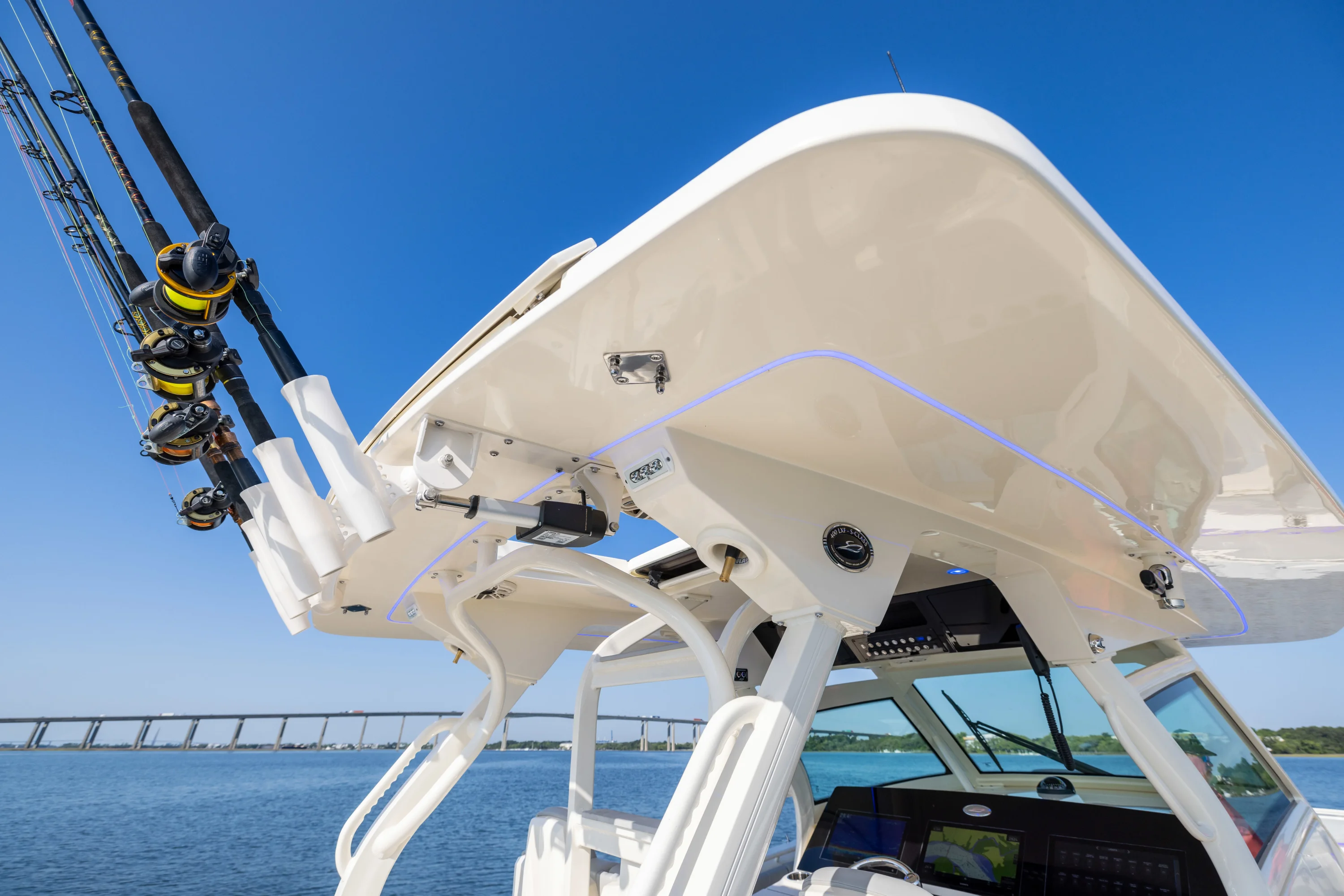 Articulating Rocket Launchers & SureShade - With the touch of a button, you can electronically raise or lower the hardtop mounted rocket launchers. When the SureShade retractable awning is deployed, the rocket launchers will also lower electronically. Having the rocket launchers articulatenot only provides an added unique feature to the boat, but also helps with ease of loading and unloading rods.