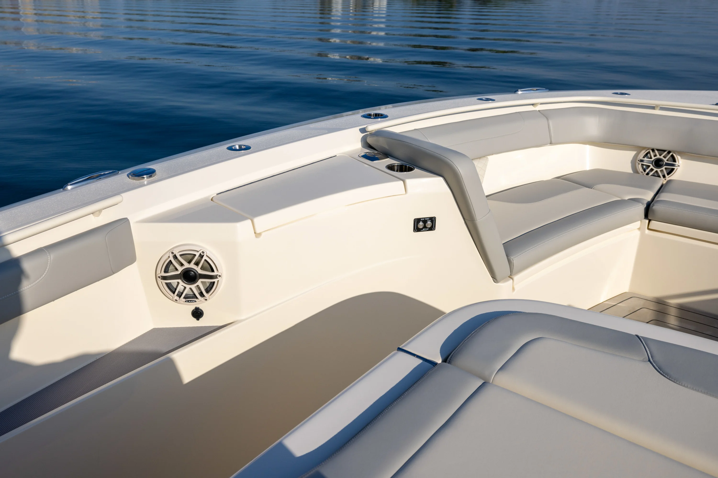 Electronically-Actuated Convertible Hideaway - Patent-pending. Push a button and the aft facing mezzanine seat and foot rest fold up to reveal an entertainment/bait prep station complete with hidden sink, cutting board, grill, tackle drawer and storage. Incredible space-saving, unique design that completely transforms the ultility of your boat in mere seconds.