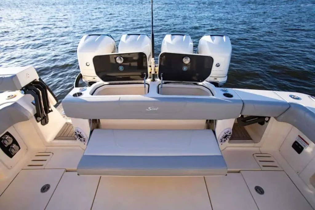 Digital Helm - Control on-board systems with the touch of a screen. Your Garmin screens encased in glass bezels provide the technological touch you've come to expect, as well as the seamless, modern styling they represent. Additional comfort is provided with Scout's standard heated helm seats featured on both rows.