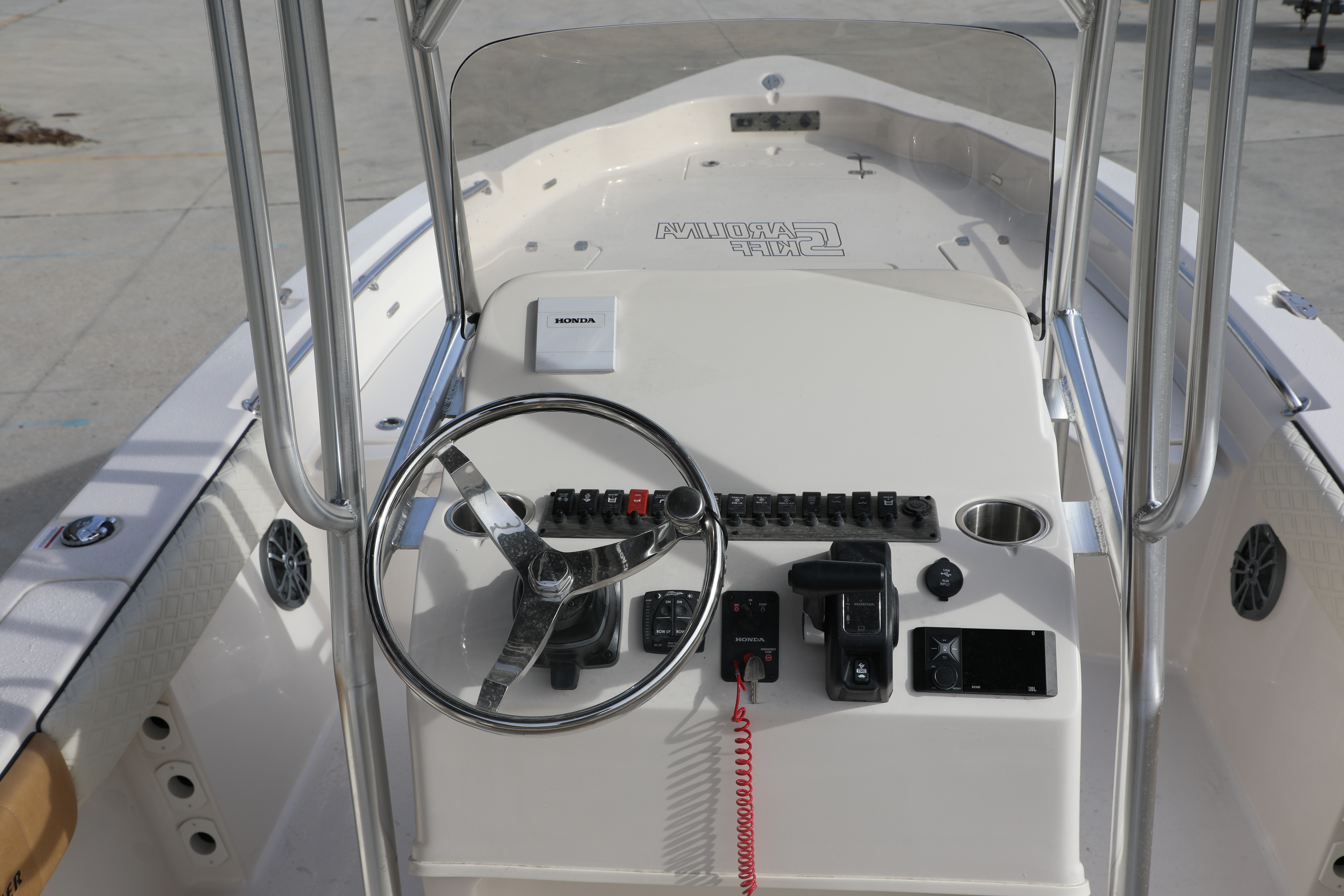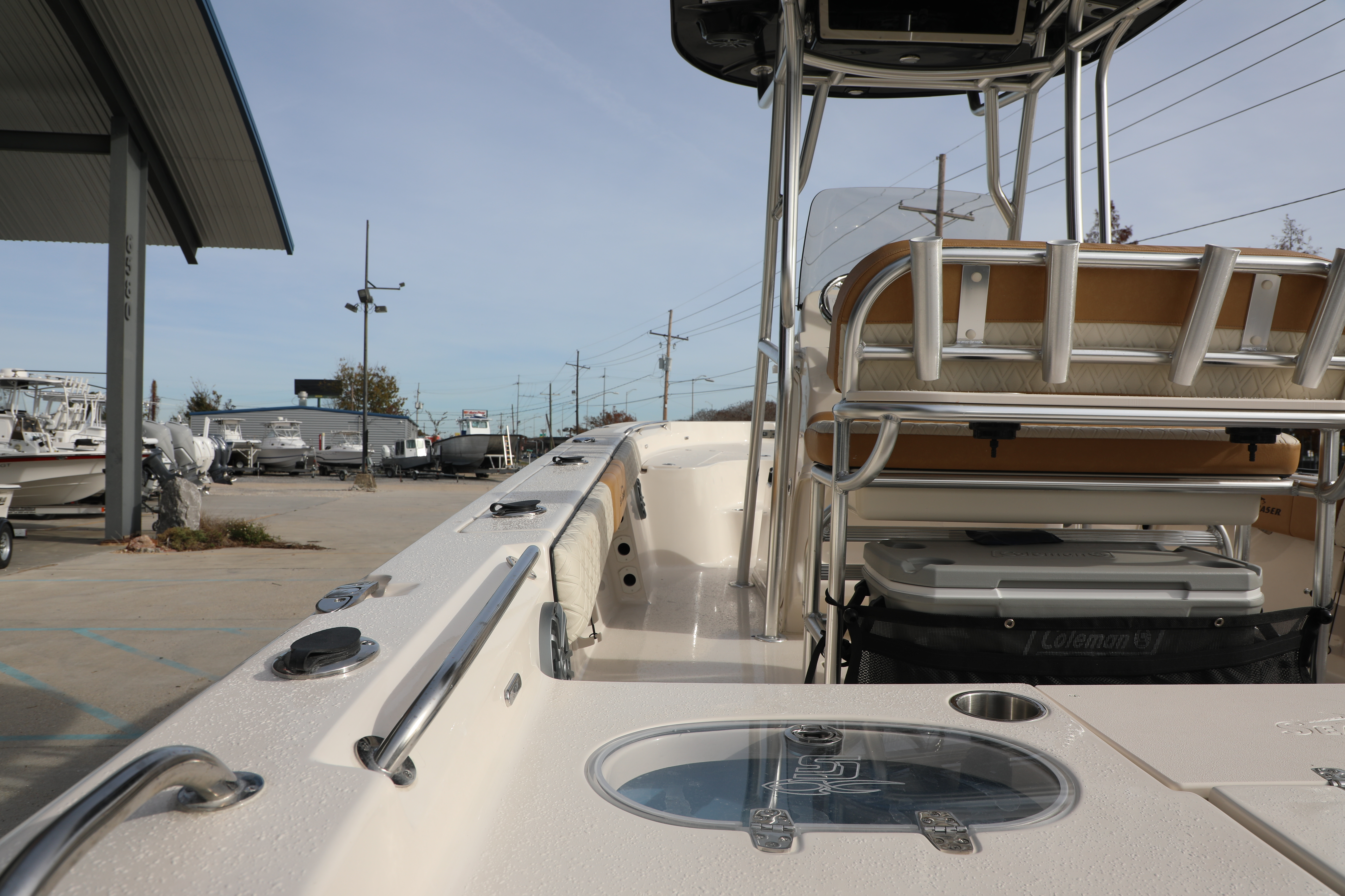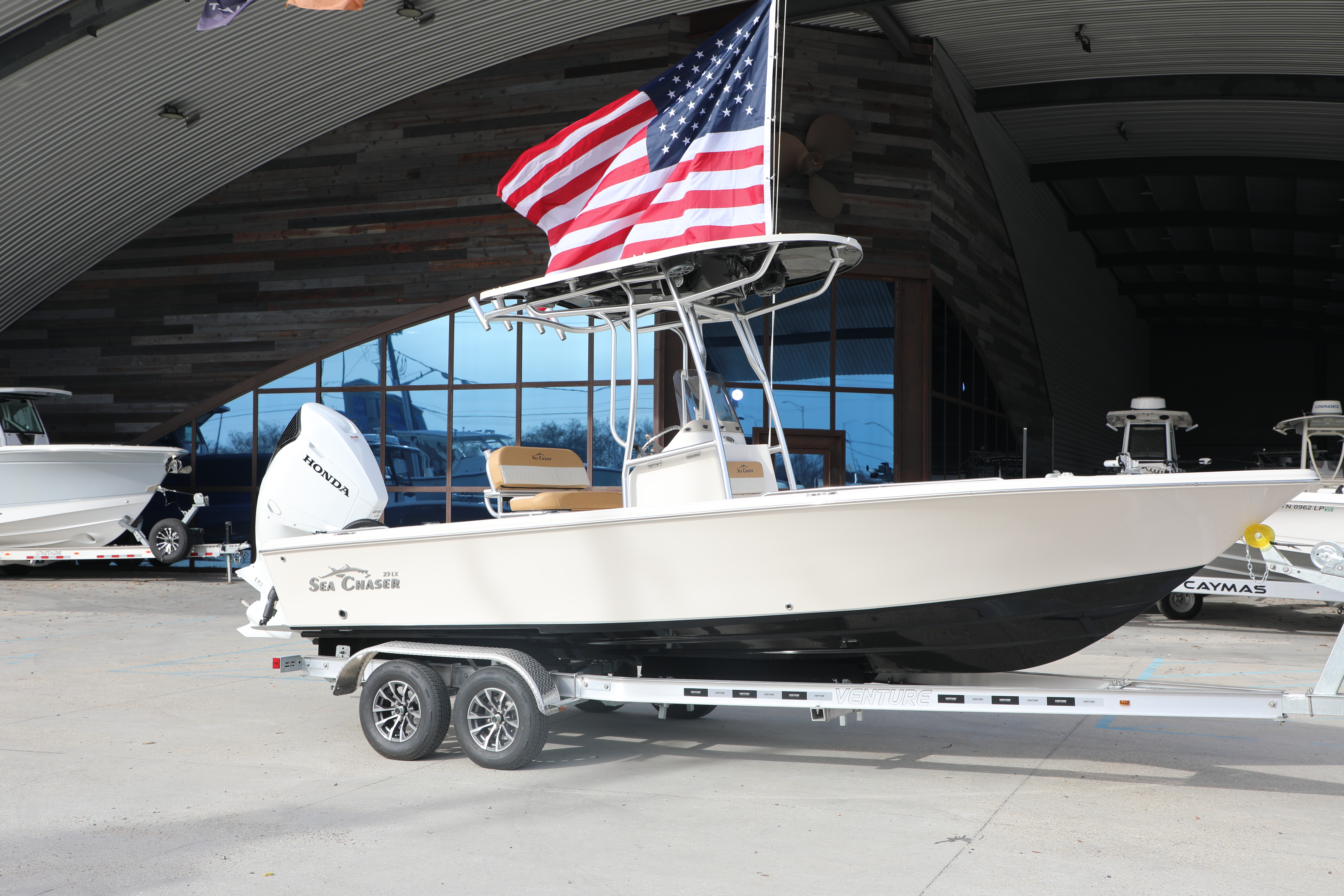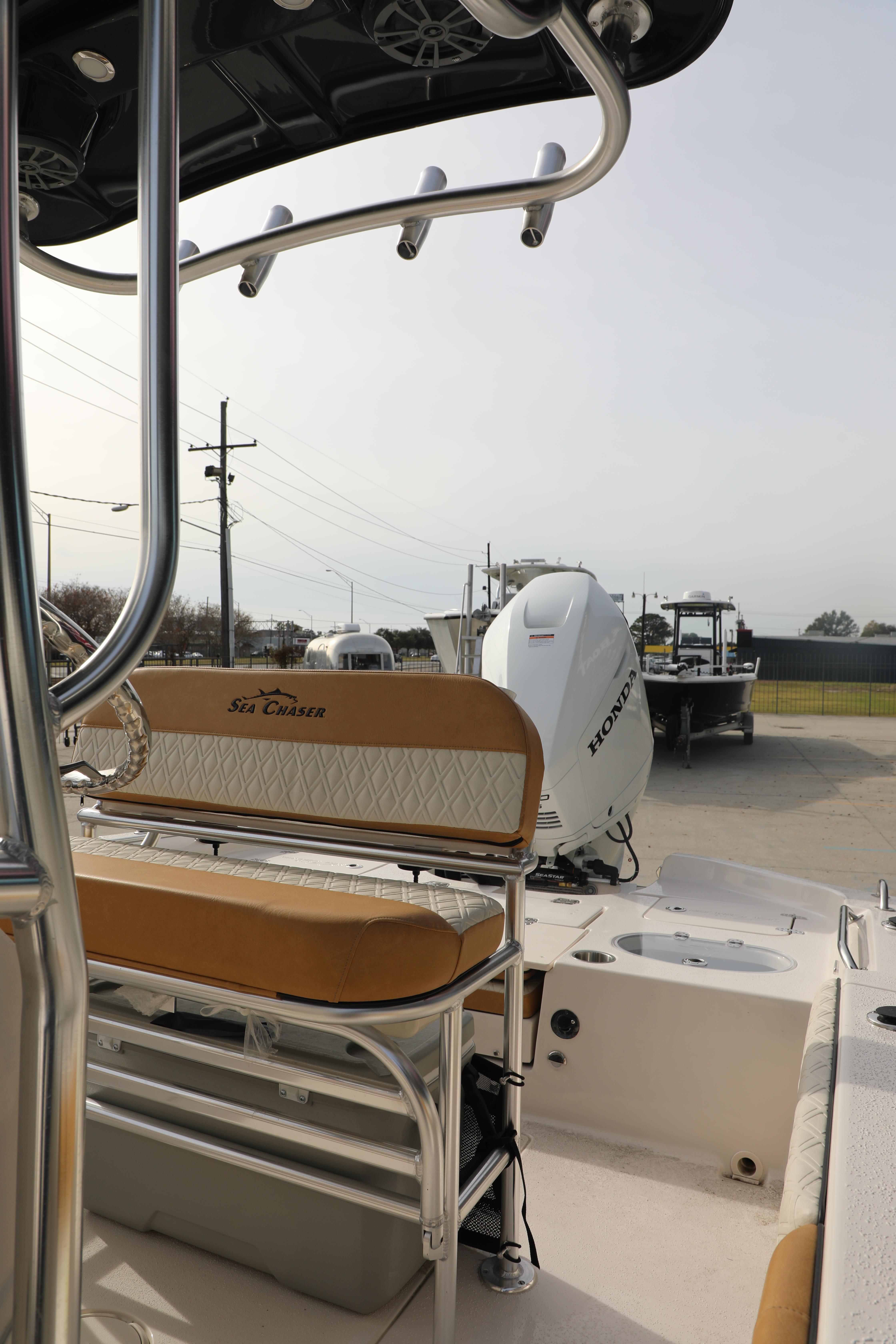 For boaters who love to cruise offshore, in bays, up rivers and around lakes, the multi-use 2026 model year 23 LX Bay Series is the boat to see! The dynamic v-shaped hull design easily navigates a variety of waters with unbeatable performance and handling. The innovative deck design of the 23 LX is self-bailing – keeping you and your passengers drier all day long. Easily fight fish from the raised bow and stern decks, which house large storage compartments for gear and supplies. Under the leaning post, find a removable 70-quart cooler that comes standard with the 23 LX. Throughout the 23 LX, find the highest-quality stainless steel components, including hinges, bow eyes, folding cleats, cup holders and more. A popular upgrade option beloved by families and charter captains on the 23 LX is the flip-up console for a porta potti or electric flushable head. Contact your nearest Sea Chaser dealer today to see the 2026 model year 23 LX Bay Series!