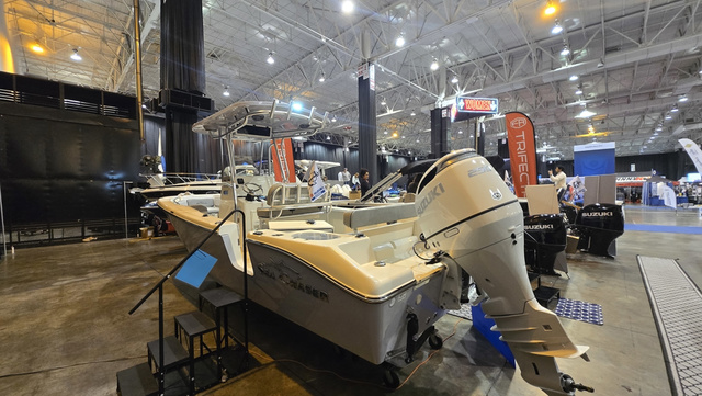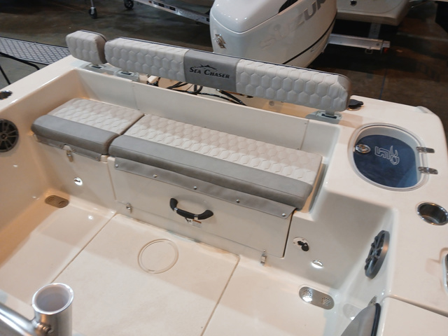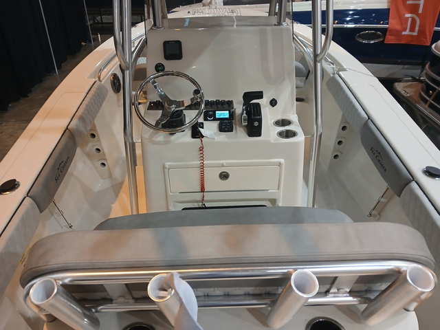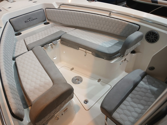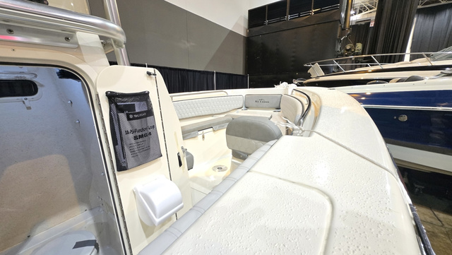 In Stock! 24' T-Top Center Console with side entry door and stepped hull, electric flushing head, trailer and windlass included! Loaded with all lighted compartments, underwater lights, color Matched T-Top includes 4 Speakers 8 total. These boats are built to tackle the unforgiving waters of the Atlantic and find themselves in their element here on the Great Lakes. Whether you're heading offshore for fishing, exploring the coast or pulling a tube for family fun, the 2026 model year 24 HFC checks every box for on-the-water adventure. For boaters who love to raft up and swim, the 24 HFC comes standard with a portside entry door and a stern telescoping ladder for easy and safe access in and out of the water. Throughout the 24 HFC, find only the highest-quality stainless steel components, such as flush-mounted cup holders, rod holders and fold-down cleats.