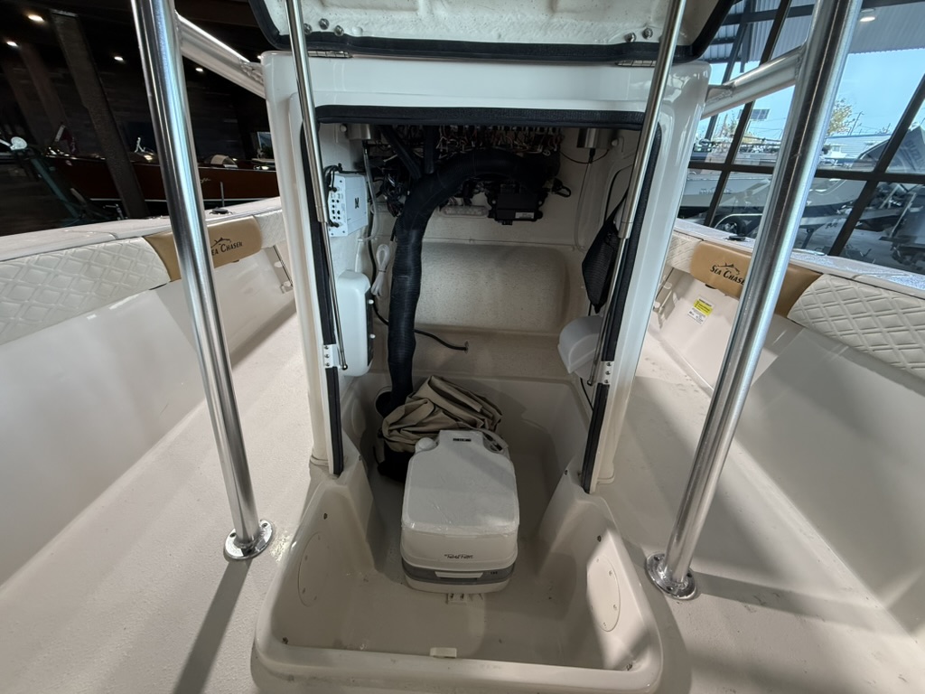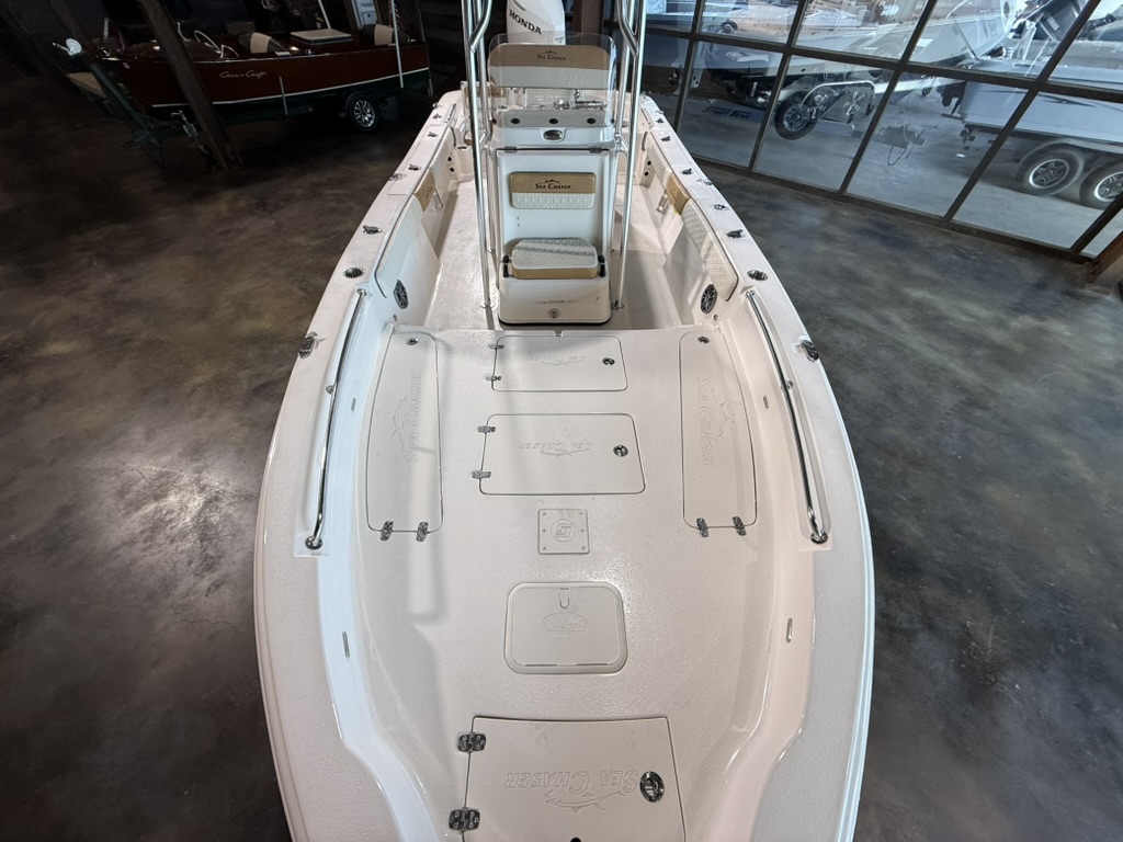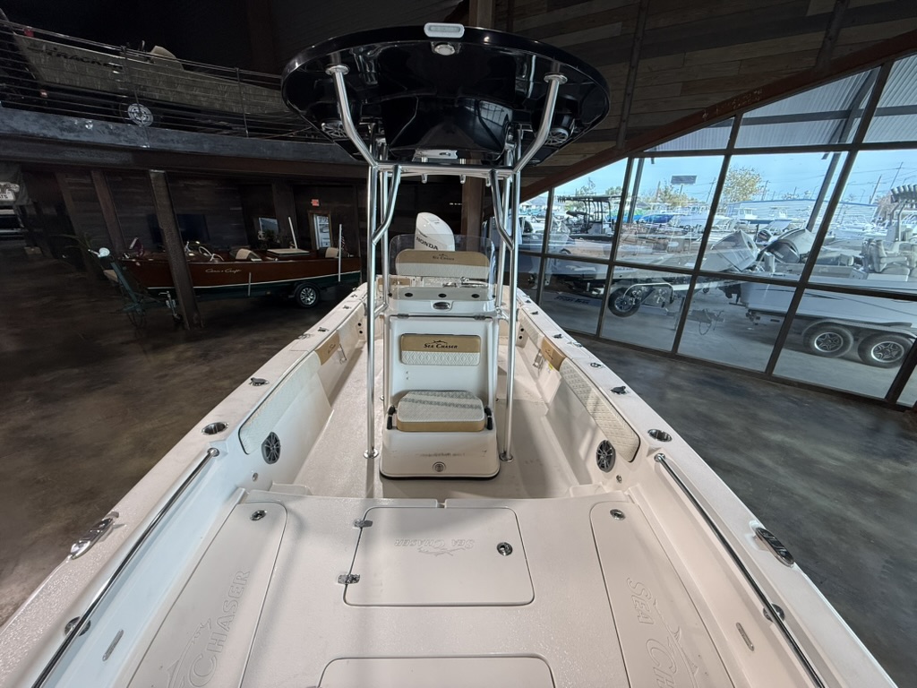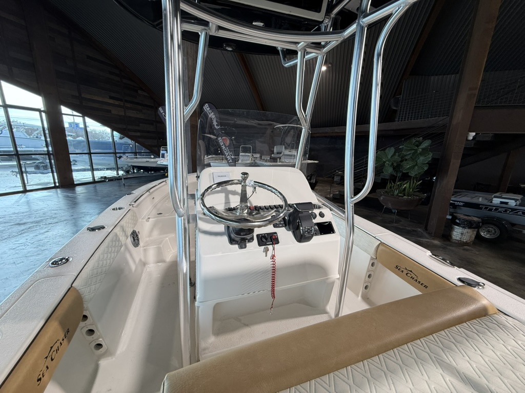 For boaters who love to cruise offshore, in bays, up rivers, and around lakes, the multi-use 2026 model year 26 LX Bay Series is the boat to see! The dynamic V-shaped hull design easily navigates a variety of waters, offering unbeatable performance and handling. The innovative deck design of the 26 LX is self-bailing – keeping you and your passengers drier all day long. Easily fight fish from the raised bow and stern decks, which house large storage compartments for gear and supplies. Under the leaning post, find a removable 70-quart cooler that comes standard with the 26 LX. Throughout the 26 LX, find the highest-quality stainless steel components, including hinges, bow eyes, folding cleats, cup holders, and more. A popular upgrade option beloved by families and charter captains on the 26 LX is the flip-up console for a porta-potti or electric flushable head. Contact your nearest Sea Chaser dealer today to see the 2026 model year 26 LX Bay Series!