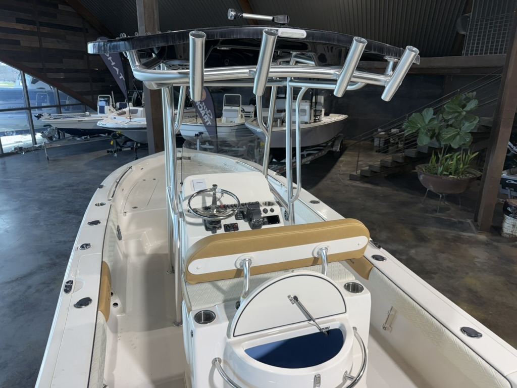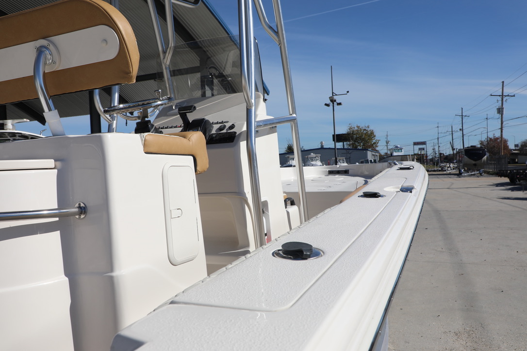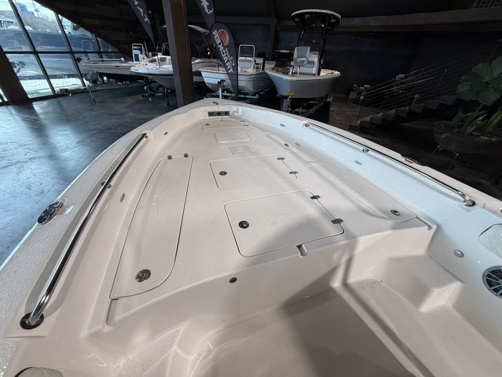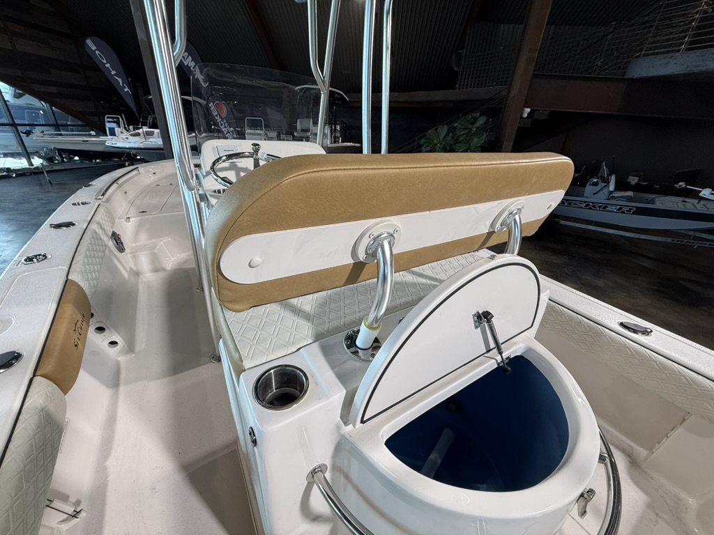 For boaters who love to cruise offshore, in bays, up rivers, and around lakes, the multi-use 2026 model year 26 LX Bay Series is the boat to see! The dynamic V-shaped hull design easily navigates a variety of waters, offering unbeatable performance and handling. The innovative deck design of the 26 LX is self-bailing – keeping you and your passengers drier all day long. Easily fight fish from the raised bow and stern decks, which house large storage compartments for gear and supplies. Under the leaning post, find a removable 70-quart cooler that comes standard with the 26 LX. Throughout the 26 LX, find the highest-quality stainless steel components, including hinges, bow eyes, folding cleats, cup holders, and more. A popular upgrade option beloved by families and charter captains on the 26 LX is the flip-up console for a porta-potti or electric flushable head. Contact your nearest Sea Chaser dealer today to see the 2026 model year 26 LX Bay Series!