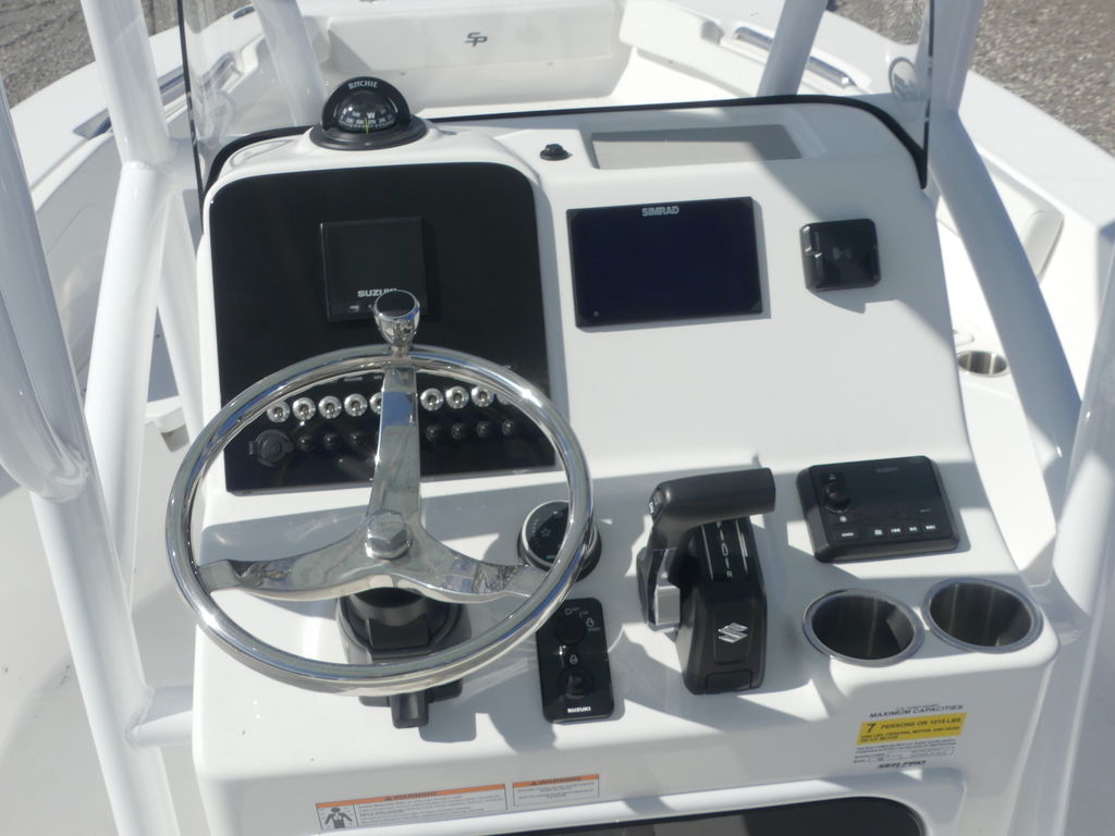 The helm is thoughtfully laid out for comfort and control. Premium seating, power steering with tilt helm, digital switch panels, and a multifunction display keep critical functions within easy reach. A fiberglass hard top provides shade and shelter, making longer days on the water more enjoyable for everyone aboard.