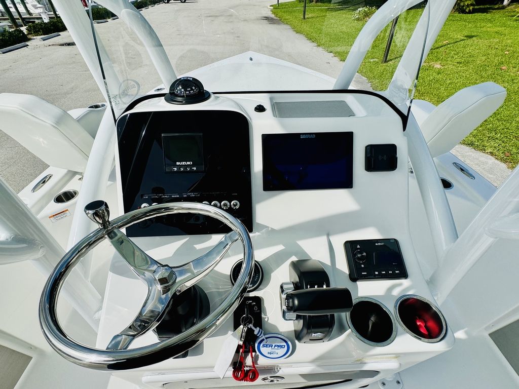 -Premium audio system (Audison Marine Audio), dual USB/12 V outlets, wireless phone charger/holder, compass and Sea Pro Connect App for remote monitoring of battery/bilge/location.