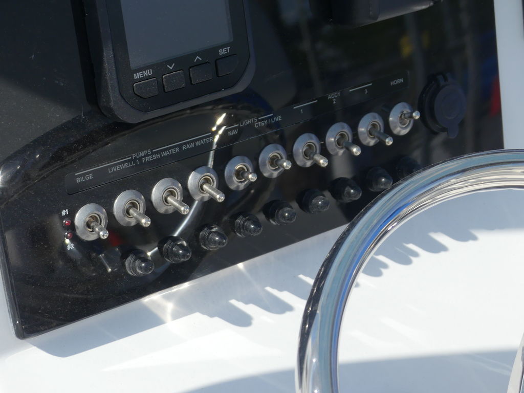 The helm is thoughtfully designed with both comfort and capability in mind. Premium captain’s seating, power steering with a tilt helm, digital switching, and an integrated multifunction display keep everything you need within easy reach. A durable fiberglass hard top provides shade and shelter, so you can stay out on the water longer in comfort.