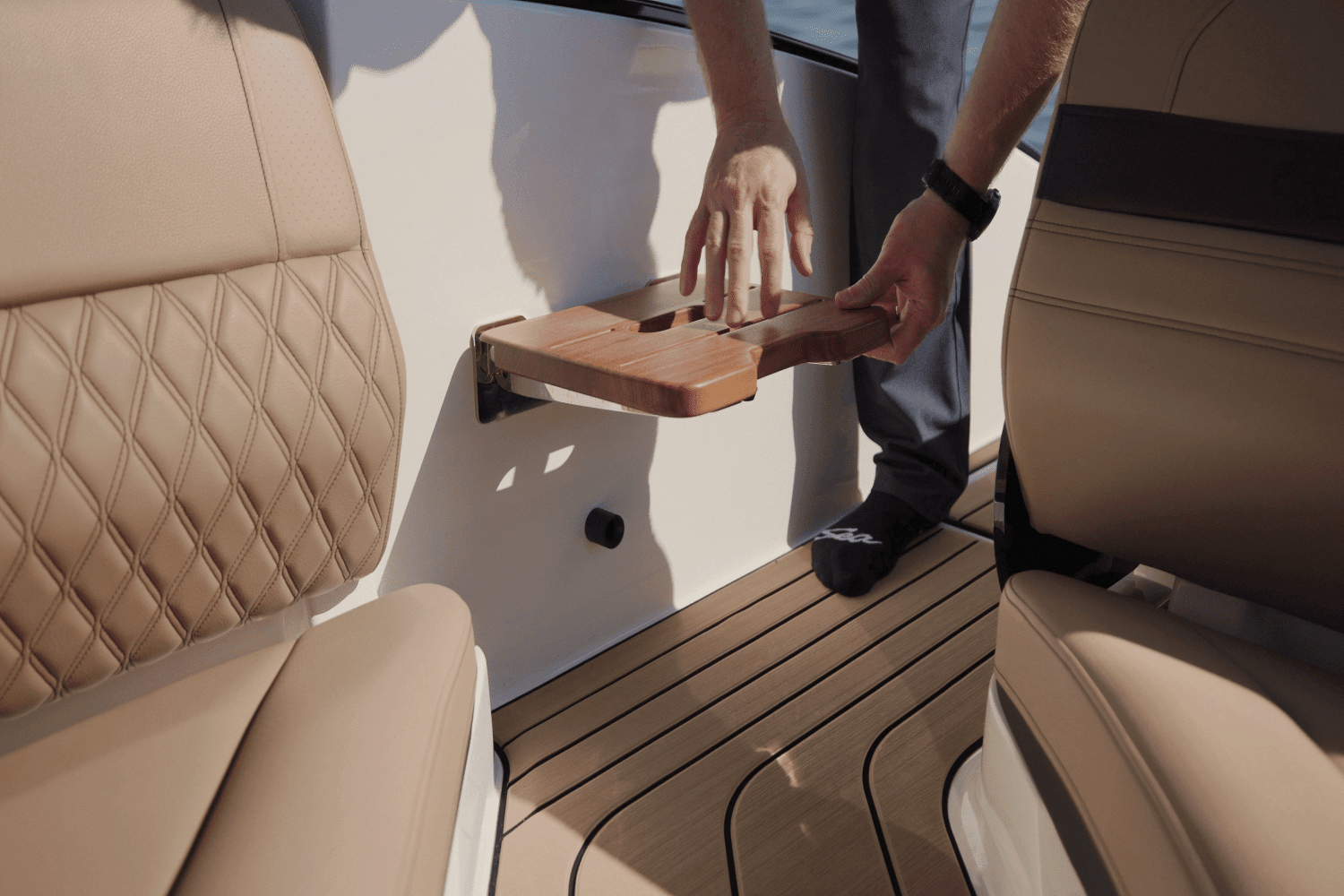 The Ride of a Lifetime - The SLX 280's interior is designed for optimal space, comfort, and functionality. It features deep ergonomic seating, integrated storage areas, and a transom locker and floor compartment for gear. The transom sunpad includes an integrated cooler, and the broad swim platform with an optional submersible step allows easy water access.