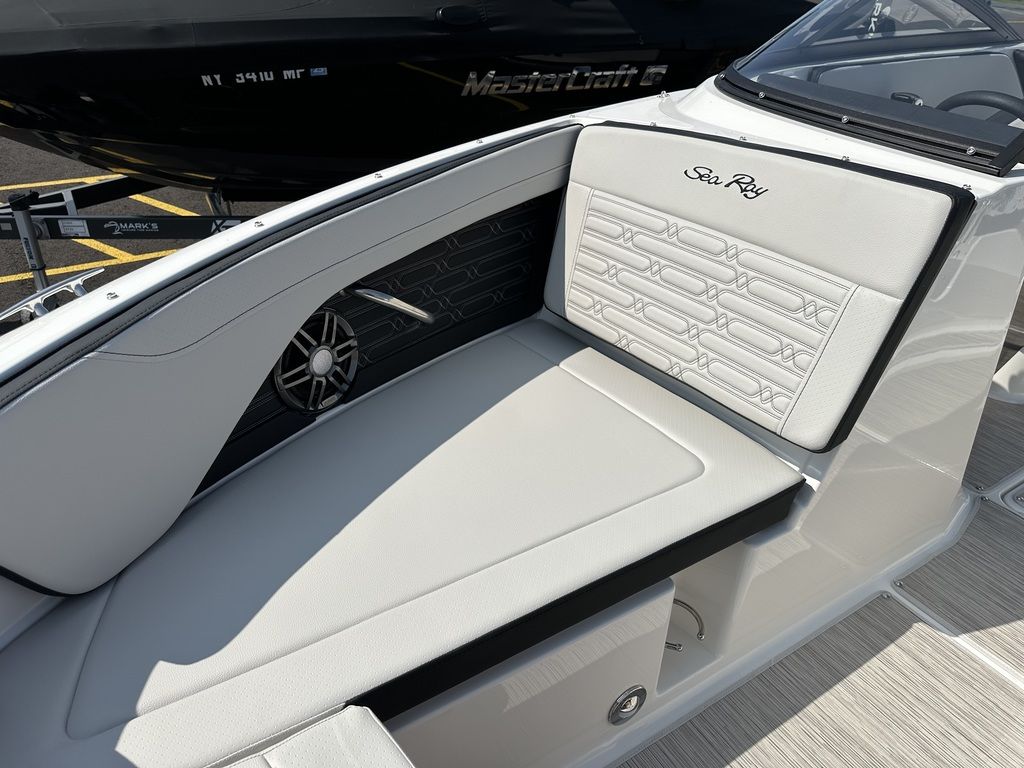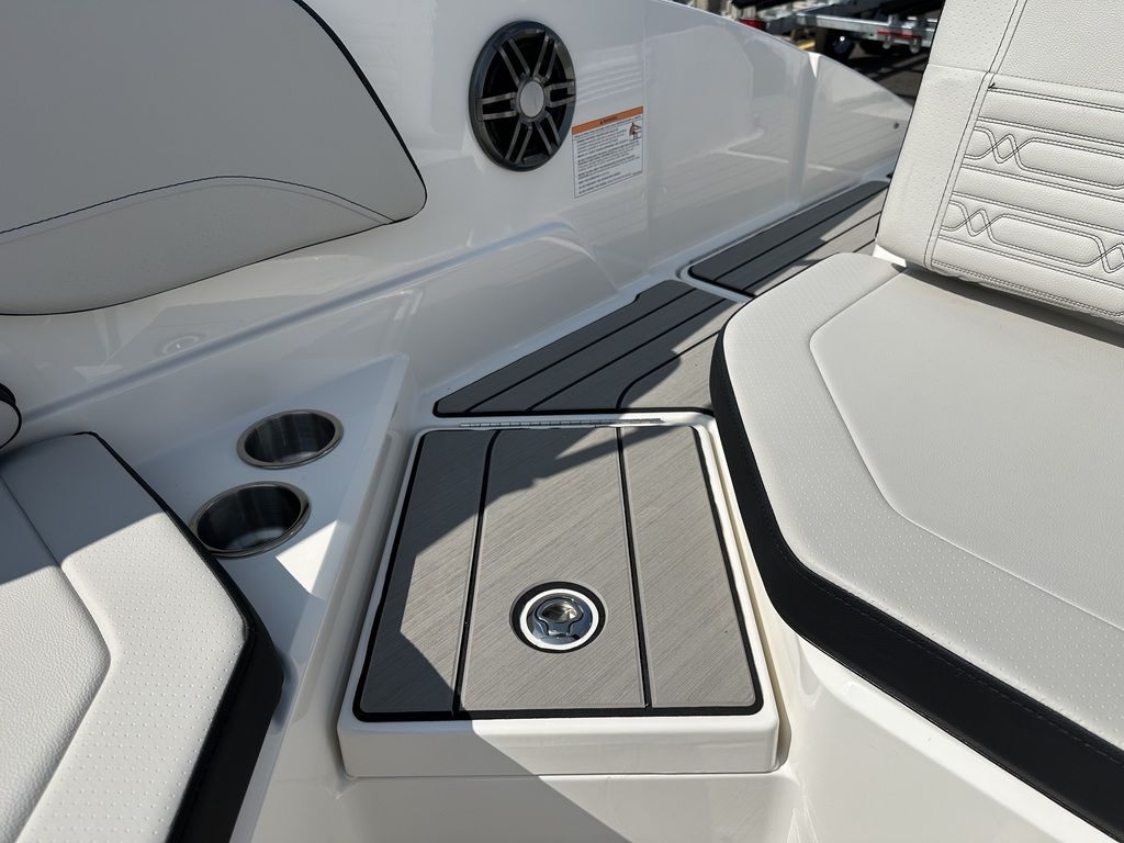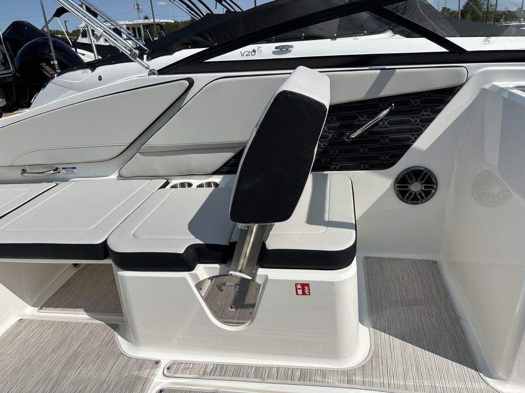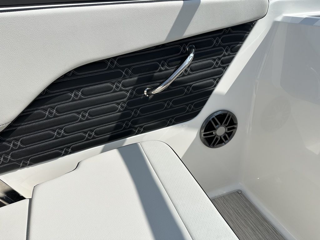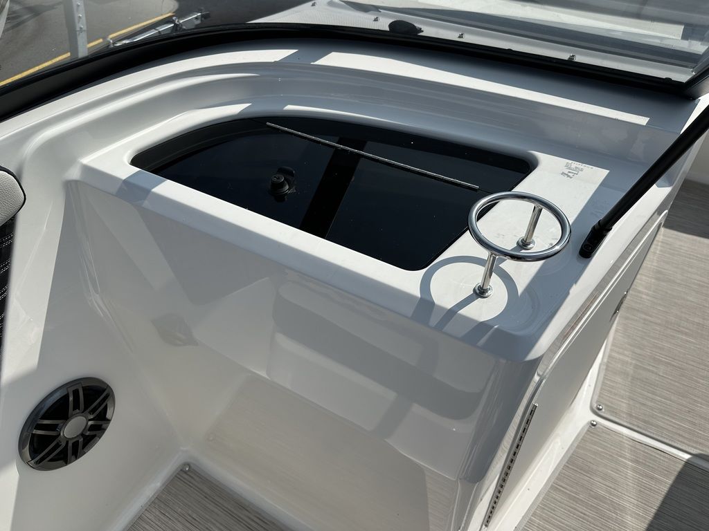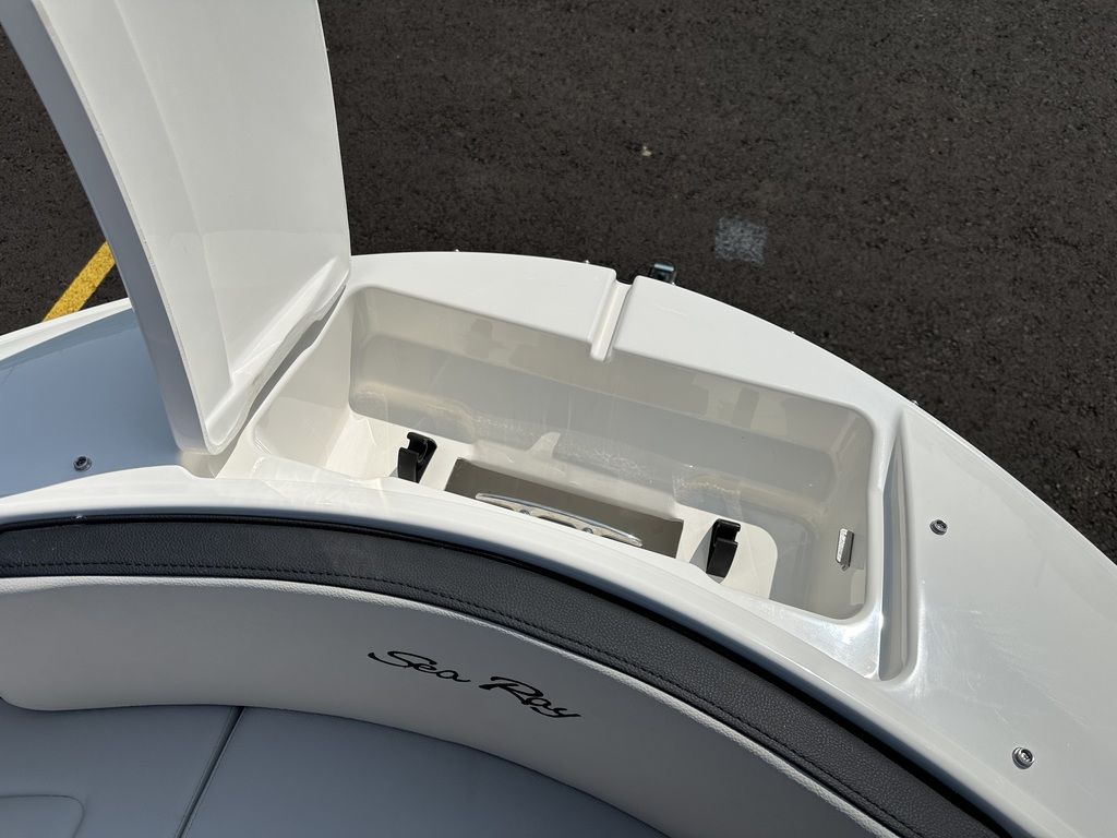 GO BEYOND BASICSThere are more than enough spaces and amenities aboard the SPX 210 Outboard to keep guests entertained all day. The self-bailing cockpit includes comfortable seating with an L-shaped bench, a convertible port companion seat that transforms into a lounger, a premium Fusion® SRX400 stereo system, and cooler storage. The broad bow offers room to stretch out, and the transom sunpad with a supportive backrest provides a lovely spot to lounge near the water. For added convenience, a port-side compartment can be used for storage or upgraded to a head for extended cruising.