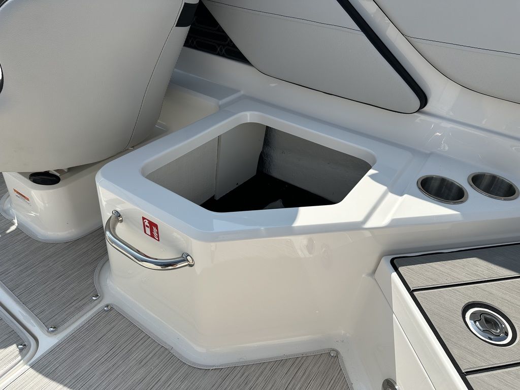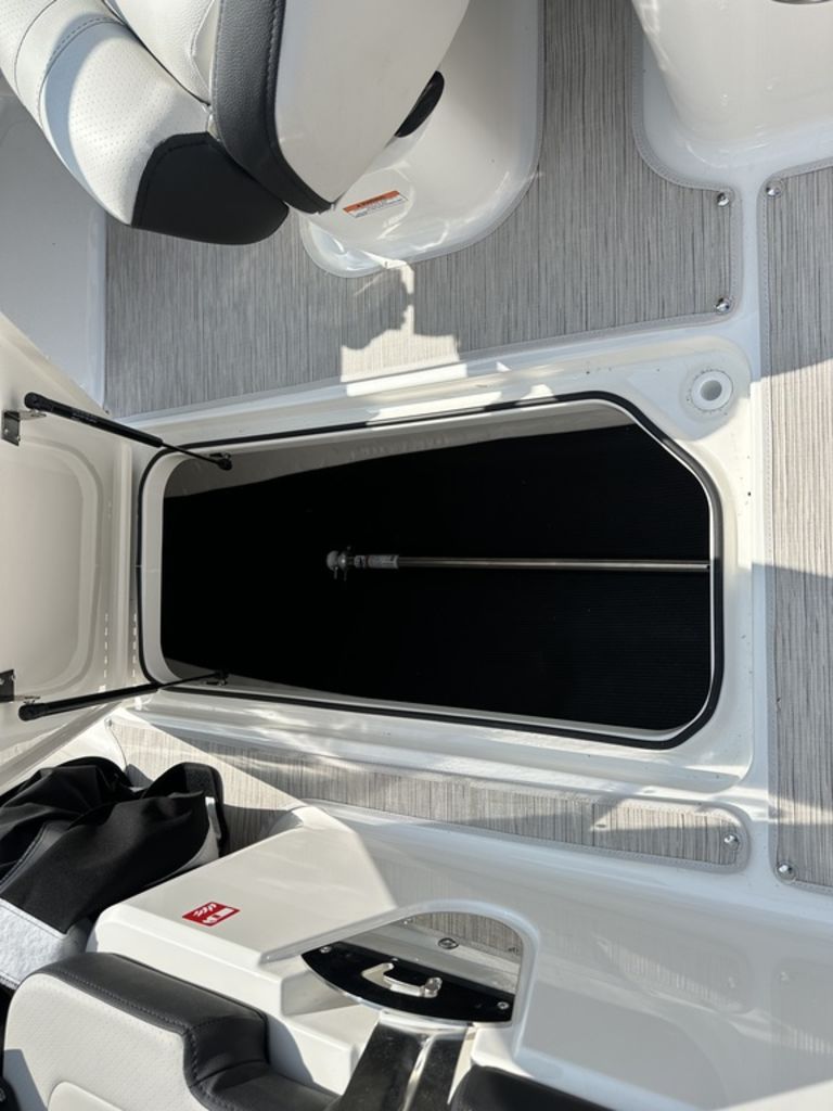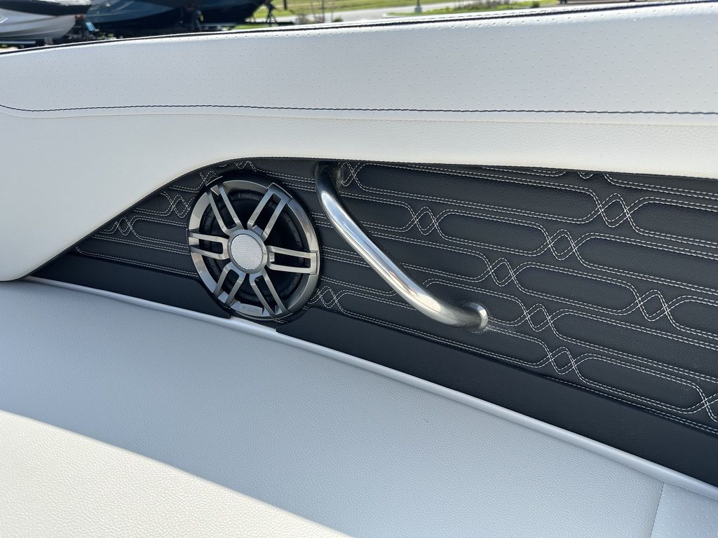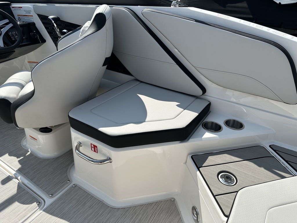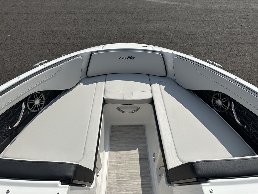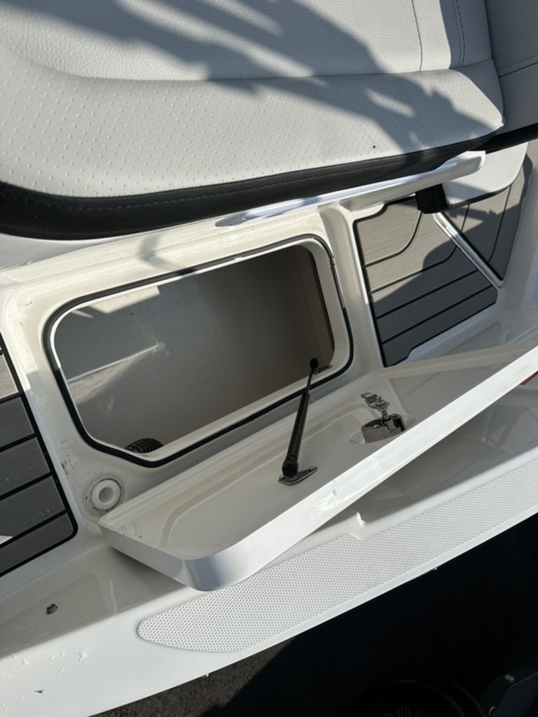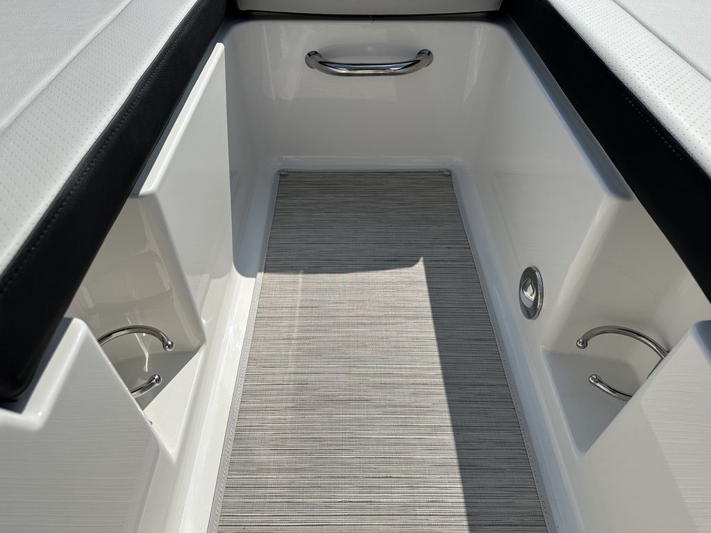 GO BEYOND BASICSThere are more than enough spaces and amenities aboard the SPX 210 Outboard to keep guests entertained all day. The self-bailing cockpit includes comfortable seating with an L-shaped bench, a convertible port companion seat that transforms into a lounger, a premium Fusion® SRX400 stereo system, and cooler storage. The broad bow offers room to stretch out, and the transom sunpad with a supportive backrest provides a lovely spot to lounge near the water. For added convenience, a port-side compartment can be used for storage or upgraded to a head for extended cruising.