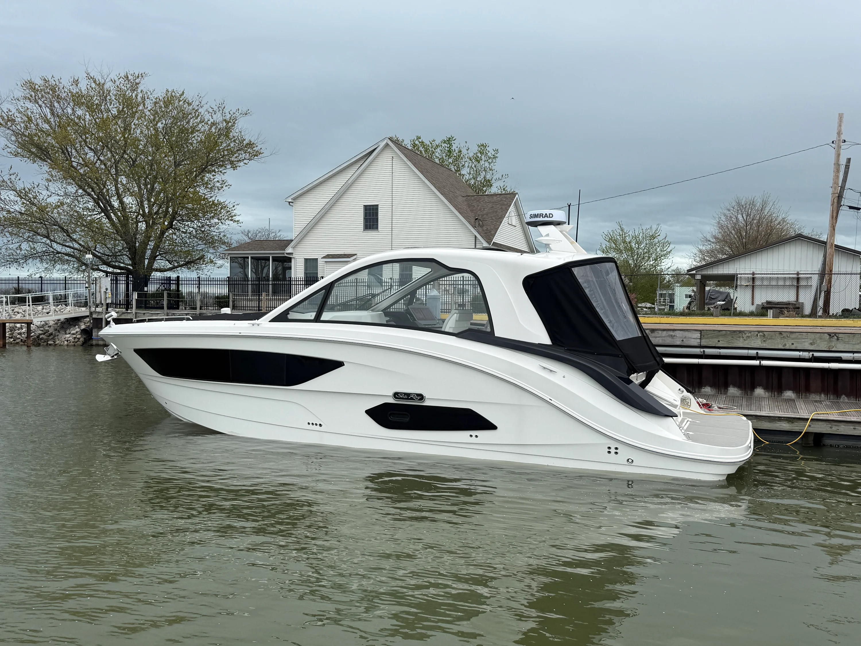 Fully equipped galley with microwave, refrigerator, and sink. Entertainment and Relaxation: Swim platform with optional automated undermount submersible step for easy water access.