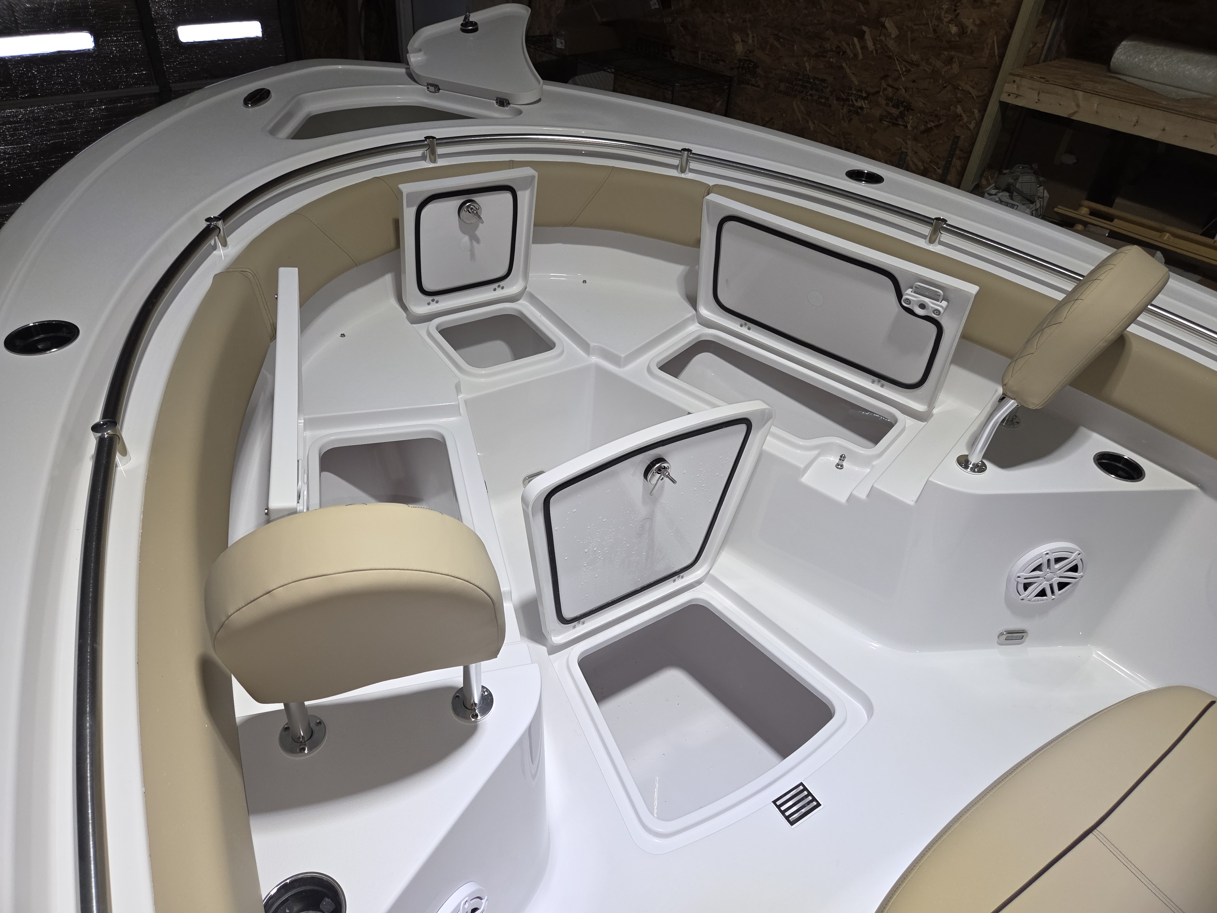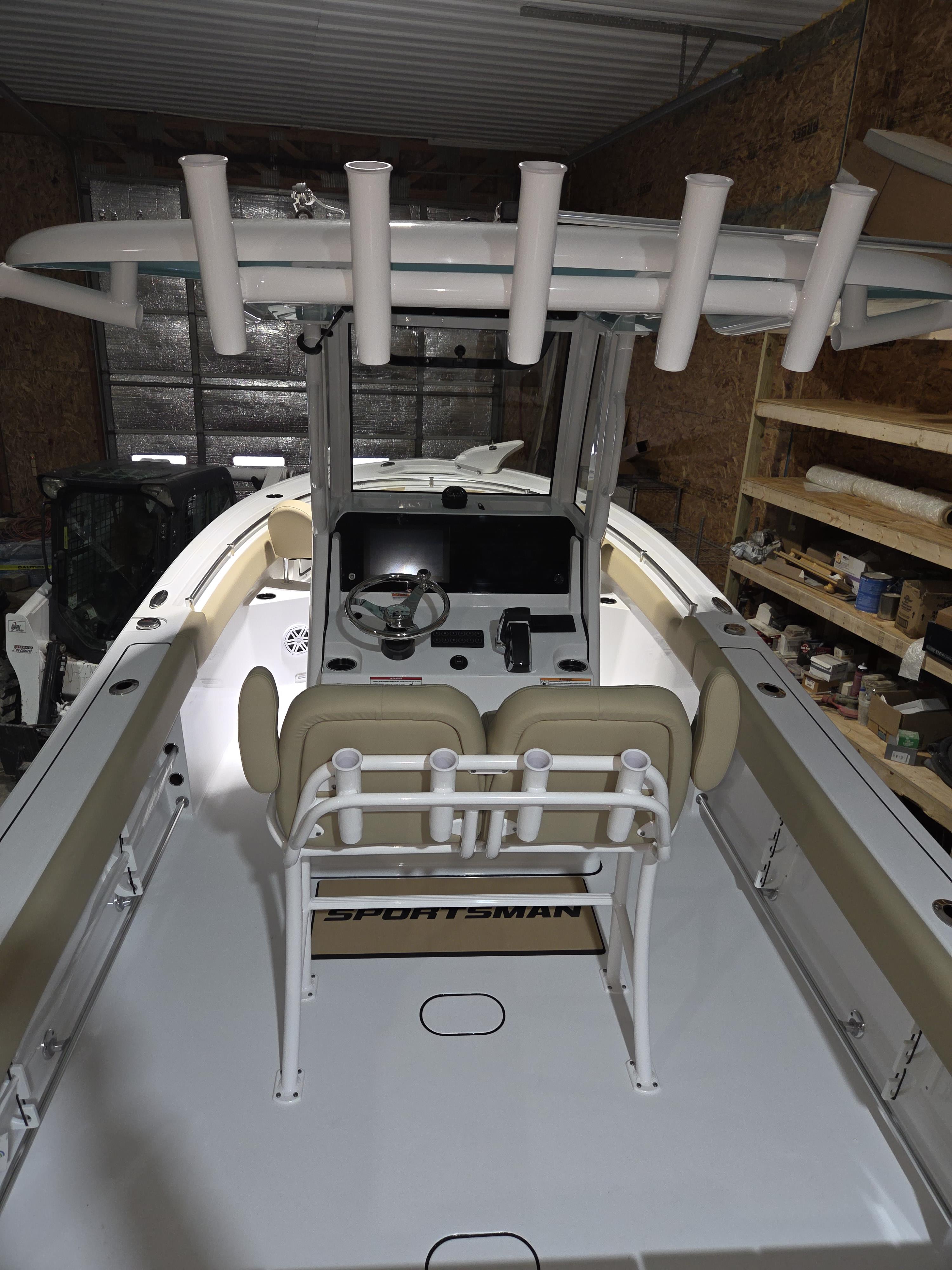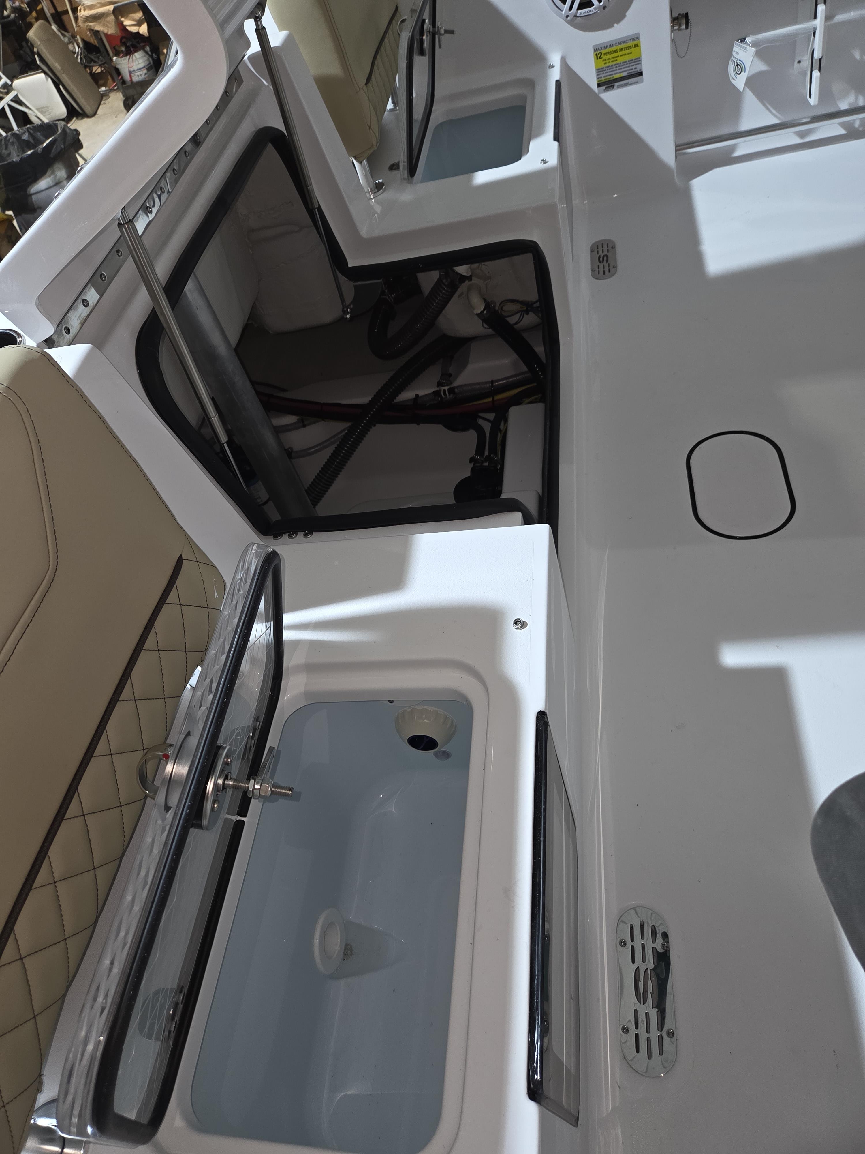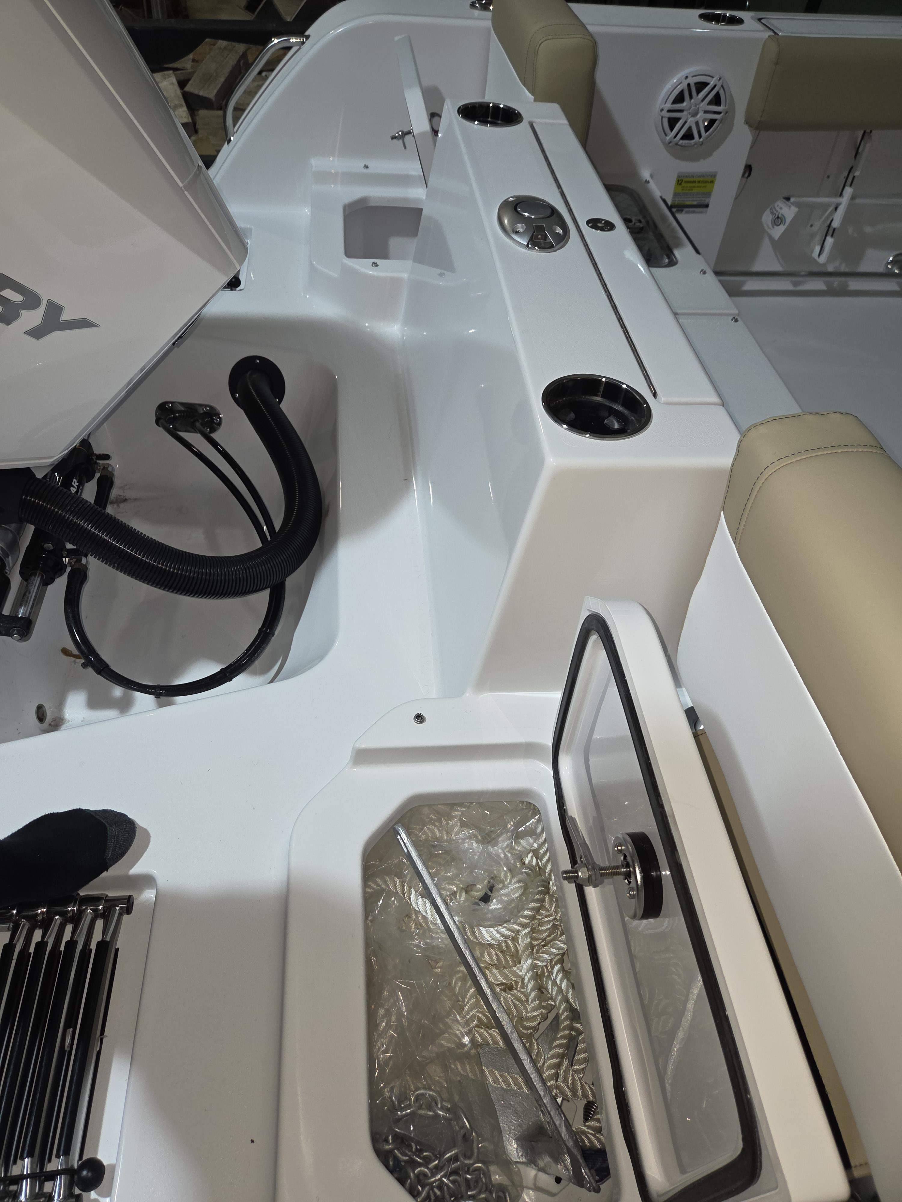 Fishing Amenities: Dual 10-gallon aft aquarium livewells, insulated bow storage, and under-gunwale rod racks.