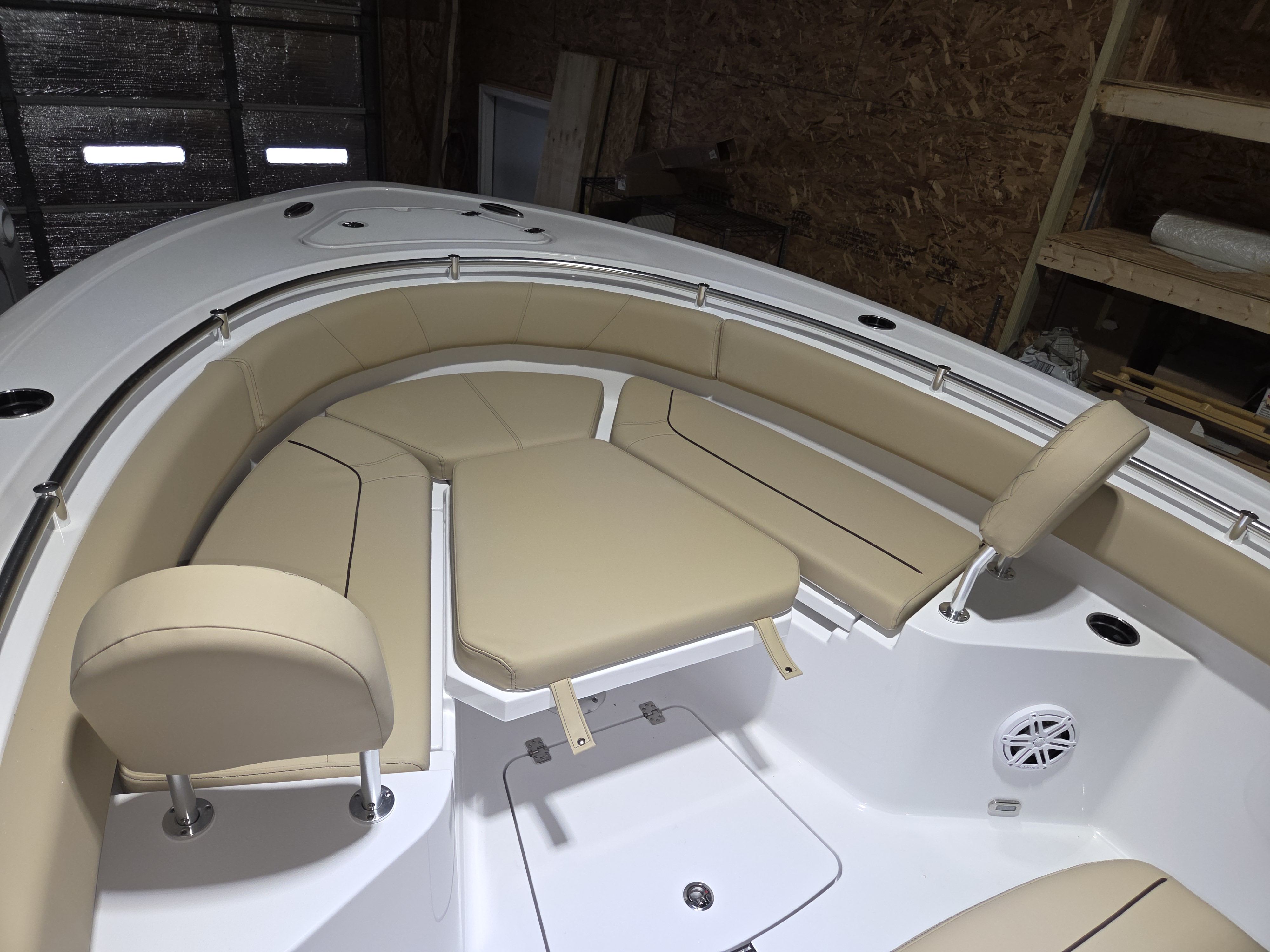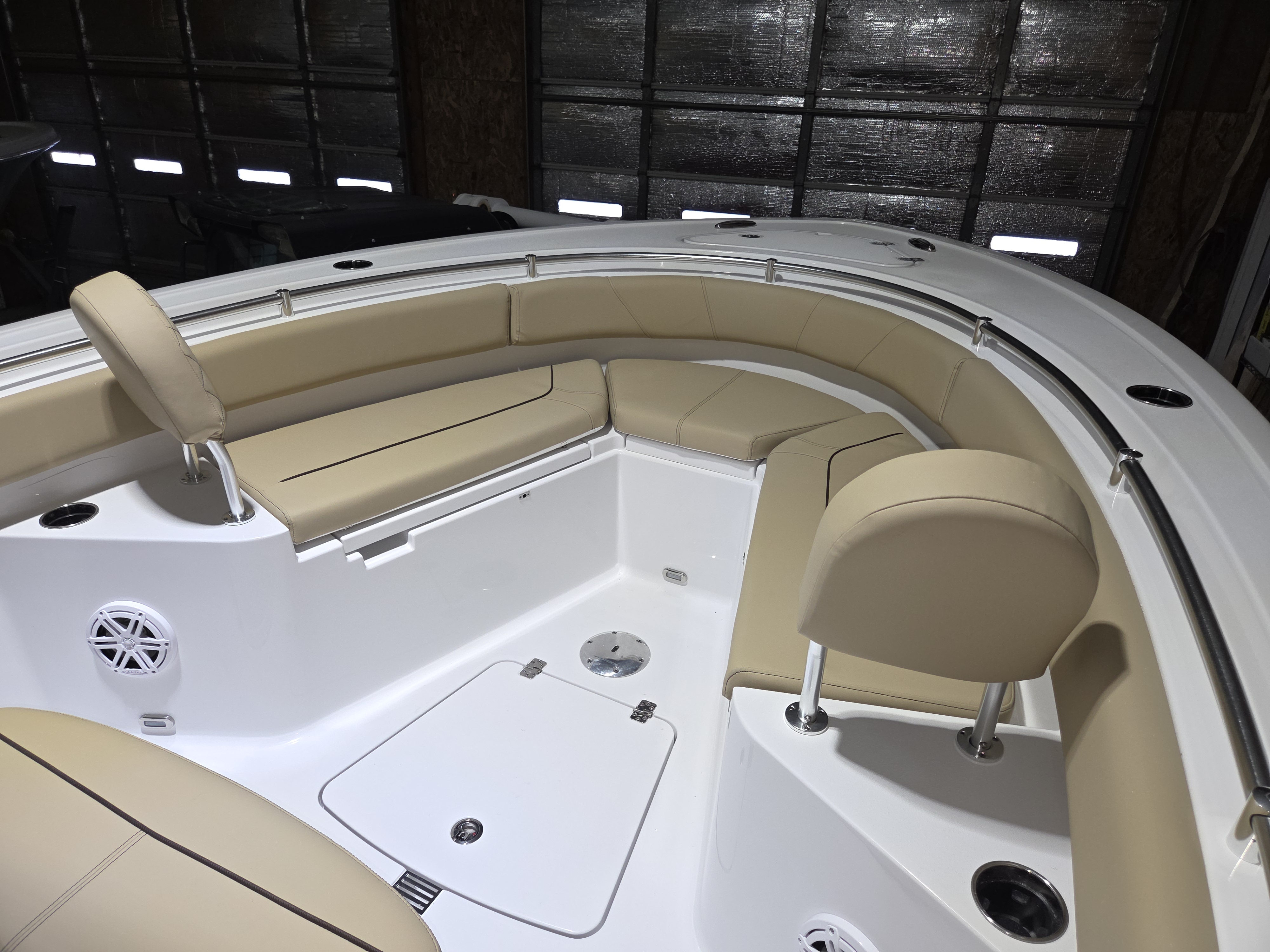 Luxury Seating: Features Serenity Sileather Coastal Beige Upholstery, a premium dual-chair leaning post with flip-up bolsters, and a full bow cushion set with a sundeck.