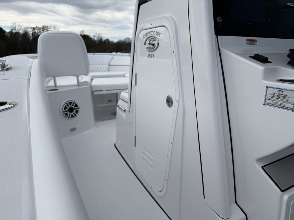 The Heritage 261 defines a new class of family-focused water-centric all-fun boats. Whether you like spending time on the water, in the water or around the water, the all-new Heritage 261 has you covered. The water-centric views in sandbar mode will captivate your heart and is guaranteed to produce some incredible family memories for years to come. The layout includes deep U-Shaped seating at the bow with an electronically actuated table, edge-to-edge seating at the back for up to 5, dual side entry doors that open 180-degrees, dual transom walkthrough doors that flip to offer aft-facing seating, sandbar cooler accessible from outside the boat, dual boarding ladders, swiveling captain's chairs and so much more. Walking through the features on this boat will have you thinking "they thought of everything."