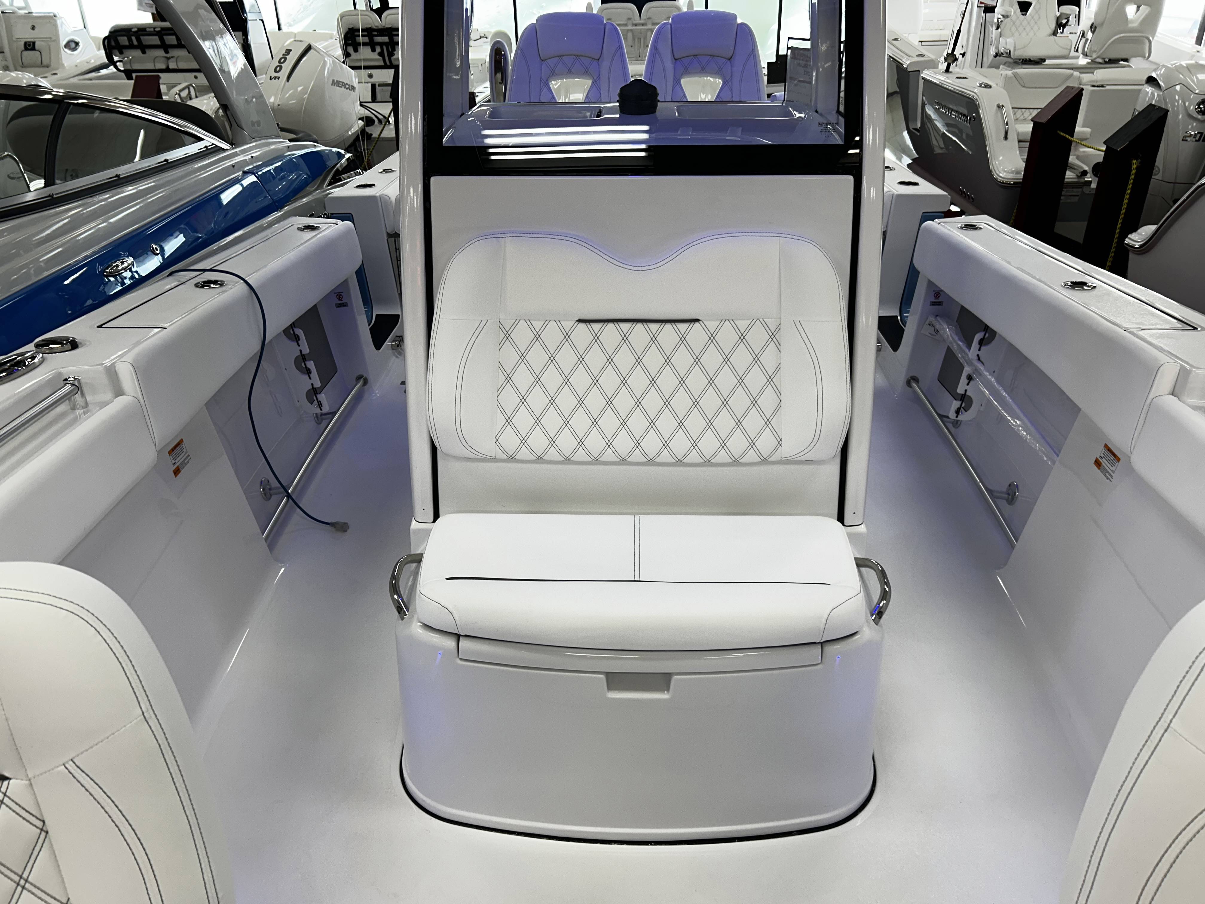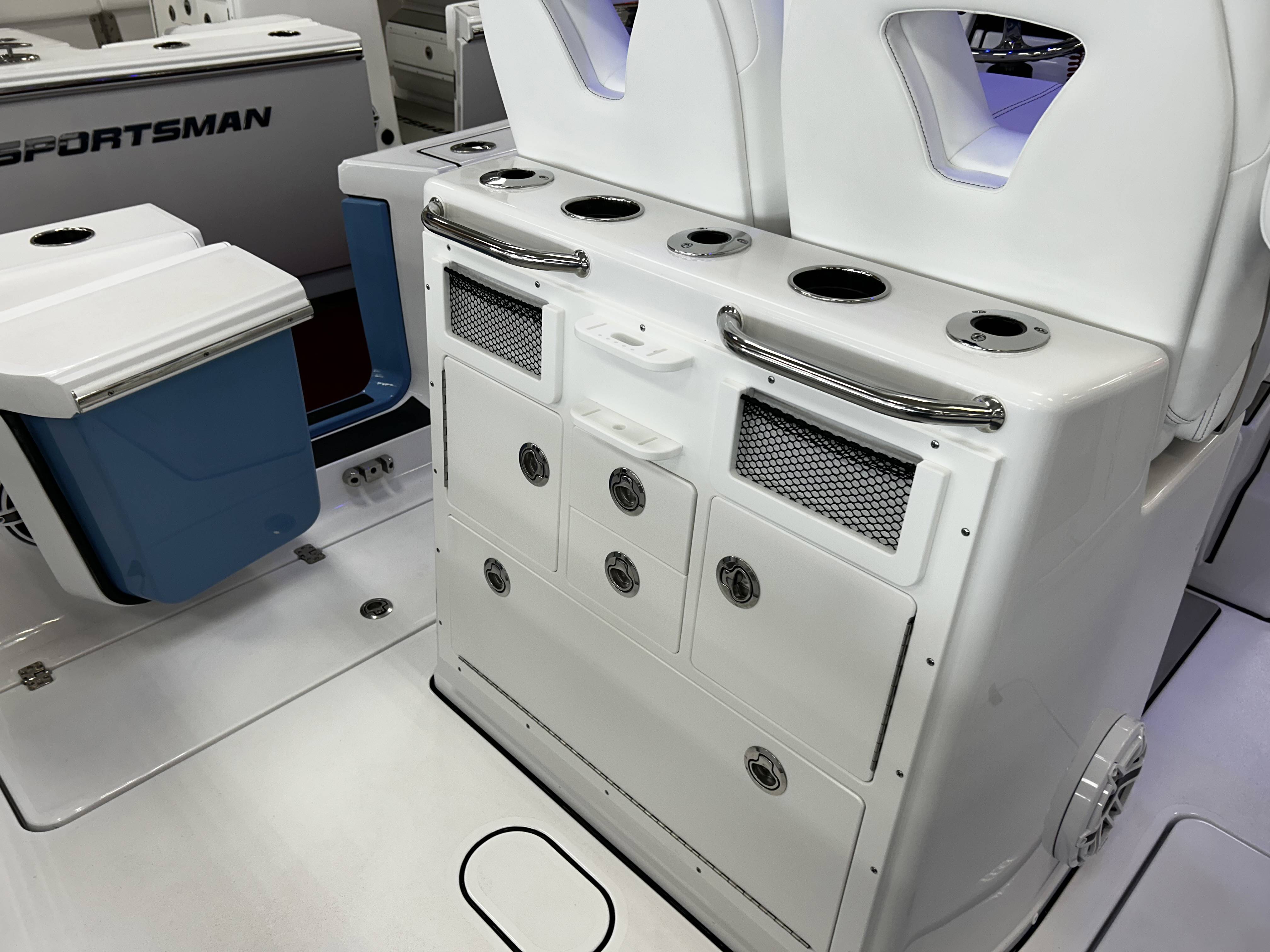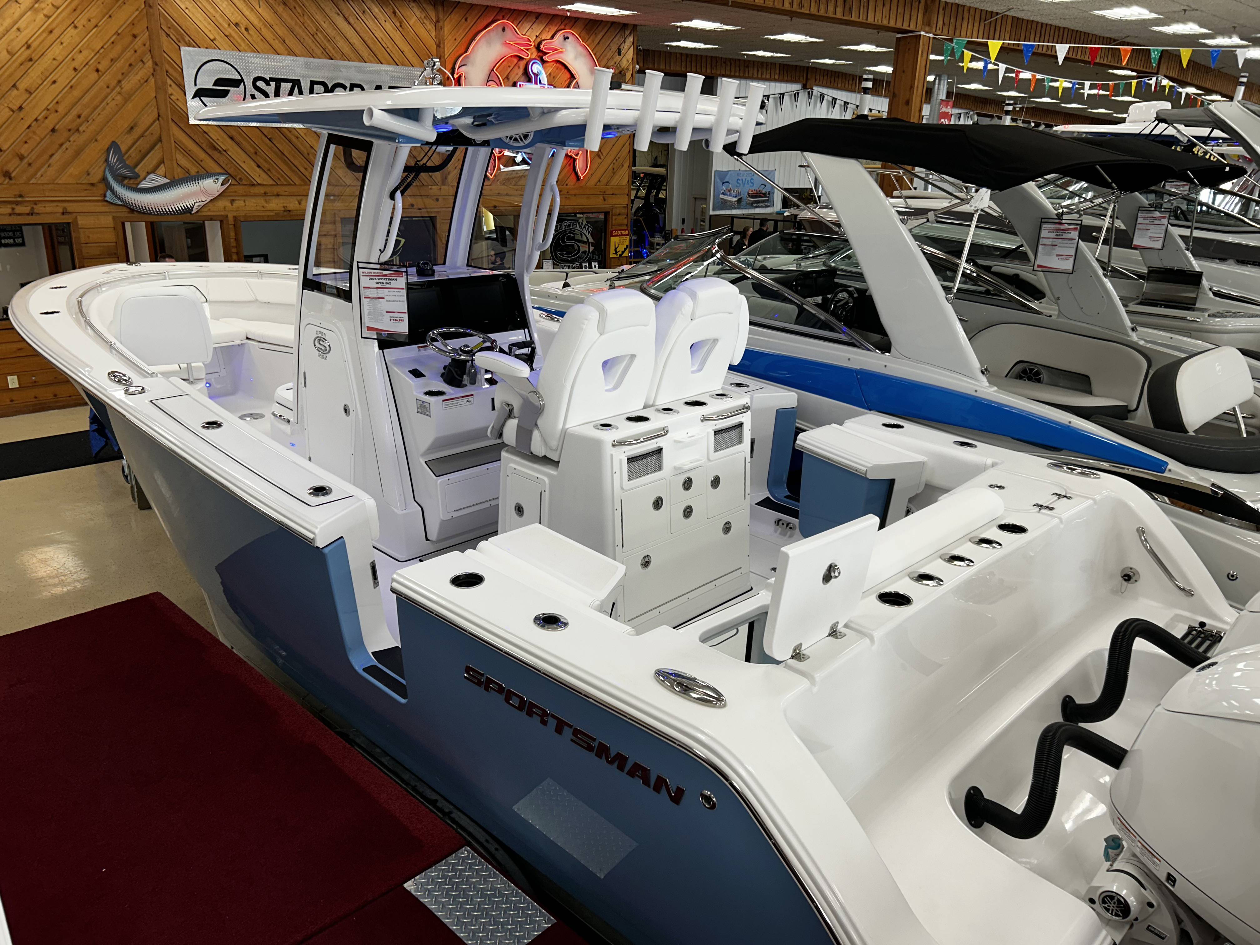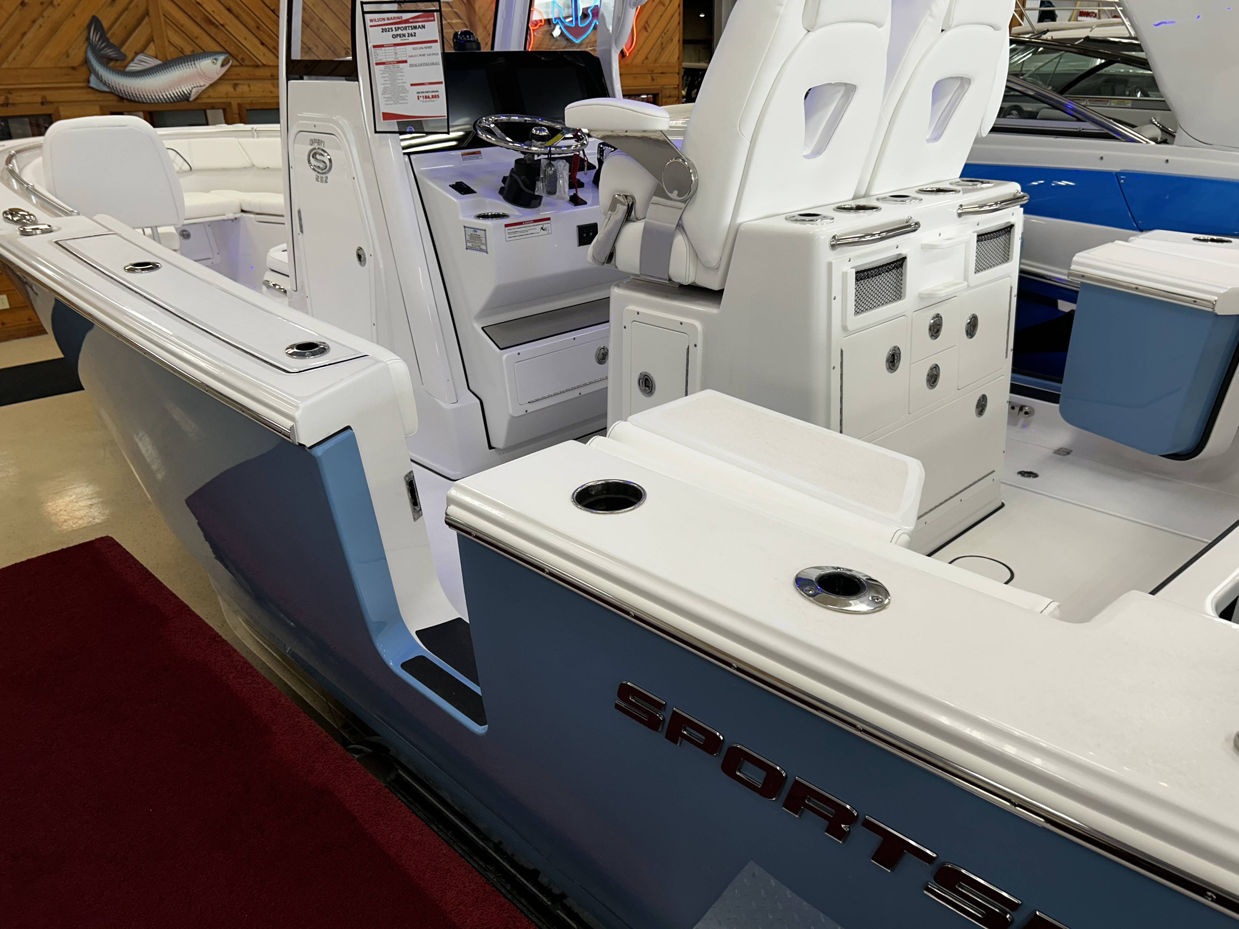2026 Sportsman Open 262 powered by Yamaha twin F200s!Factory Installed Options:Exterior- harbor haze blueInterior- serenity sileather icecap whiteFiberglass console and cooler seatFiberglass hard top with LED lightingHard top underside color- harbor haze blueWhite powder coatingFiberglass leaning post with dual premium chairs and tackle box2- Garmin 12" GPS screens with built in WIFIEdson 13SS comfort grip steering wheel with power knobPromariner Protournament Elite 4 bank battery chargerTrolling motor plug, harness & adapterRemovable table with bow mount