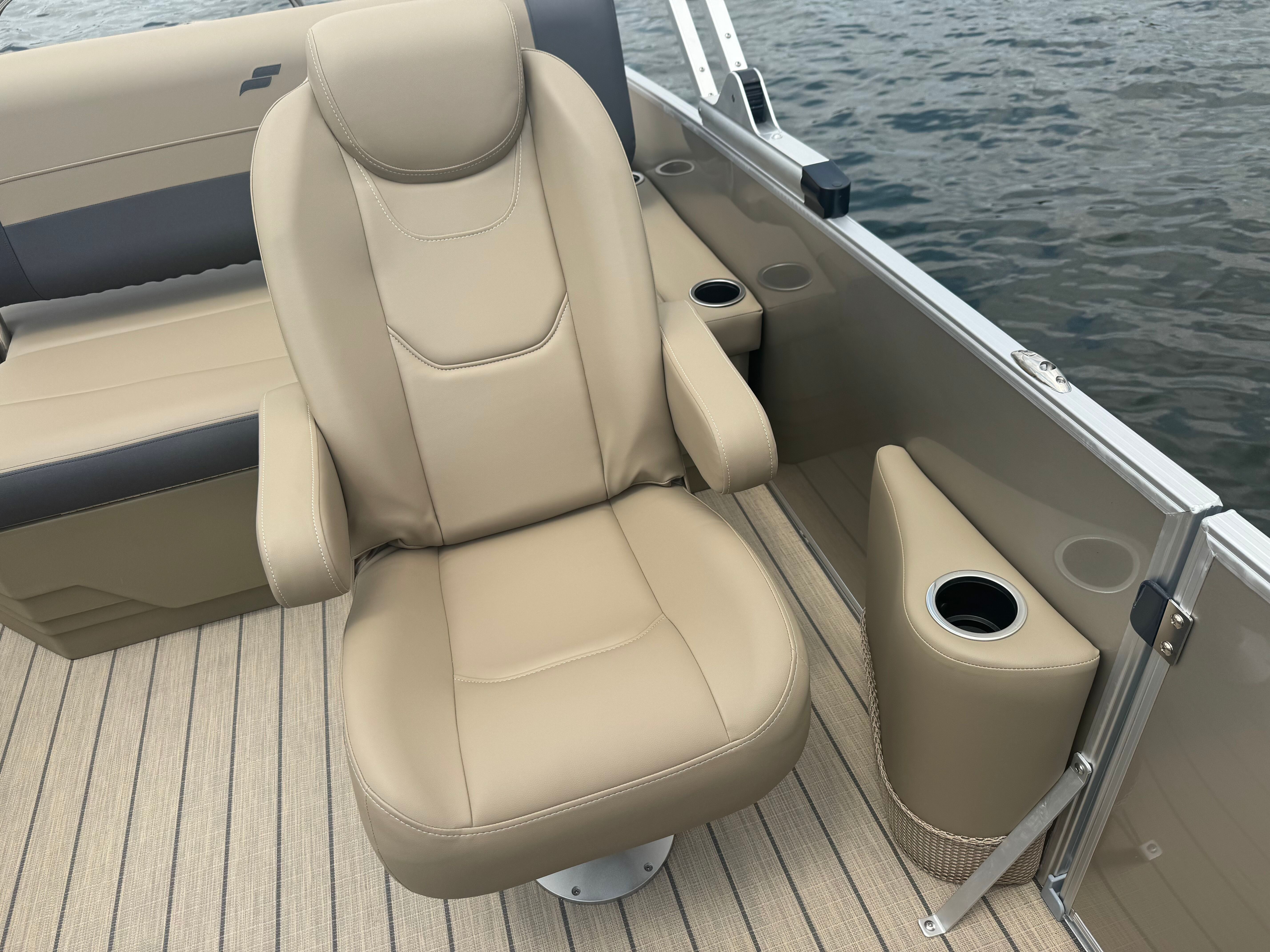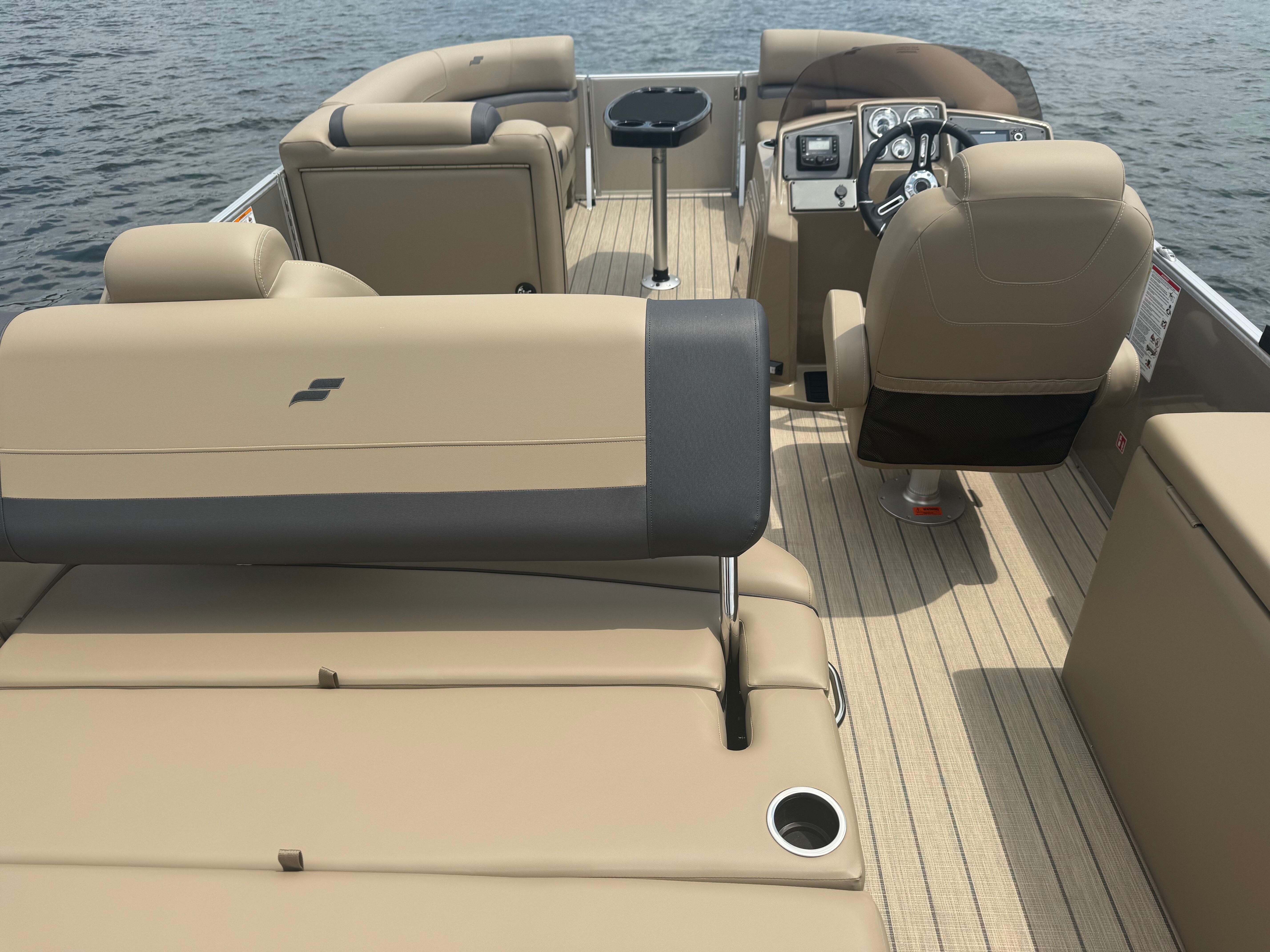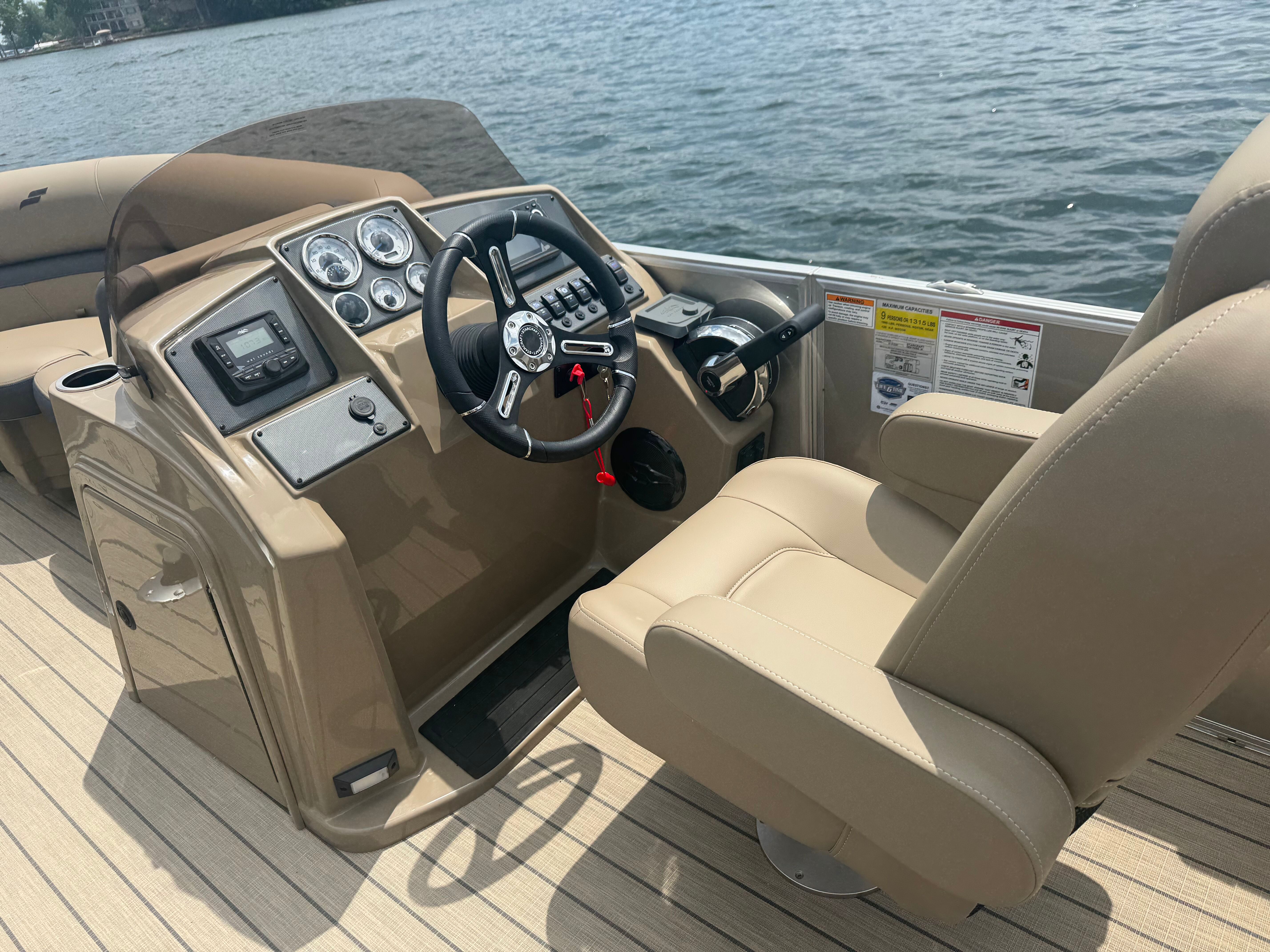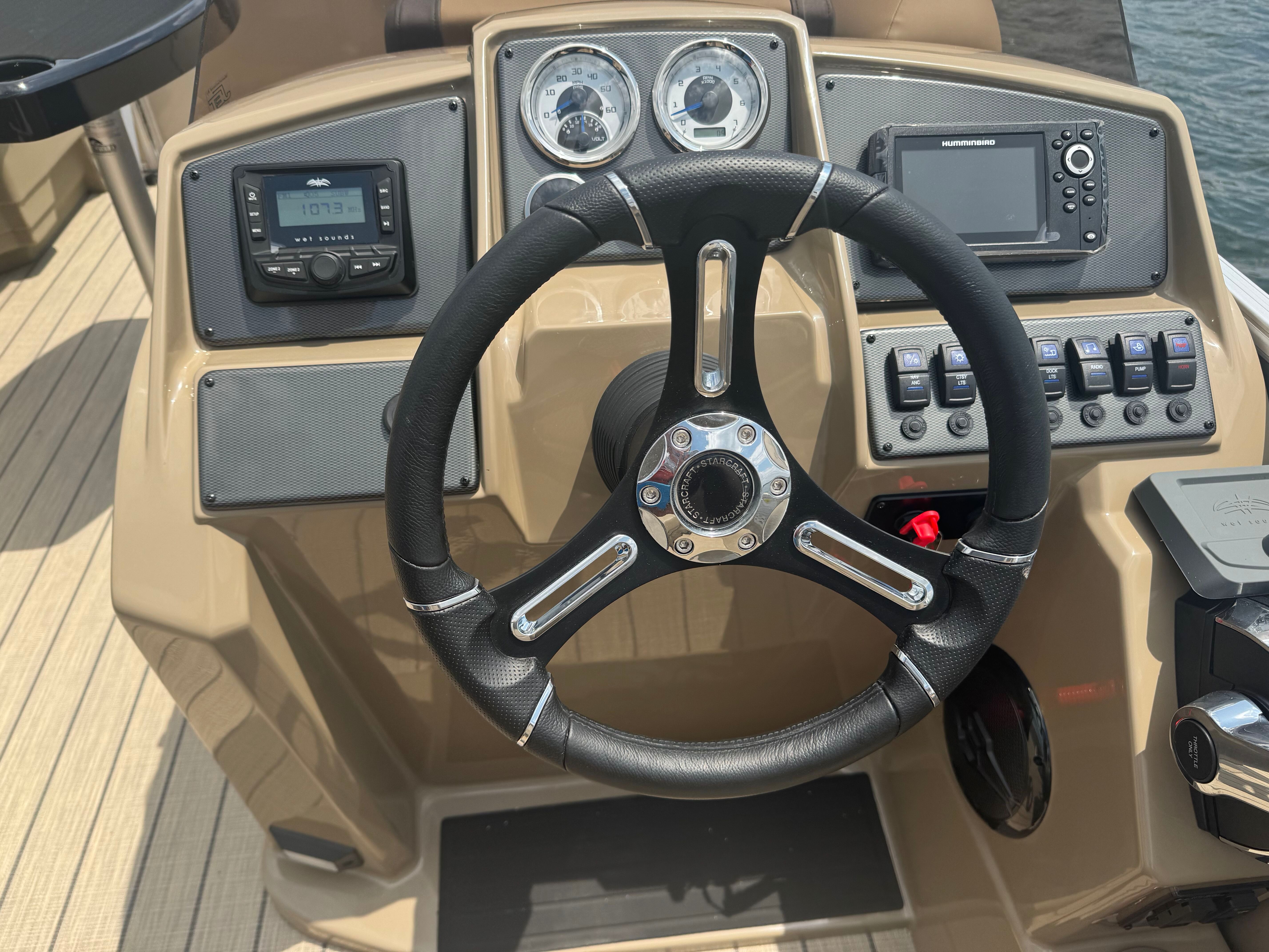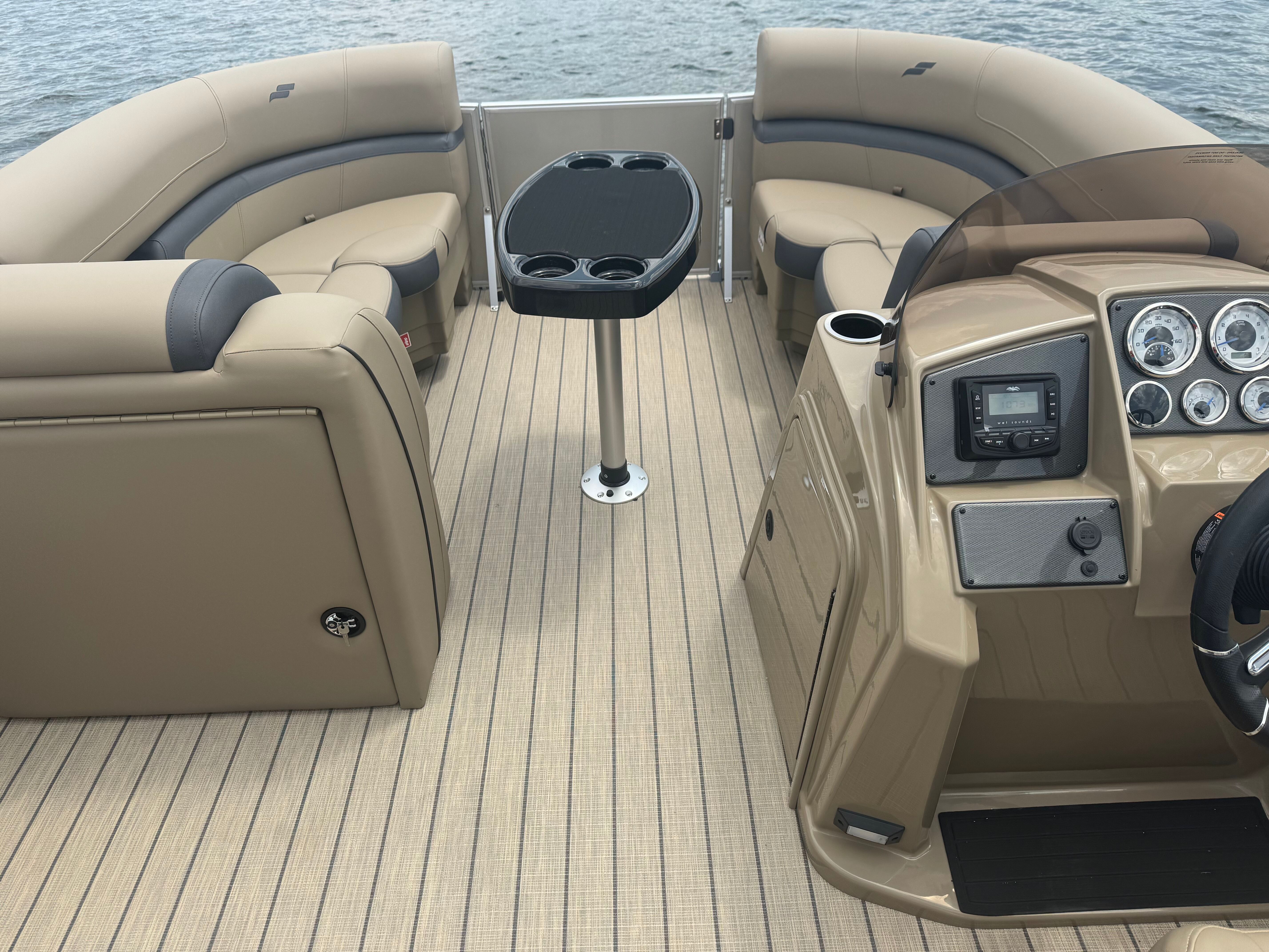 Stern rail enclosure. High back helm chair. Hydraulic steering. Mood lights. Helix 5. Teak weave. Upgraded power bimini top. Depth gauge. Trim gauge. Tach w/hour meter. Fuel/water filter. Ski tow bar. Performance strakes and shield. Mercury 115HP PRO XS 4S CT EFI