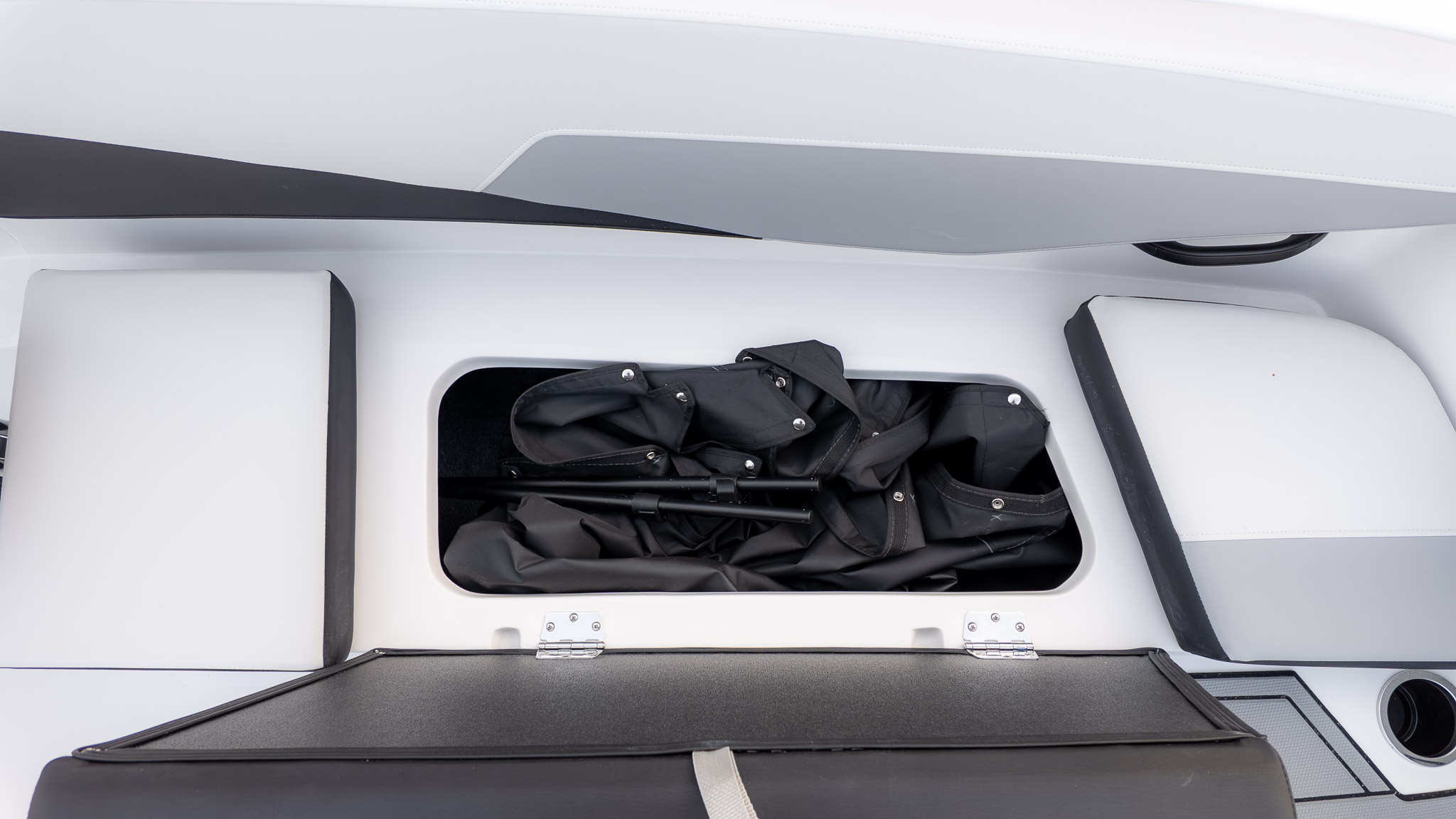 Thoughtful touches throughout give it a more refined feel than you’d expect in this size class. Comfortable seating, smart storage, and an intuitive helm make long days feel effortless. Add in a quality stereo system and shaded comfort under the bimini, and it quickly becomes the go-to platform for music-filled afternoons and sunset rides.