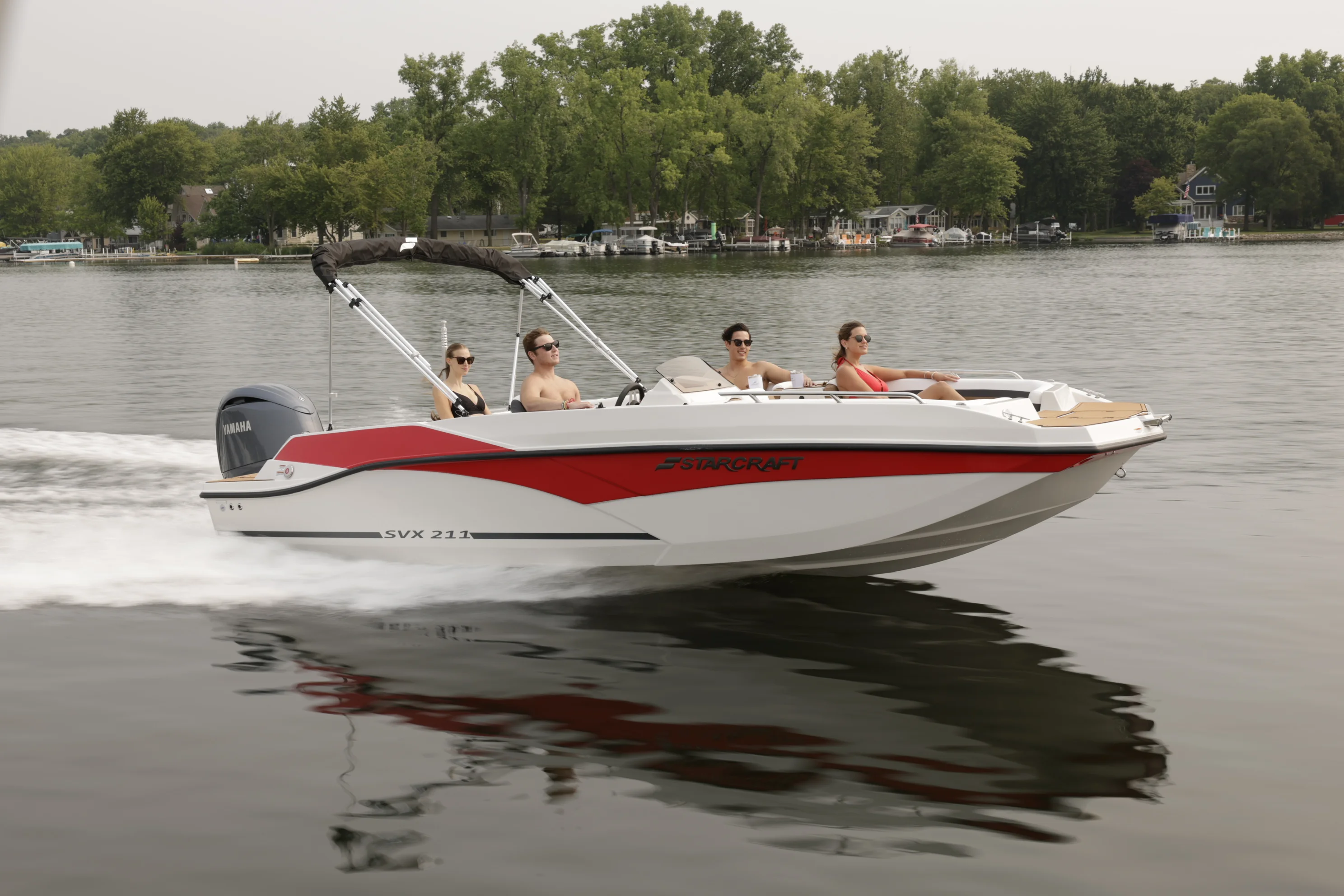 Starcraft's SVX 211 OB fiberglass deck boat effortlessly combines the spaciousness of a deck boat with the agility of a ski boat, offering versatile fun on the water. With its sleek design, this hybrid vessel promises exhilarating experiences for both leisurely cruising and adrenaline-pumping water sports.