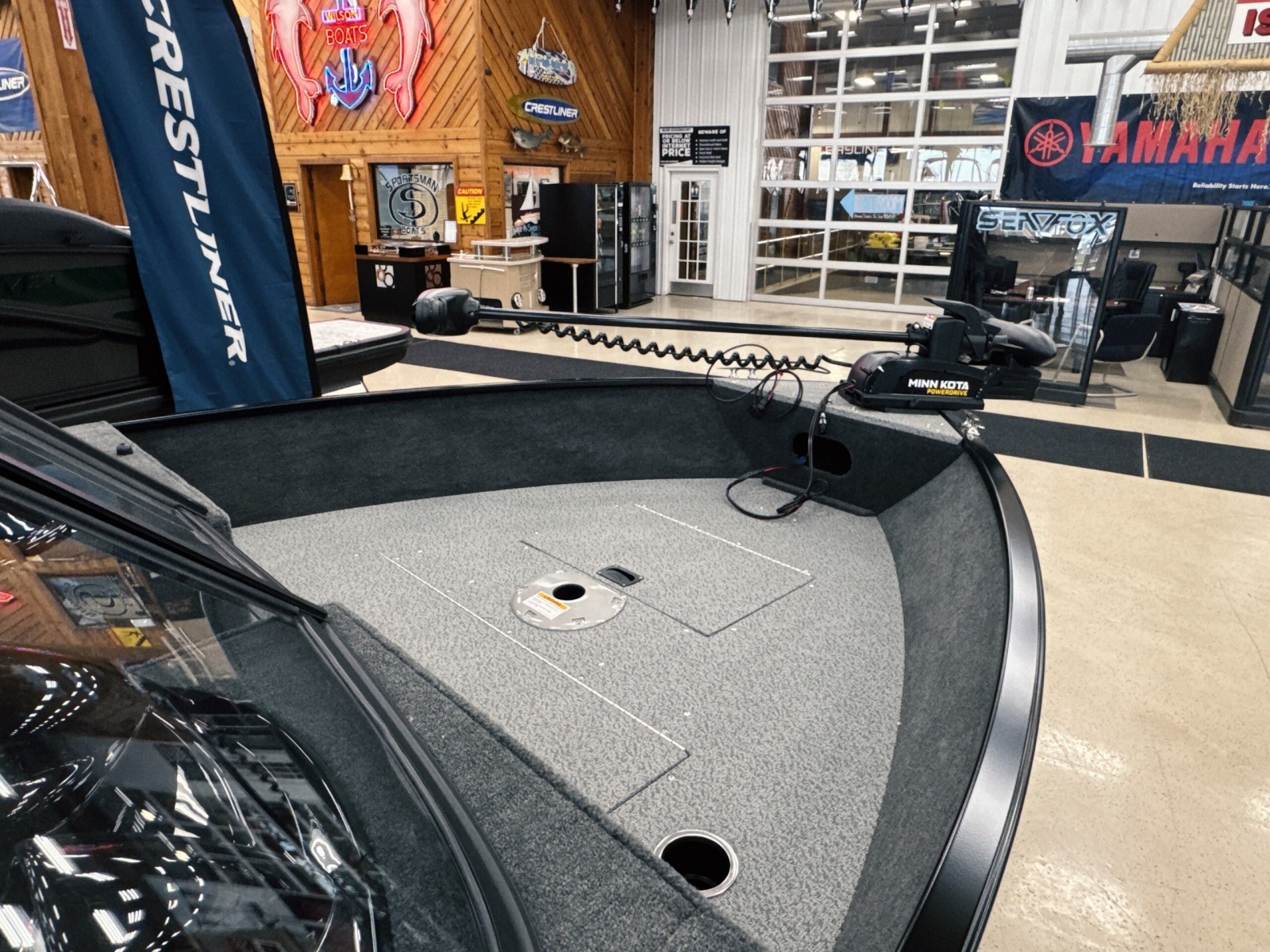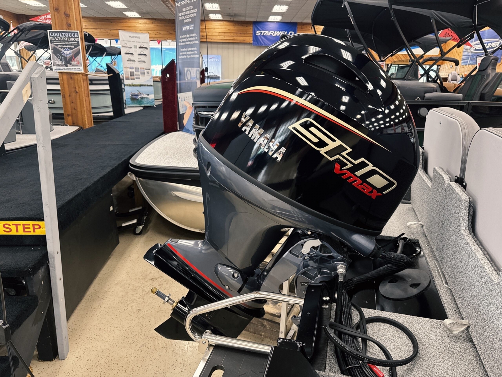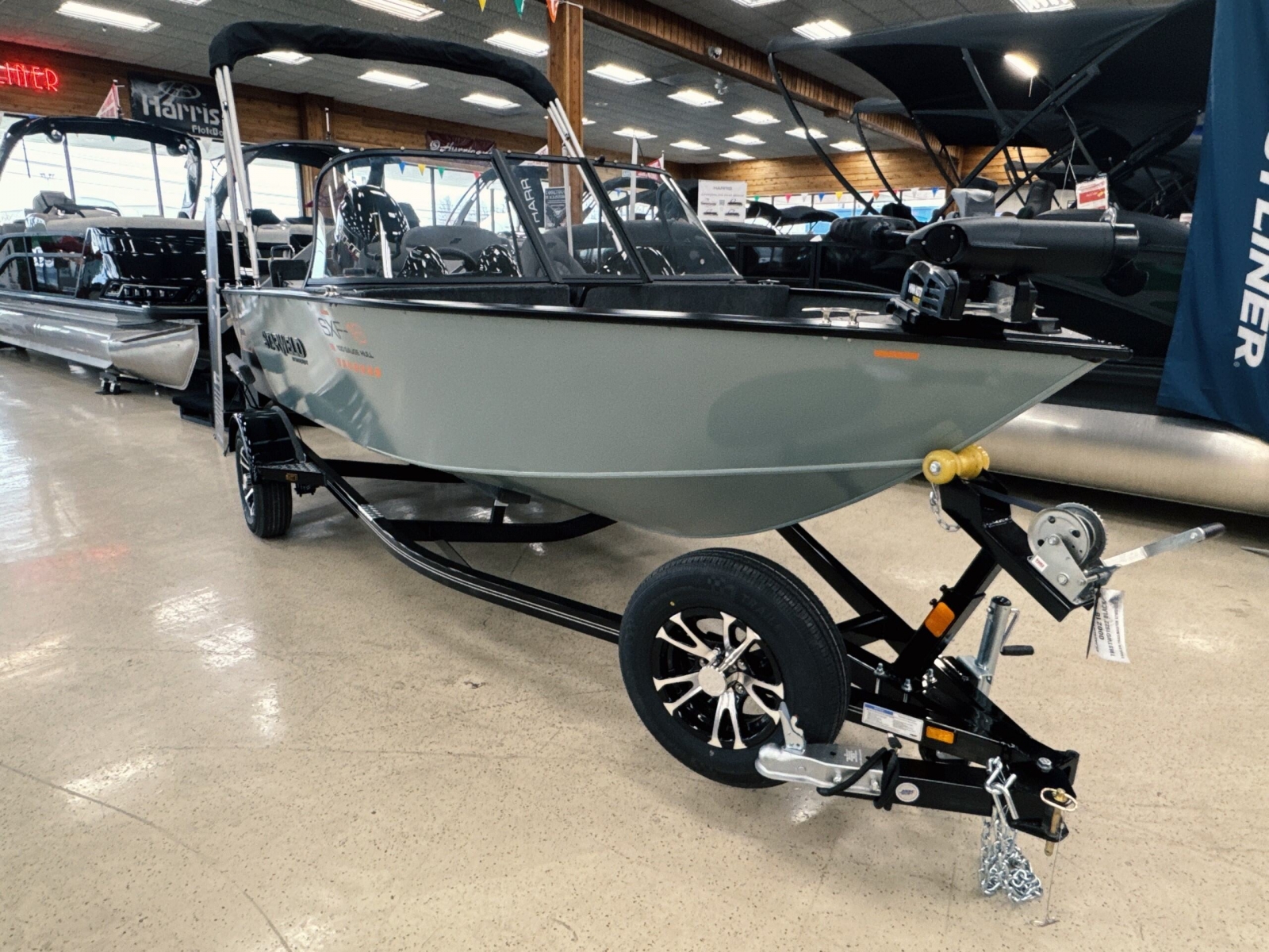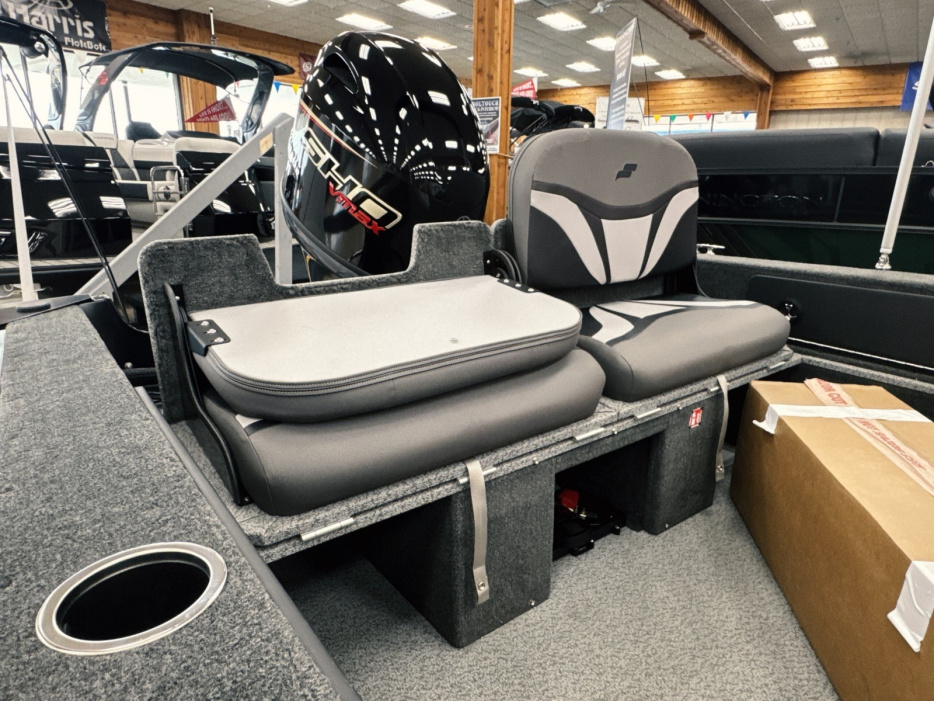 Powered by a Yamaha VMAX 90hpIncludes: Helix 555pd Trolling MotorFisherman's topTrailerable ratchet cover2 bank battery chargerstern flipdown benchswim platform with ladder