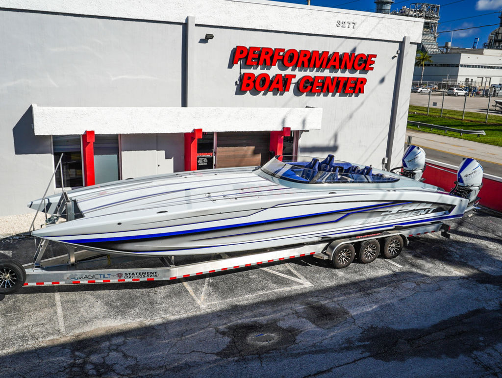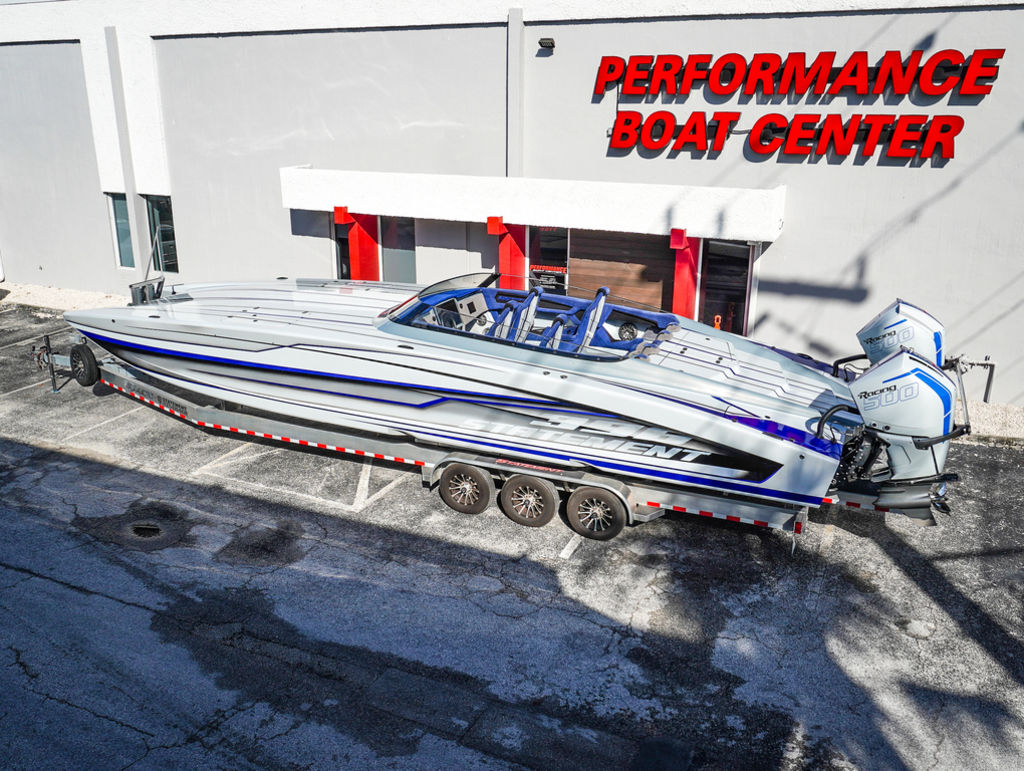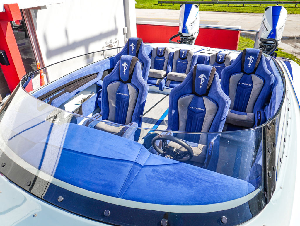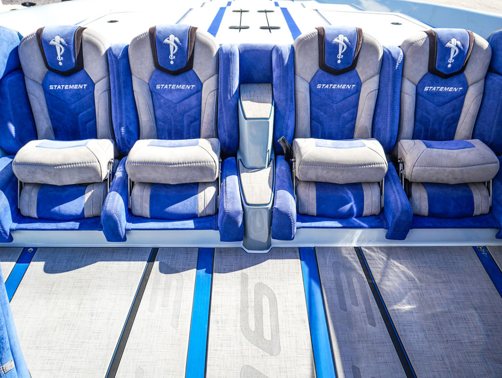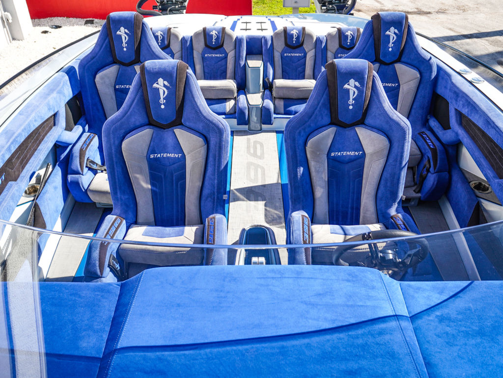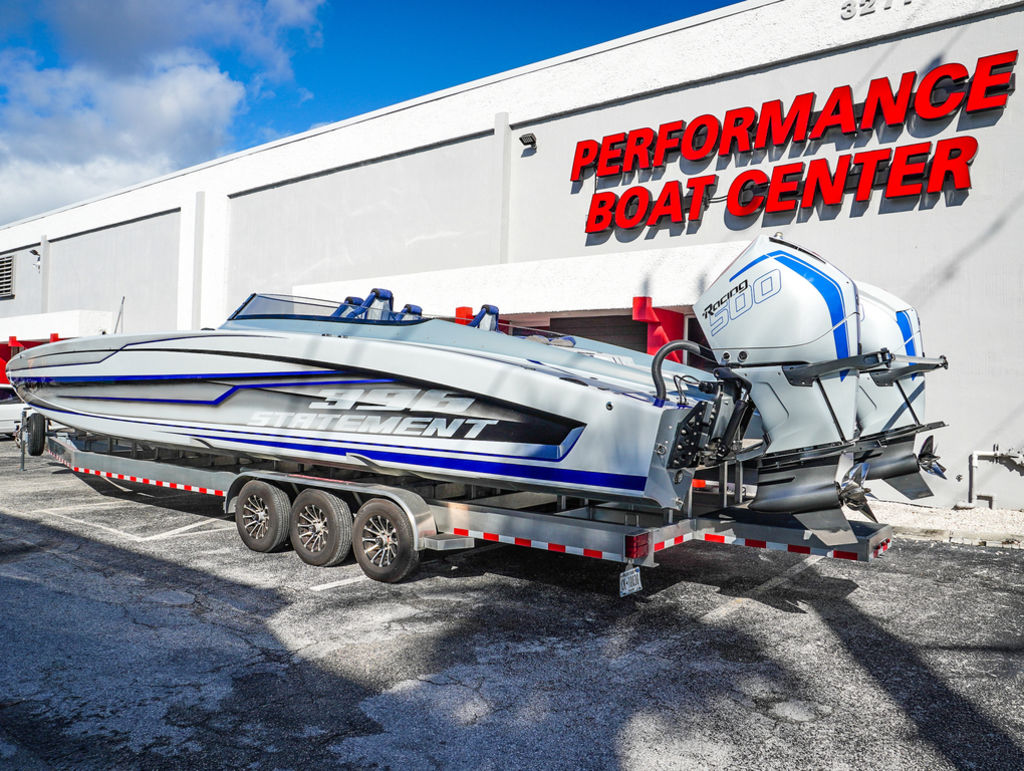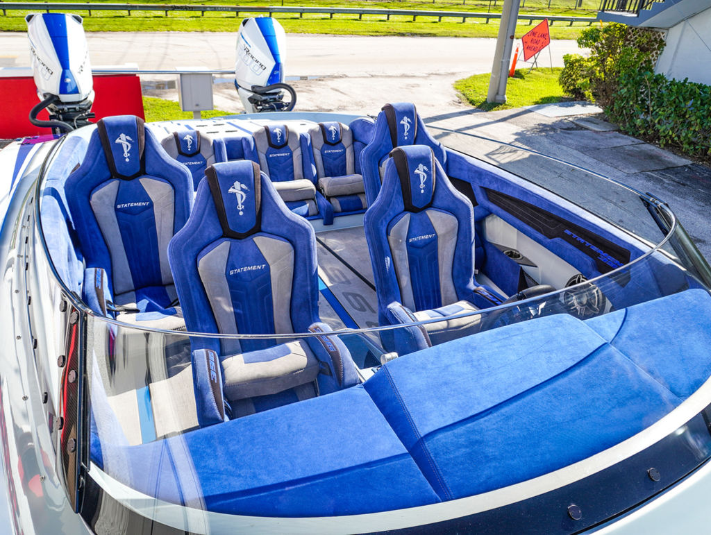 2026 Statement 396 Powered by Twin Mercury Racing 500R's w/ only 72 hours! 8 Seat Cockpit configuration w/ Pop-up Bolsters on all 8 Seats, Alcantera Interior, Seadek Flooring, Blackout Hardware, HUGE JL Audio Stereo, 22inch Garmin Chartplotter GPS, 2 Mercury Vessel Views, Dash Blowers, Accent Lighting throughout, Under Water lighting, Swim ladder, Cockpit cover, and Custom Triple Axle Aluminum Trailer Included!