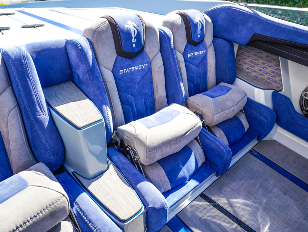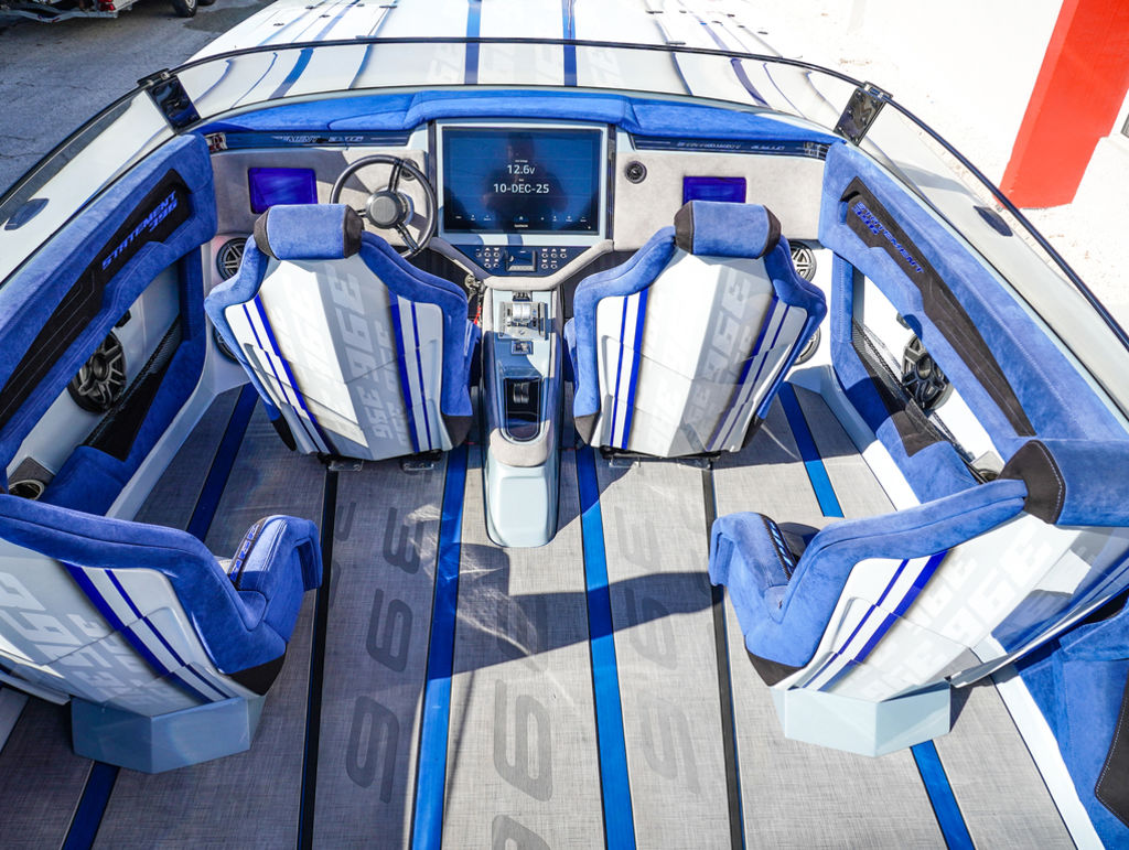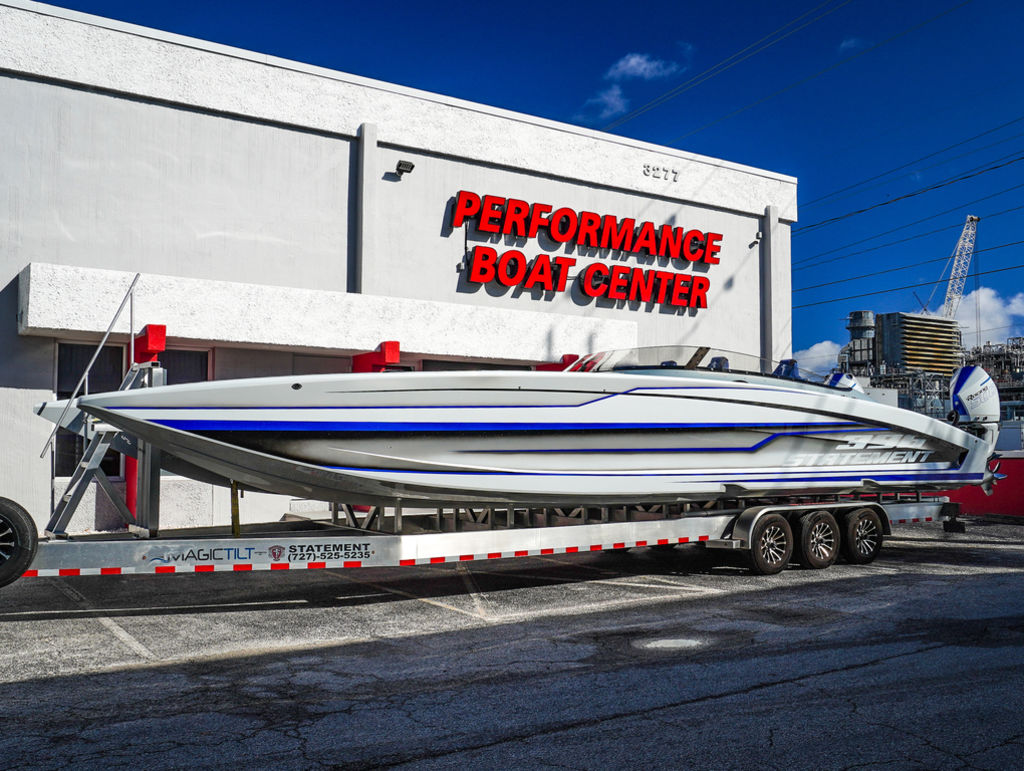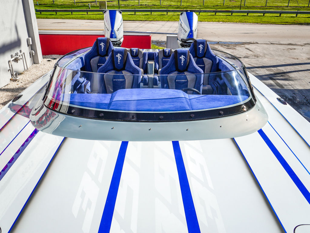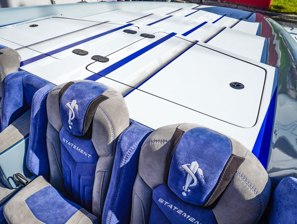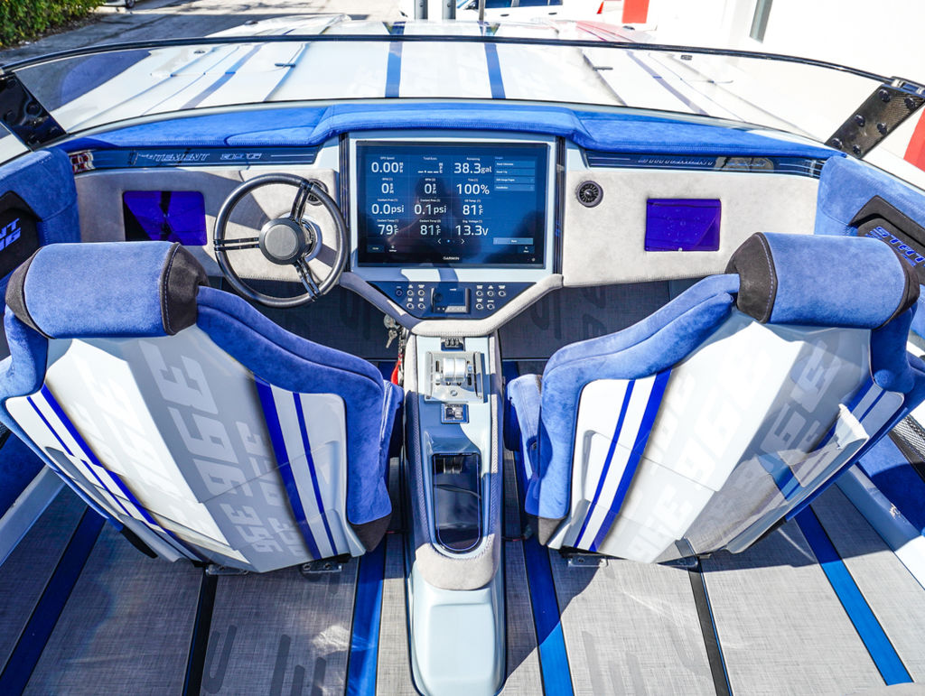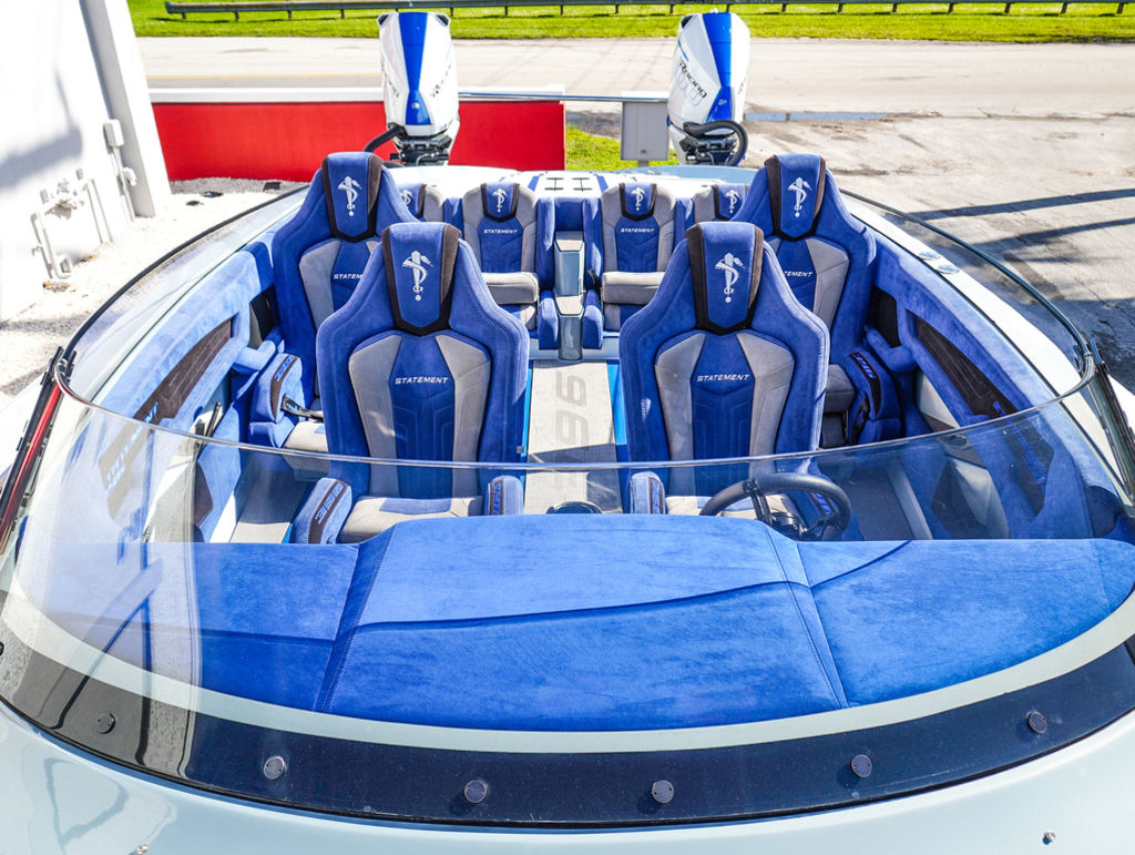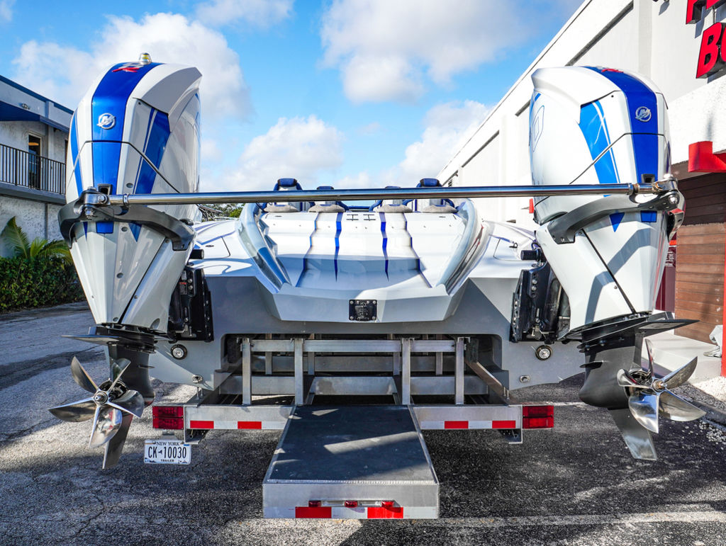 2026 Statement 396 Powered by Twin Mercury Racing 500R's w/ only 72 hours! 8 Seat Cockpit configuration w/ Pop-up Bolsters on all 8 Seats, Alcantera Interior, Seadek Flooring, Blackout Hardware, HUGE JL Audio Stereo, 22inch Garmin Chartplotter GPS, 2 Mercury Vessel Views, Dash Blowers, Accent Lighting throughout, Under Water lighting, Swim ladder, Cockpit cover, and Custom Triple Axle Aluminum Trailer Included!