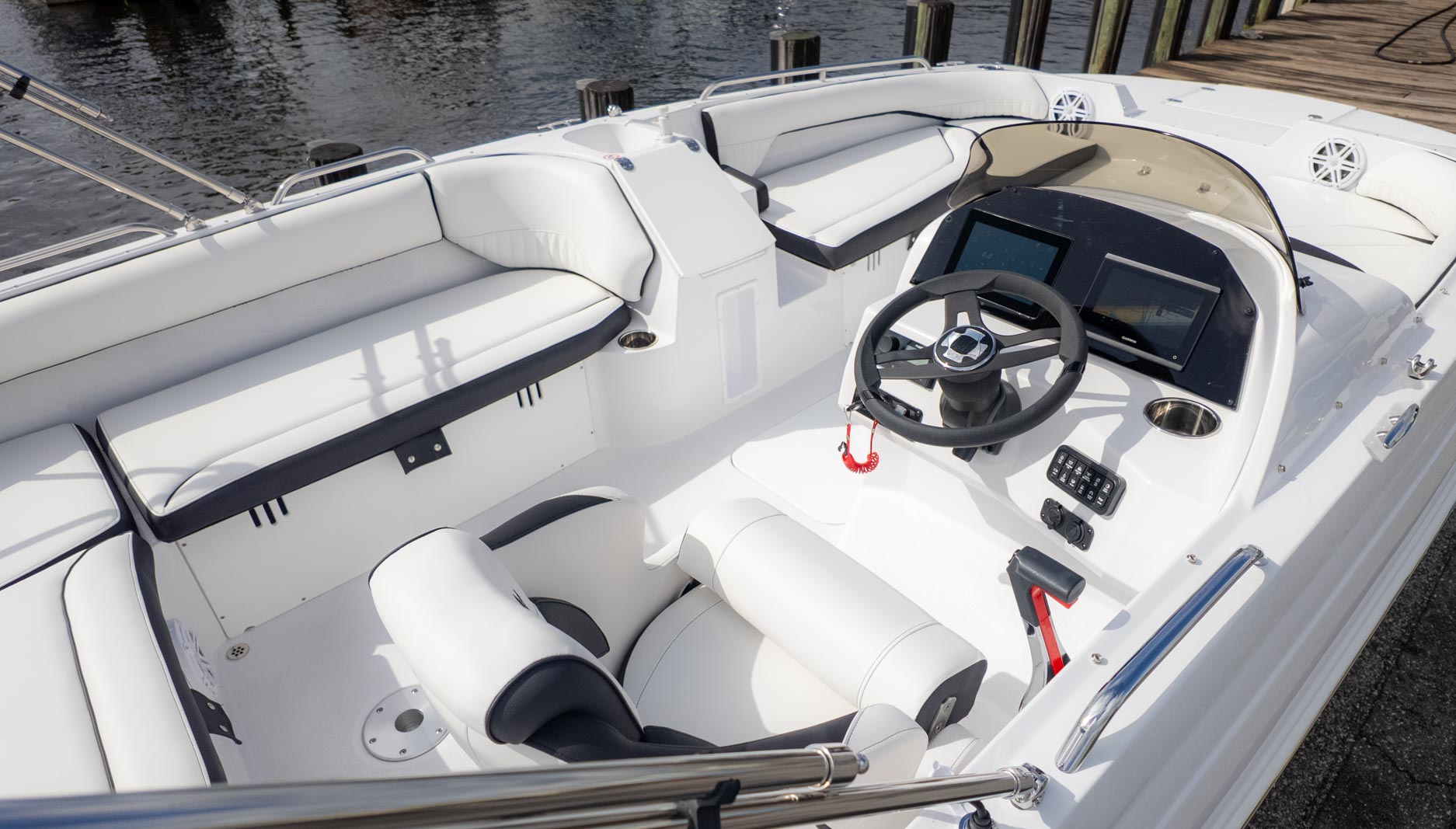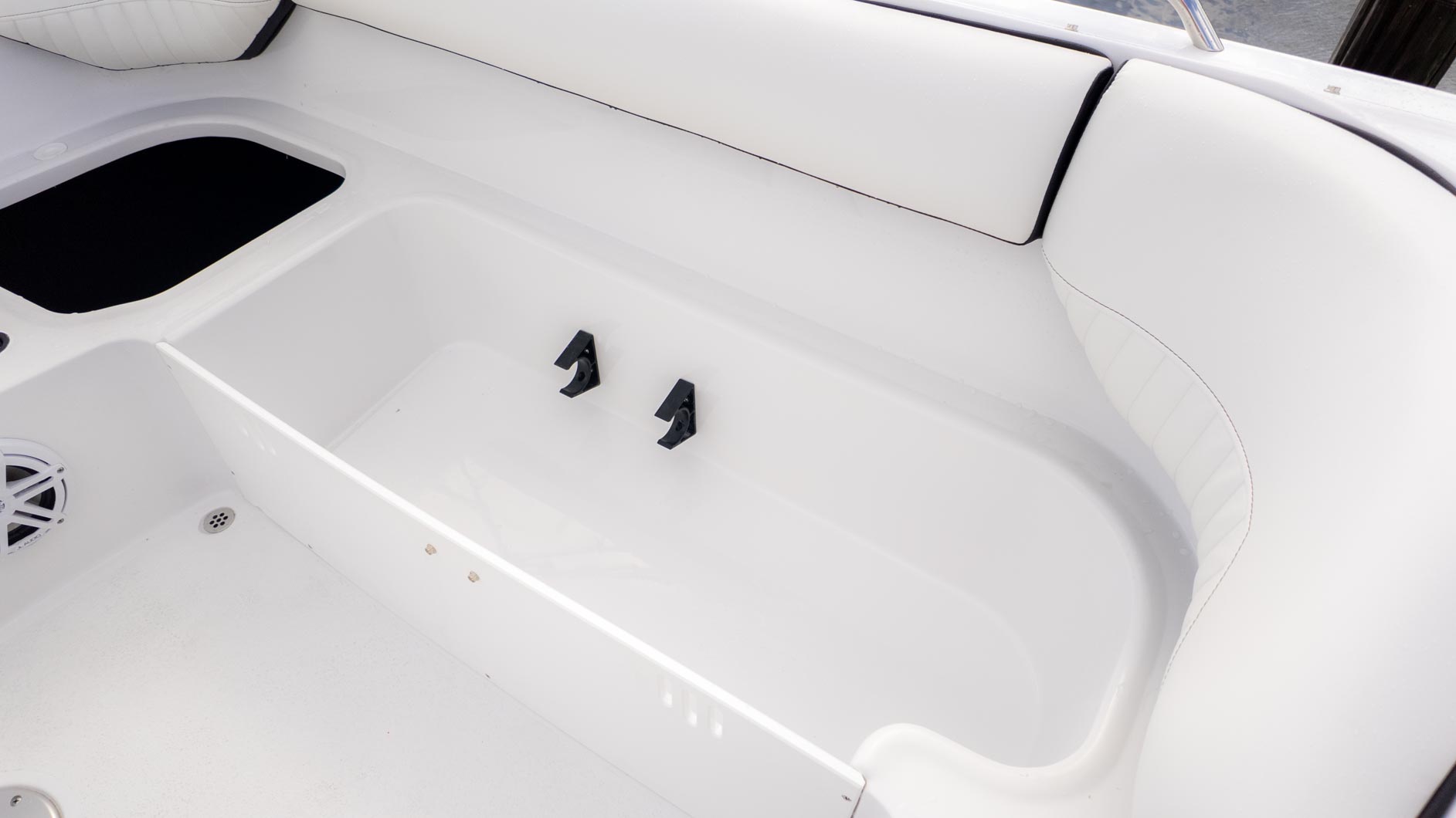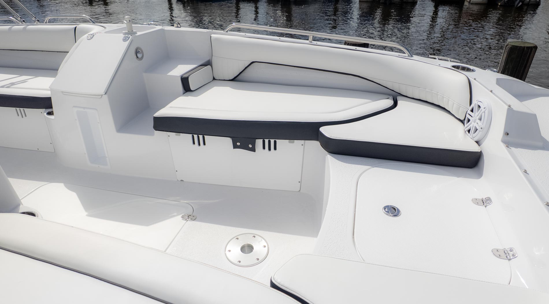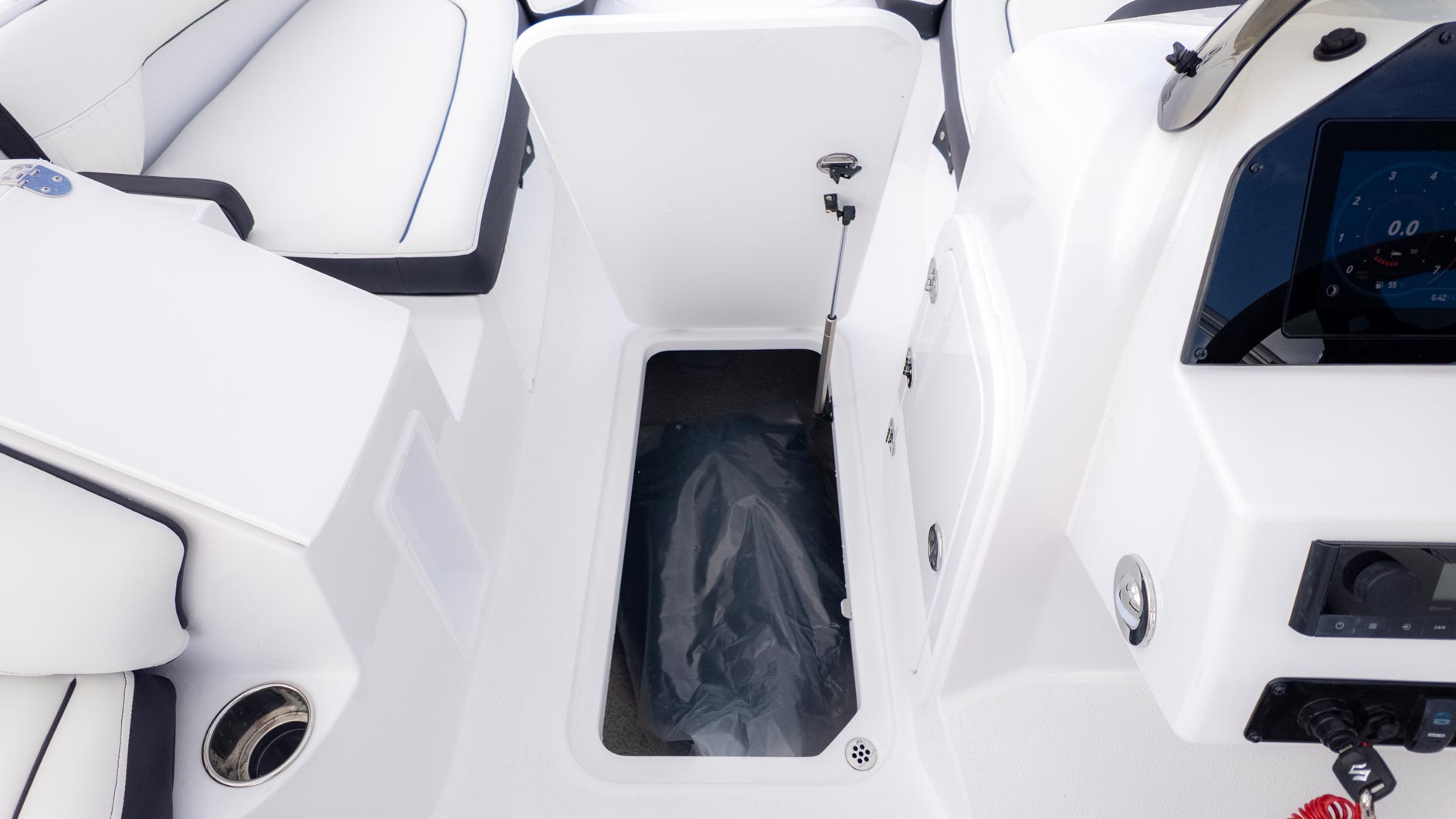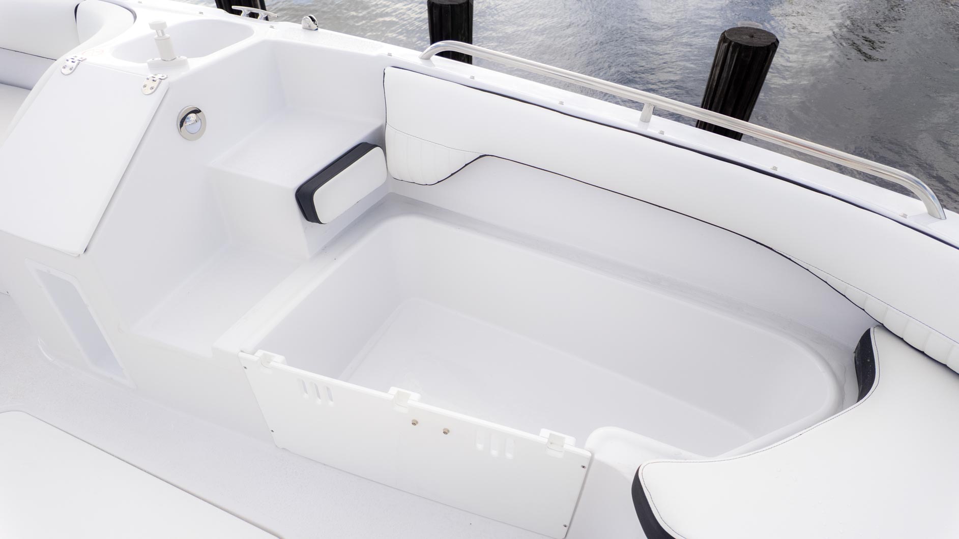 The boat is designed with fun in mind, featuring a thoughtful interior with tons of storage compartments for all your gear. You'll find a removable Igloo cooler to keep your drinks and snacks chilled, and a freshwater sink to make cleanup a breeze. The cockpit even has a floor mount for a table, perfect for a floating lunch.