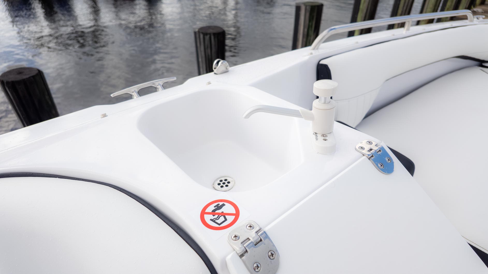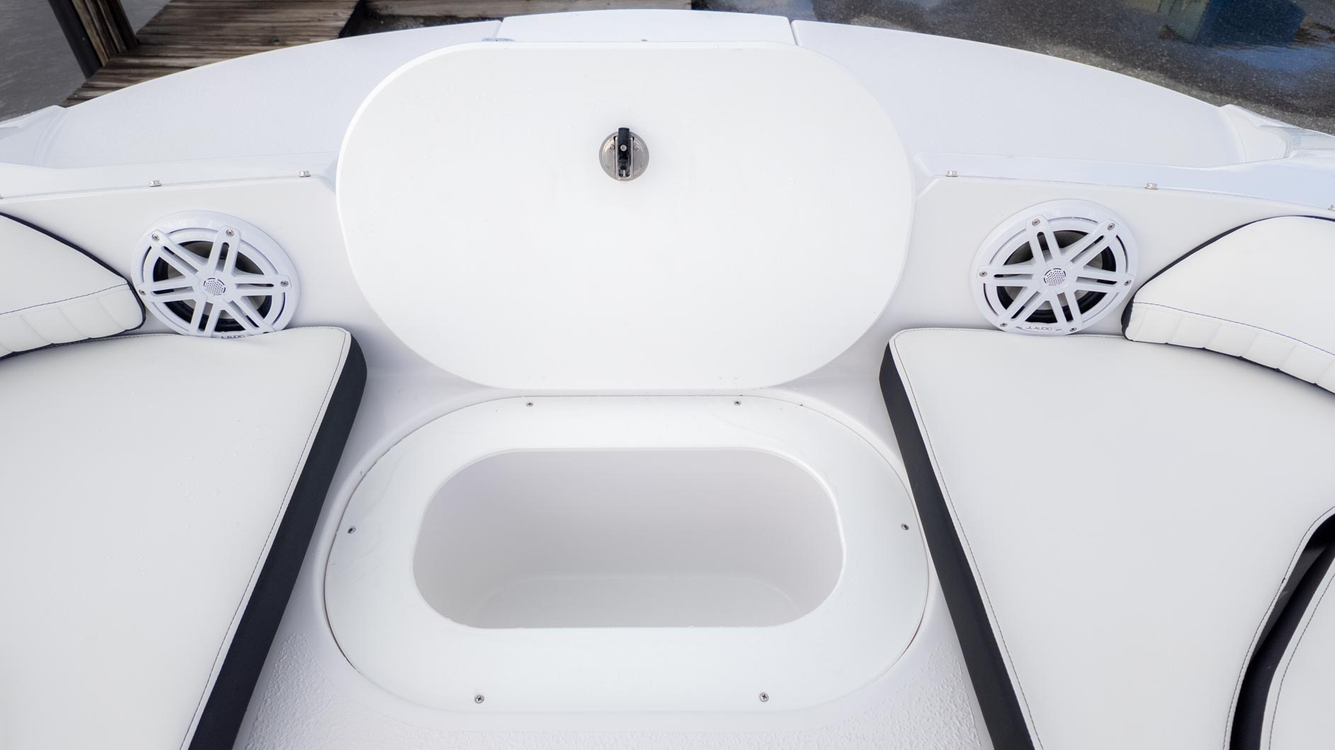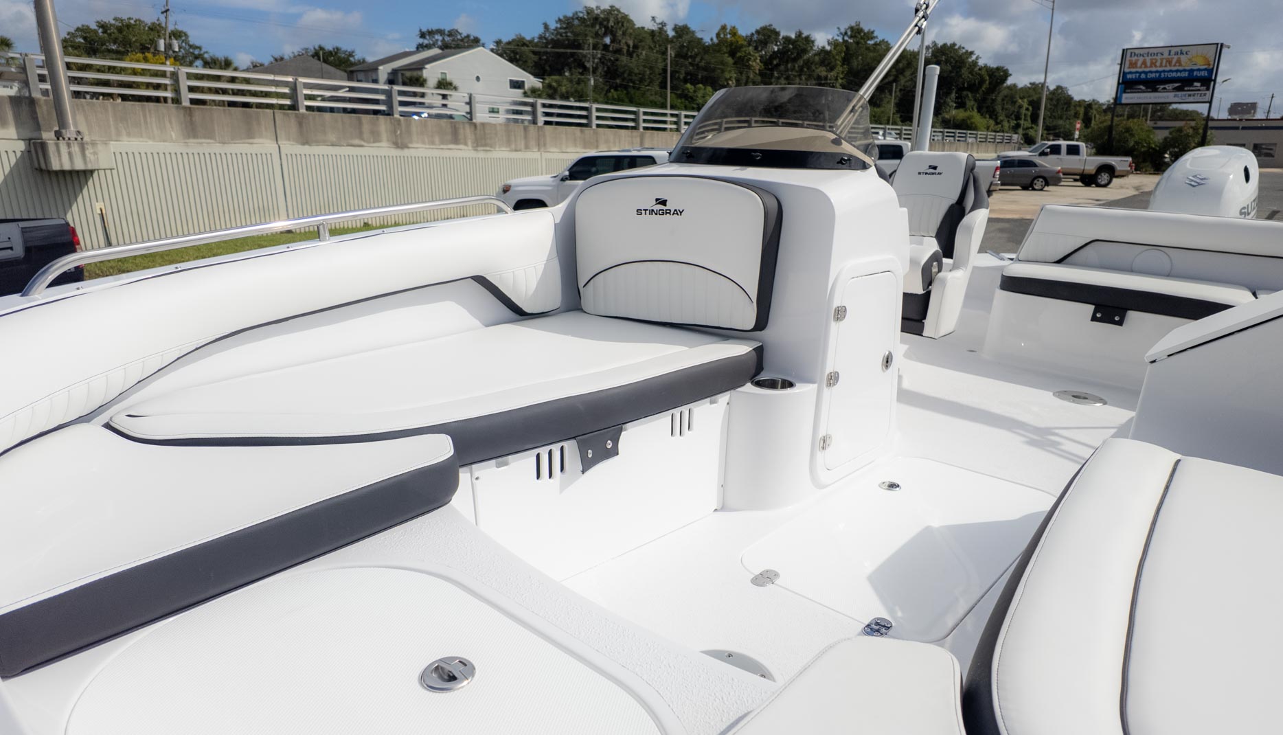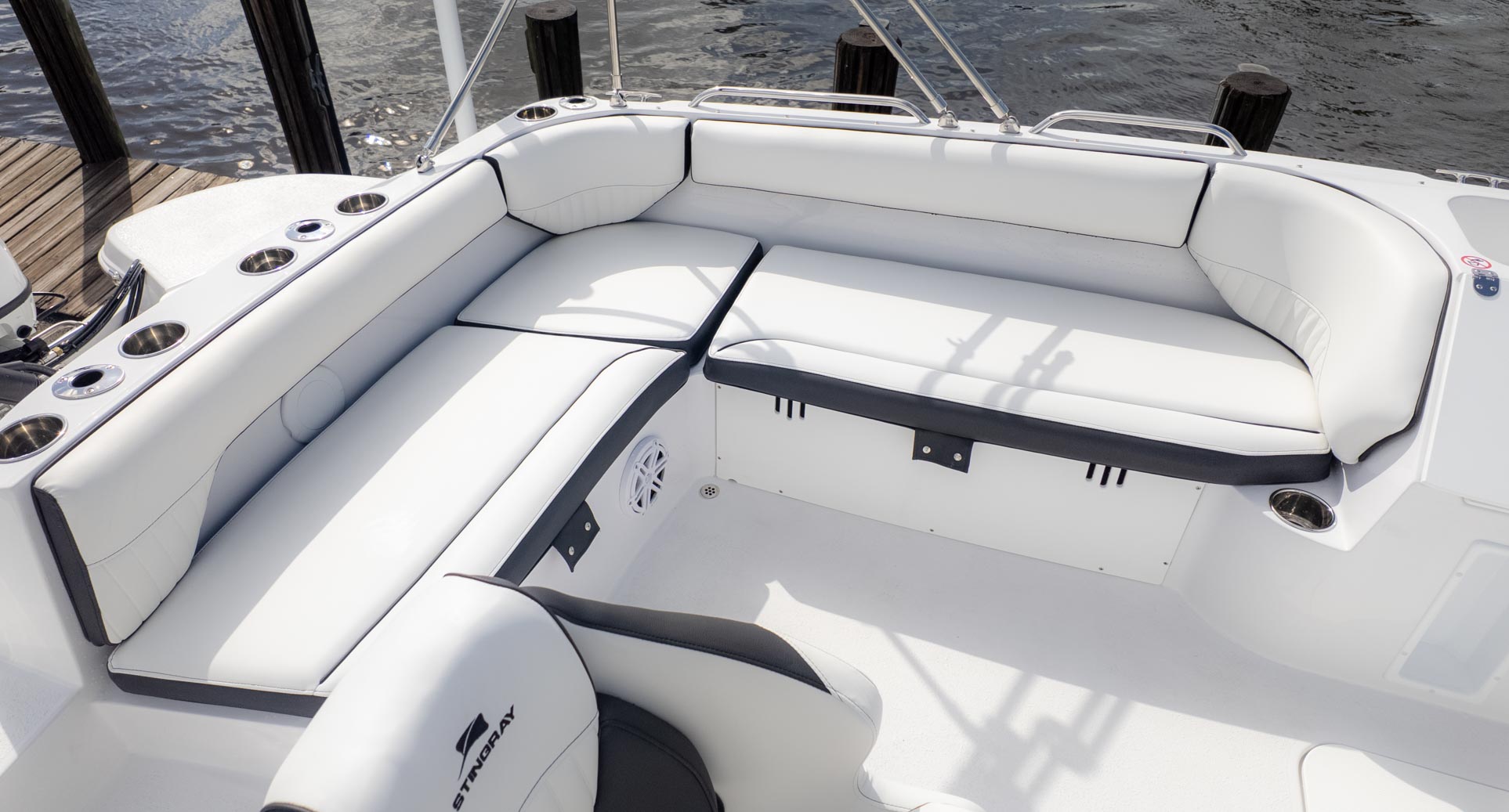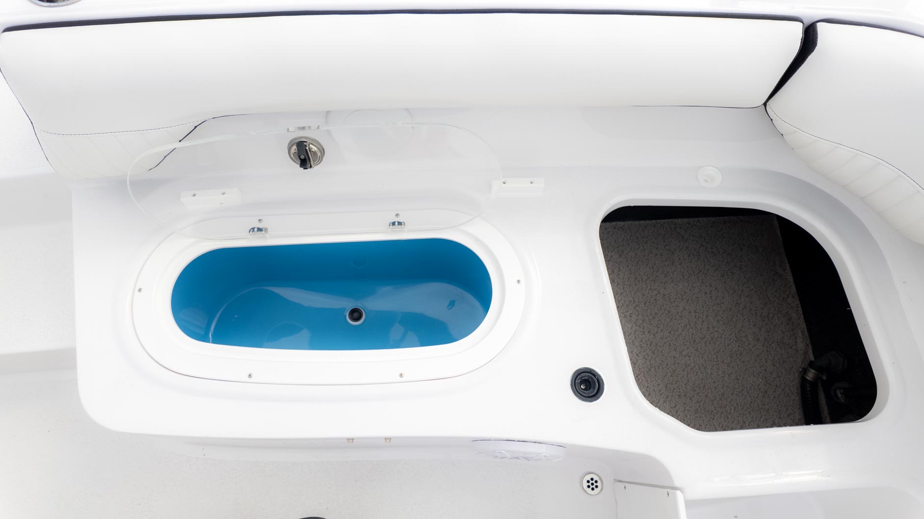 The boat is designed with fun in mind, featuring a thoughtful interior with tons of storage compartments for all your gear. You'll find a removable Igloo cooler to keep your drinks and snacks chilled, and a freshwater sink to make cleanup a breeze. The cockpit even has a floor mount for a table, perfect for a floating lunch.