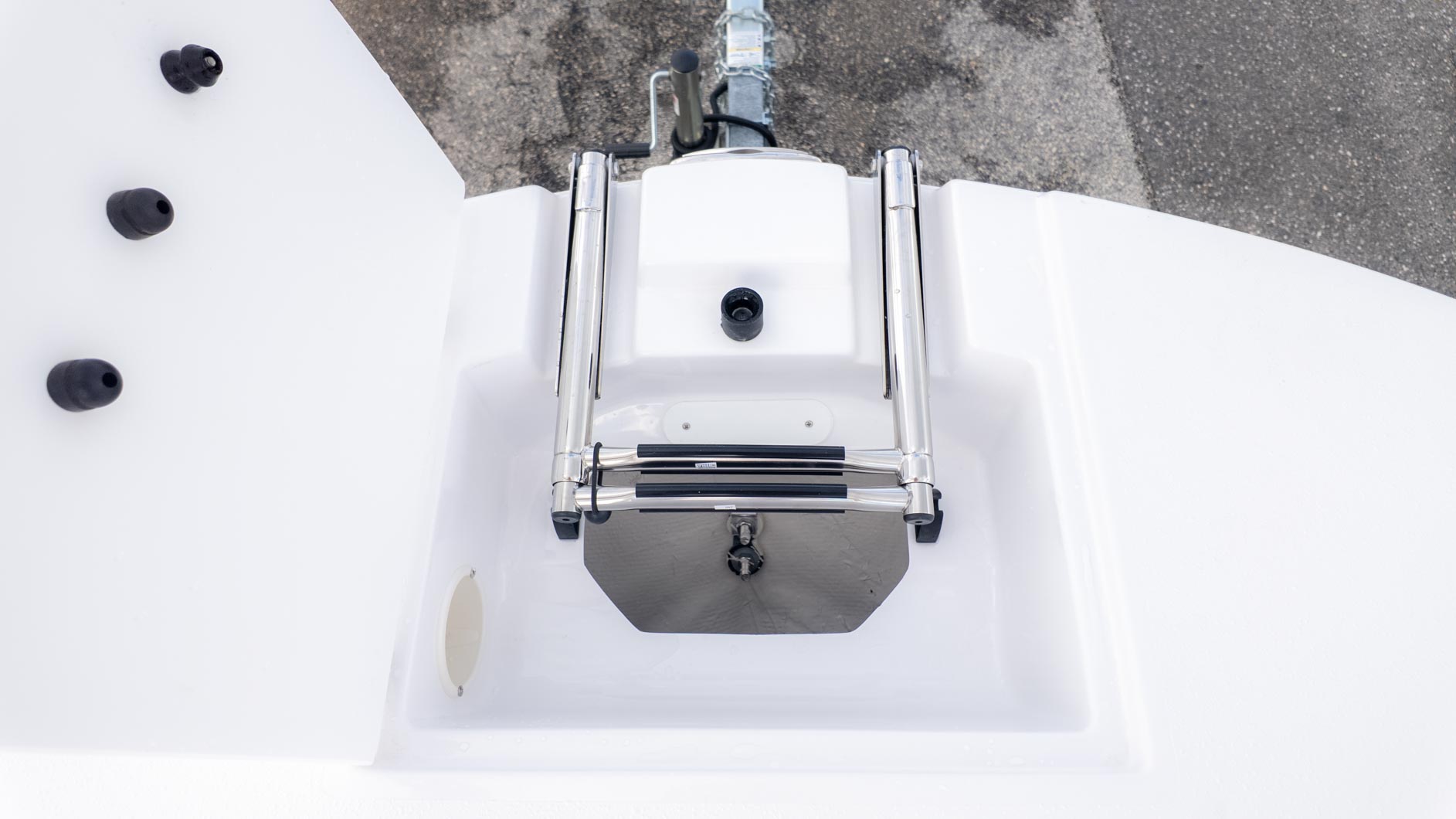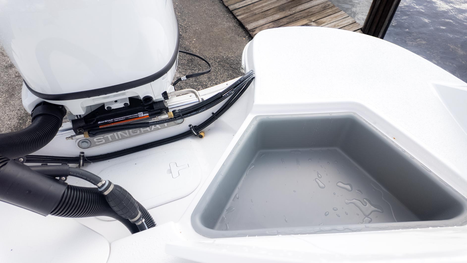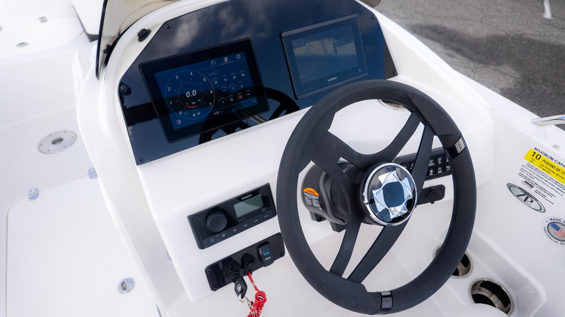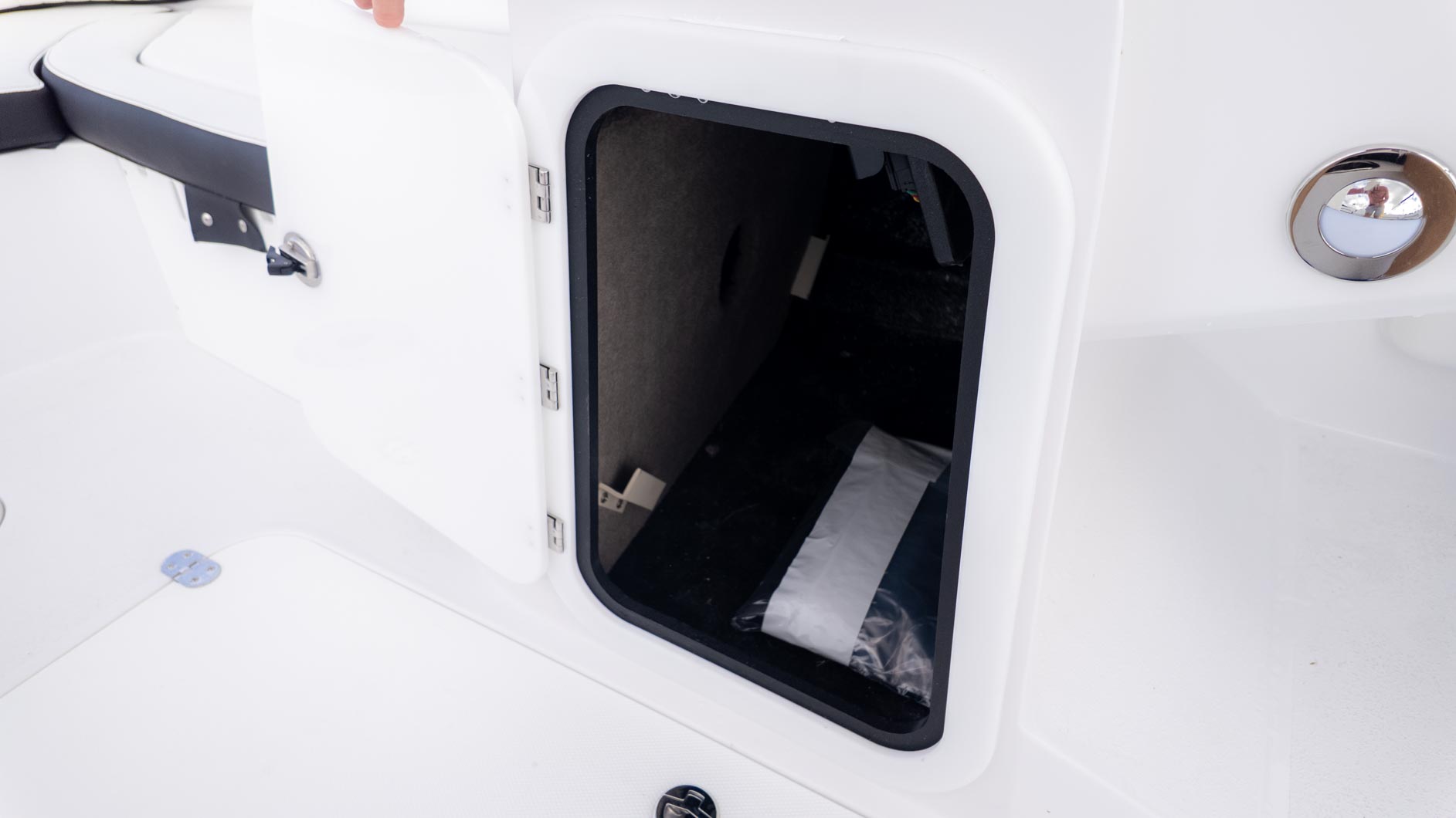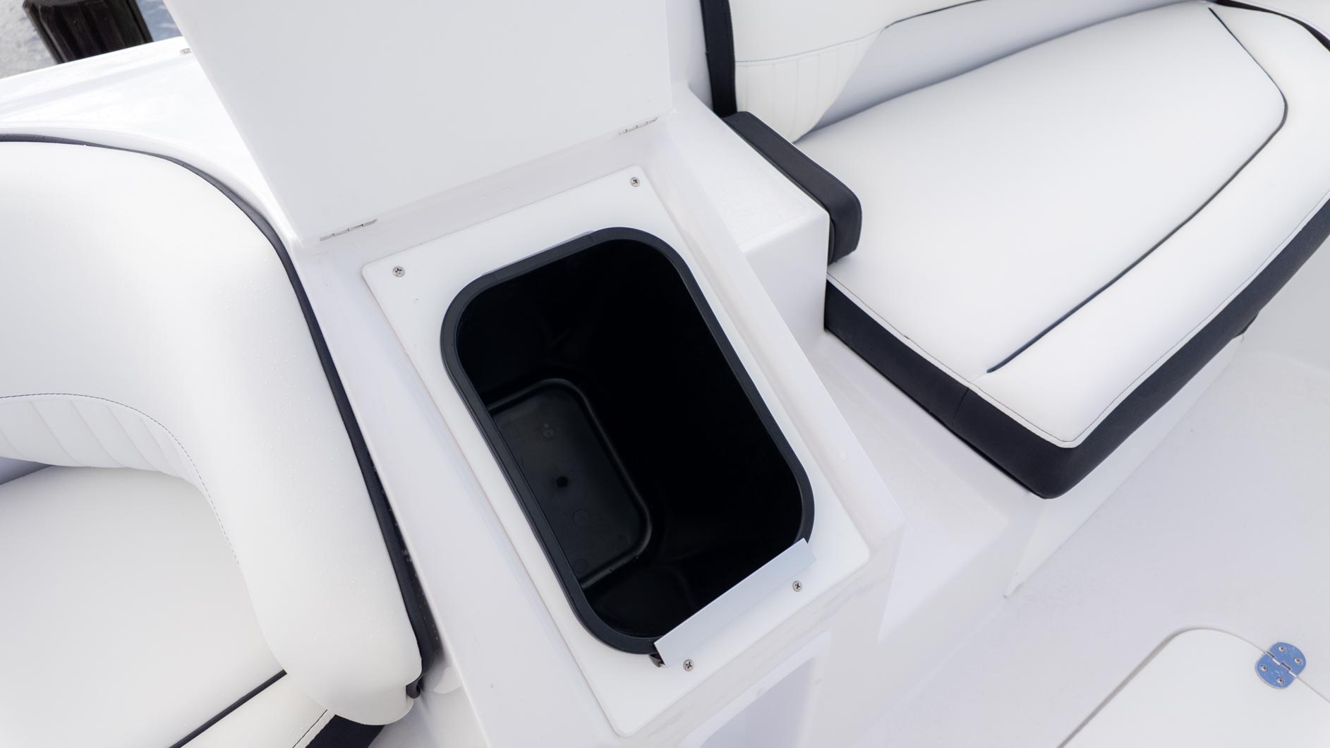 The boat is designed with fun in mind, featuring a thoughtful interior with tons of storage compartments for all your gear. You'll find a removable Igloo cooler to keep your drinks and snacks chilled, and a freshwater sink to make cleanup a breeze. The cockpit even has a floor mount for a table, perfect for a floating lunch.