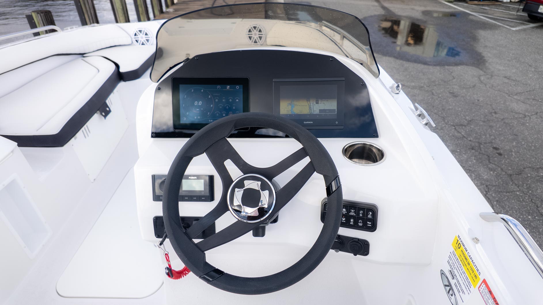 There's a stainless steel multi-step ladder for easy re-entry after a refreshing swim. The boat is also equipped with a Fusion stereo, so you can set the mood with your favorite tunes. Whether you're cruising, lounging, or just enjoying the day, this boat is a great choice for anyone seeking a versatile and exciting boating experience.