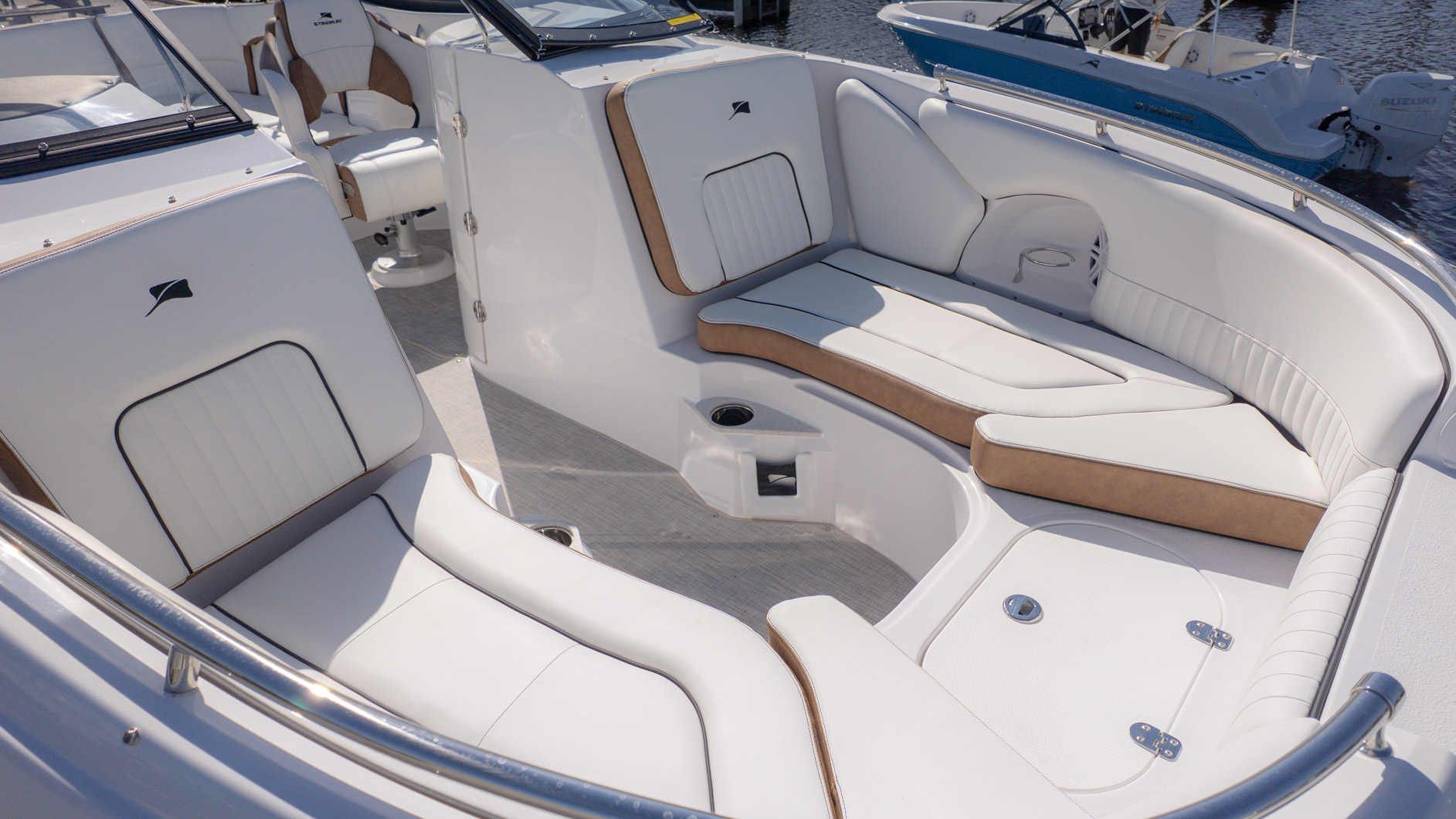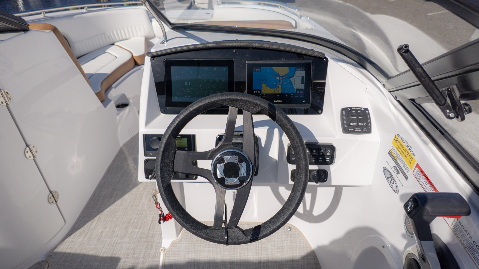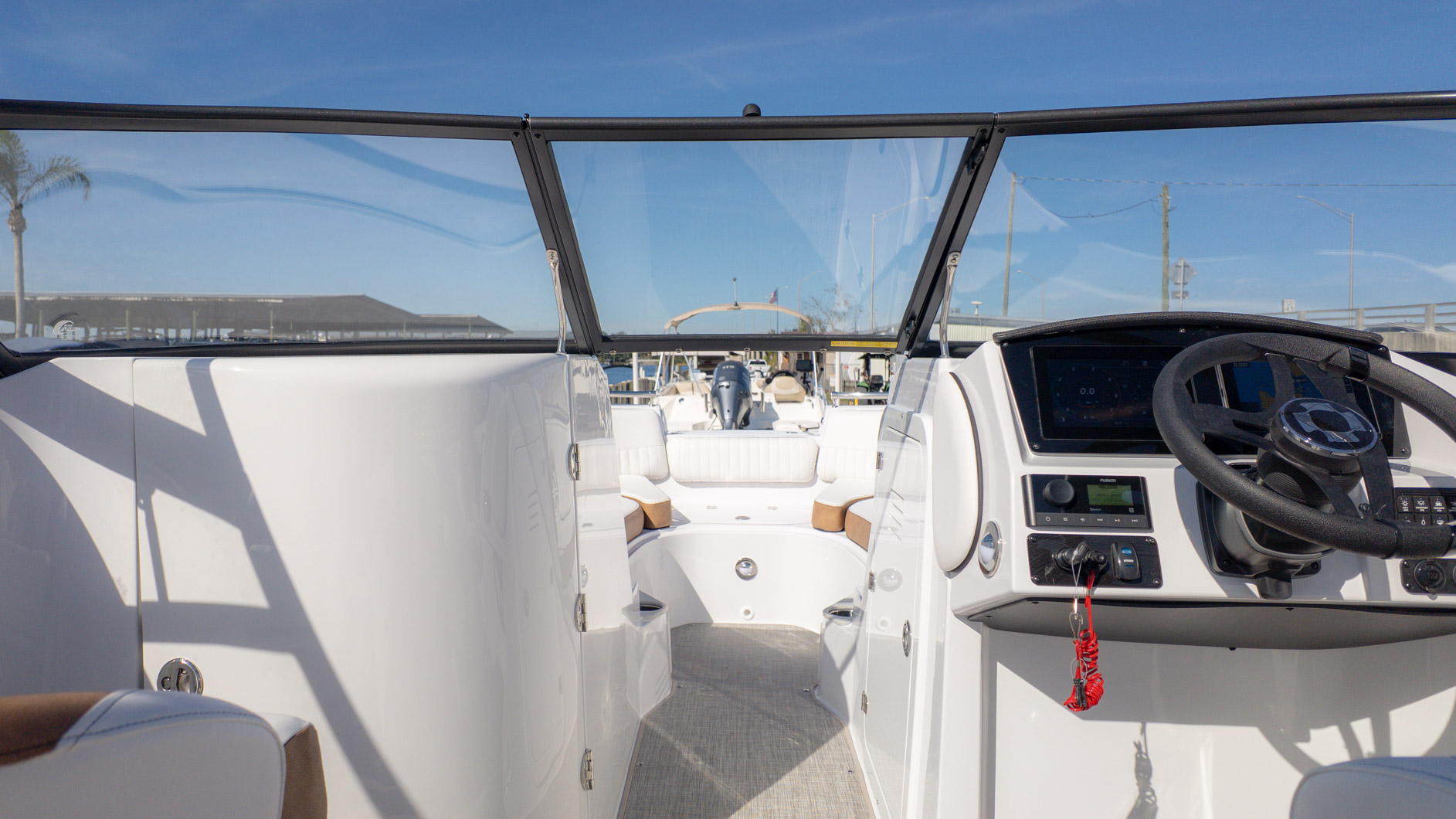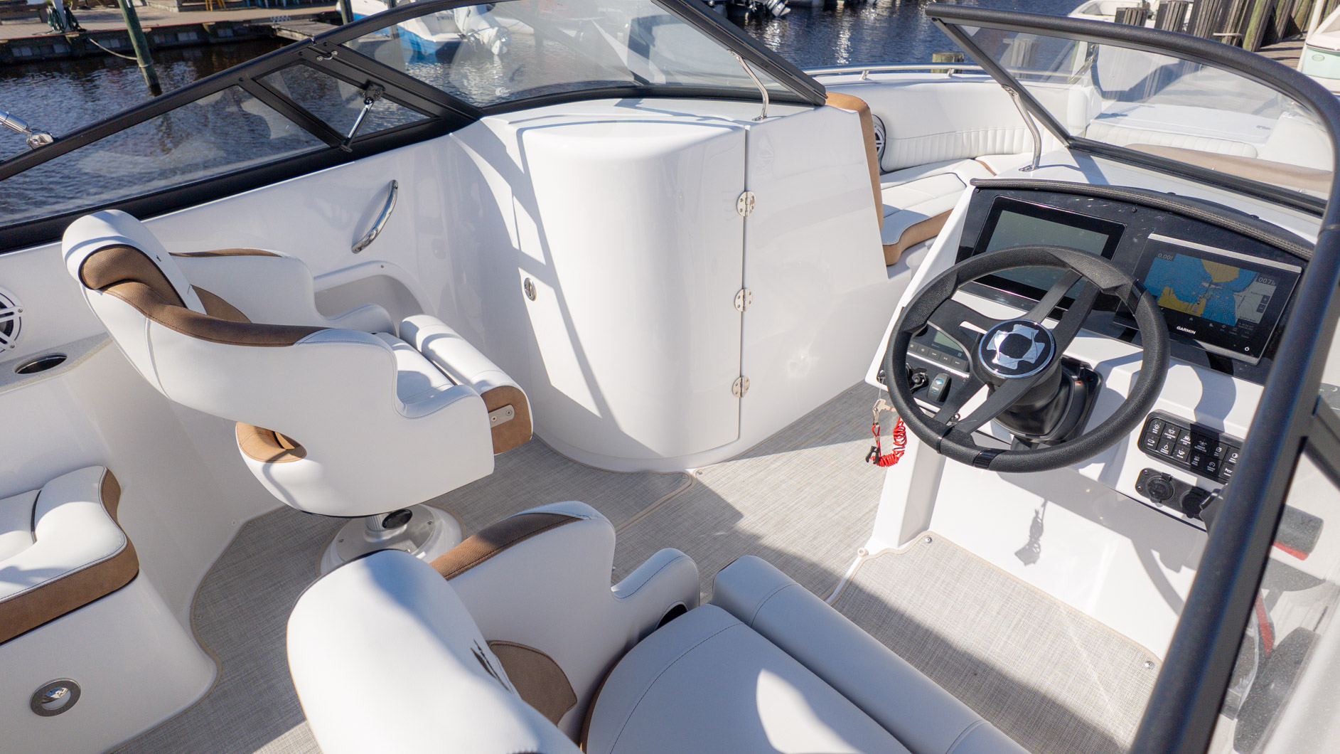 With an onboard sink, a pressurized water system with bow and transom showers, and an enclosed head that can double as a changing room, you can extend your time on the water. Control your ride with the Italian steering wheel and stay connected with the Fusion RA-60 Stereo. You can also add the optional wakeboard tower for an extra layer of excitement. The spacious and functional design adapts to all your needs, making it the perfect vessel for a fun-filled day of cruising, swimming, and watersports.