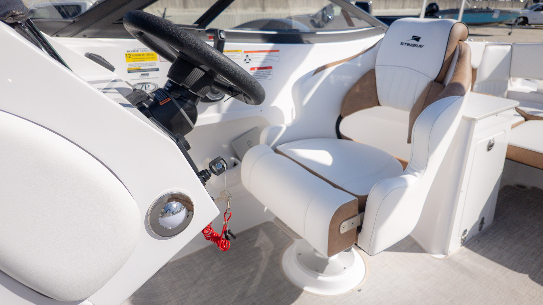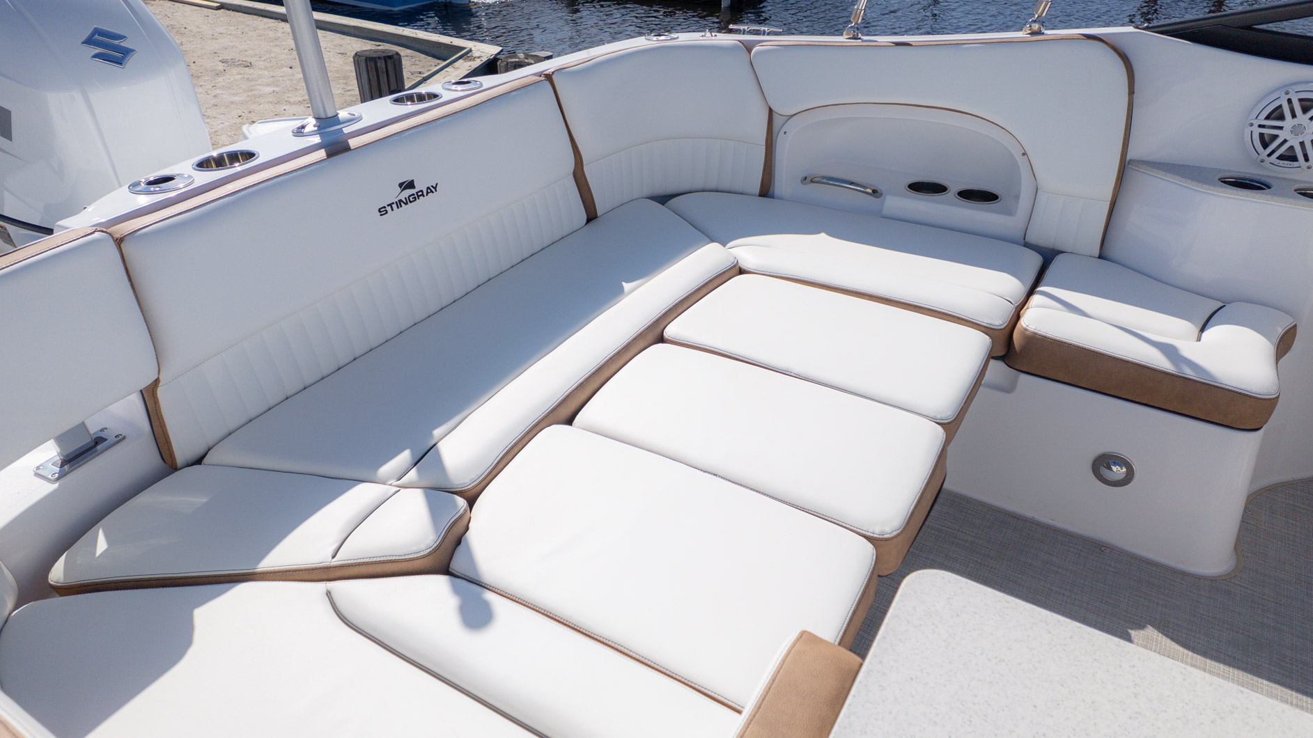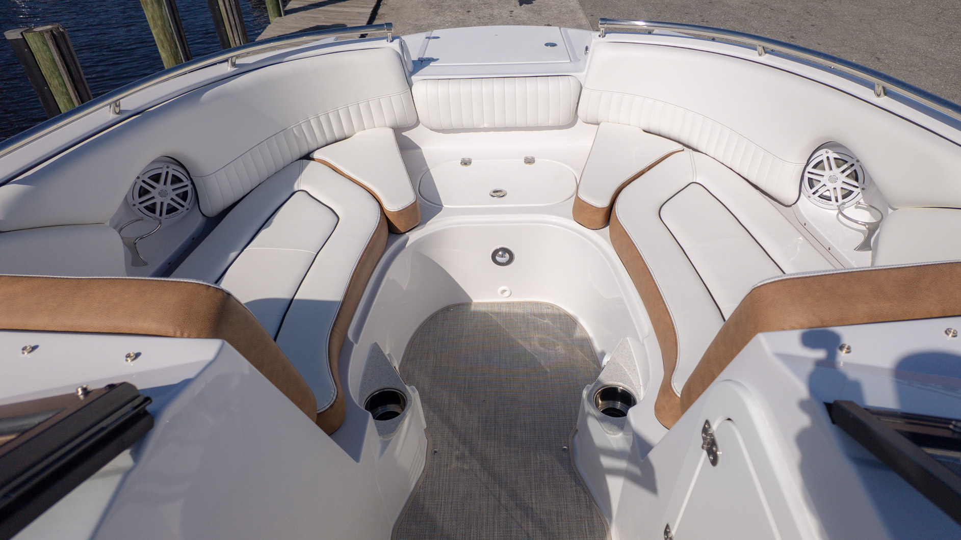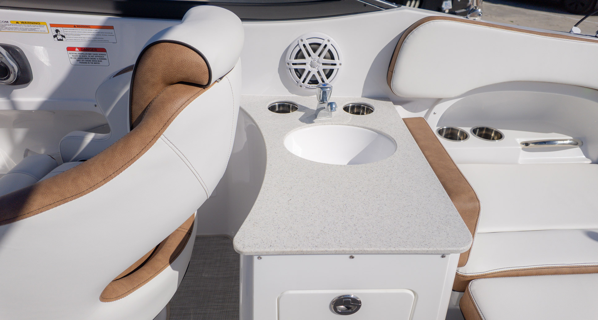 With an onboard sink, a pressurized water system with bow and transom showers, and an enclosed head that can double as a changing room, you can extend your time on the water. Control your ride with the Italian steering wheel and stay connected with the Fusion RA-60 Stereo. You can also add the optional wakeboard tower for an extra layer of excitement. The spacious and functional design adapts to all your needs, making it the perfect vessel for a fun-filled day of cruising, swimming, and watersports.