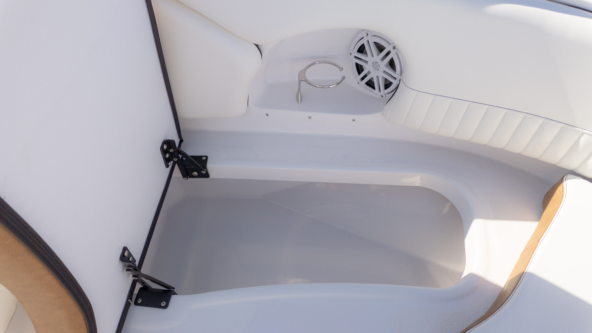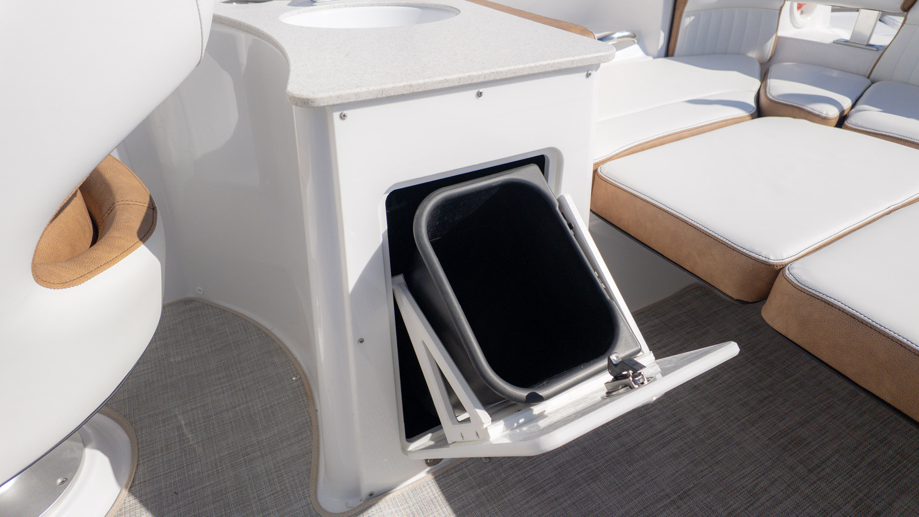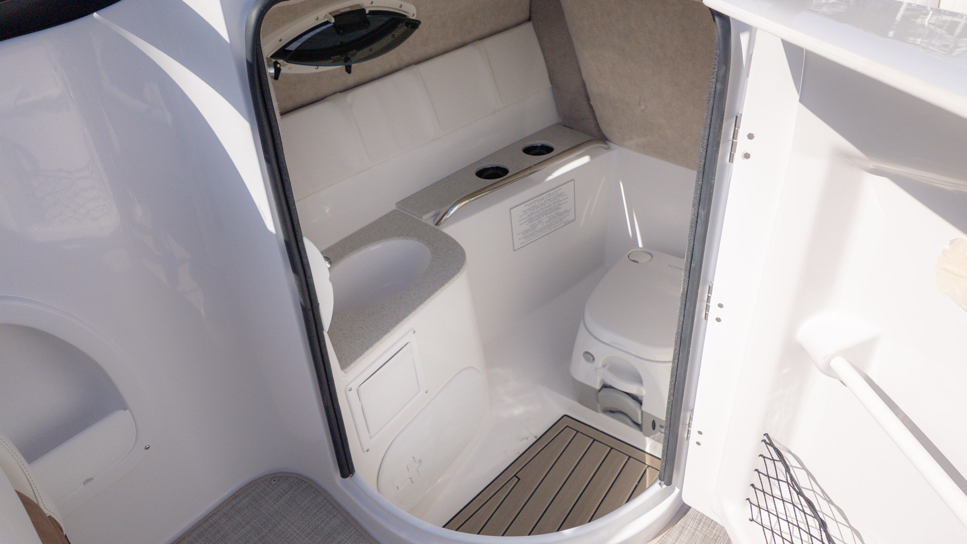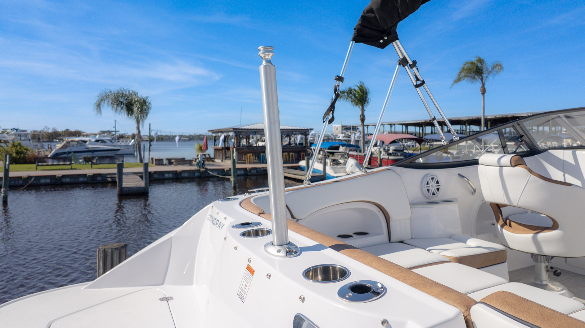 With an onboard sink, a pressurized water system with bow and transom showers, and an enclosed head that can double as a changing room, you can extend your time on the water. Control your ride with the Italian steering wheel and stay connected with the Fusion RA-60 Stereo. You can also add the optional wakeboard tower for an extra layer of excitement. The spacious and functional design adapts to all your needs, making it the perfect vessel for a fun-filled day of cruising, swimming, and watersports.