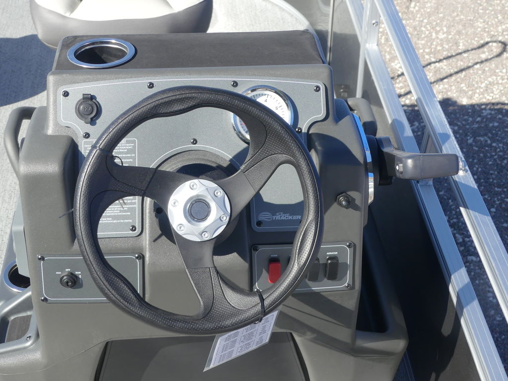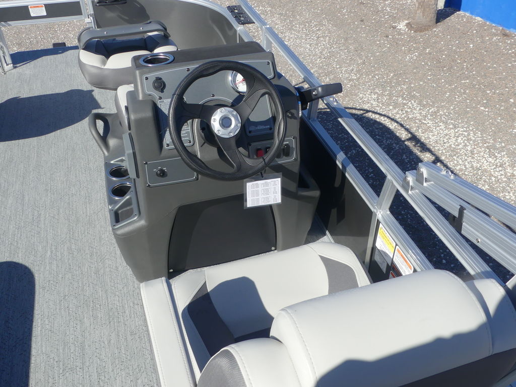 This seven-passenger fishing pontoon hits the water with new console and lounge designs. Get three extra cubic feet of storage thanks to clever backrest cut-outs. The redesign also adds a seat in front of the driver console, phone compartments, and four more cupholders. Cast from the shade of a standard 7' bimini top in one of the two folding fishing seats. Find your spot on the lake from the decked-out driver console, which comes with its own rod holder.