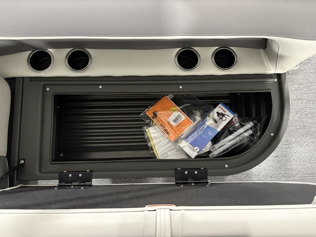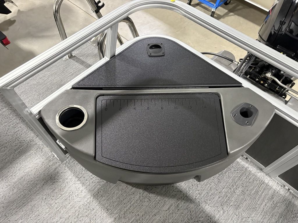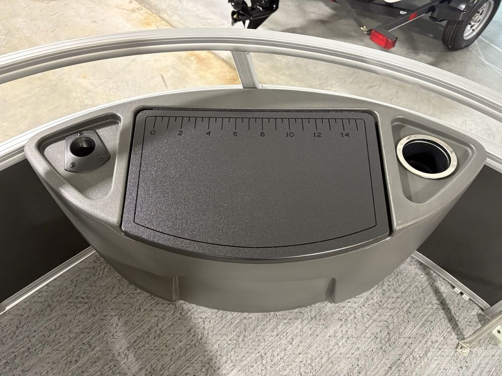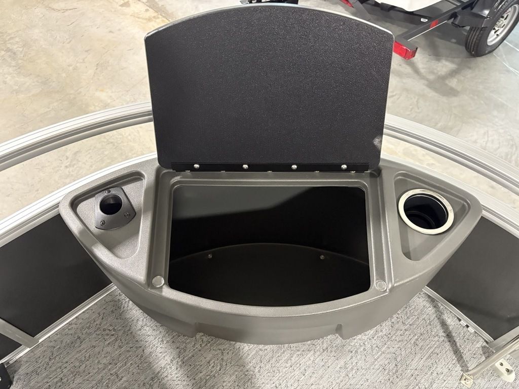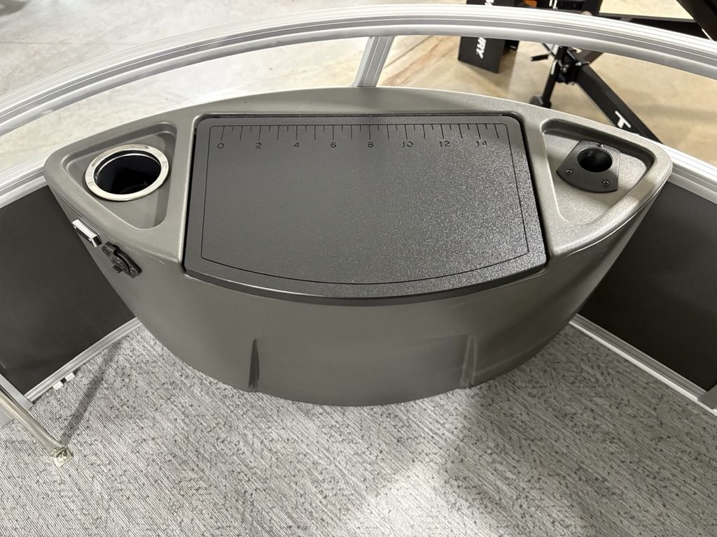 - Front fishing station w/2 pedestal seat base locations; rail-mounted rod & tool holders; & bow starboard storage compartment w/rod & drink holders
