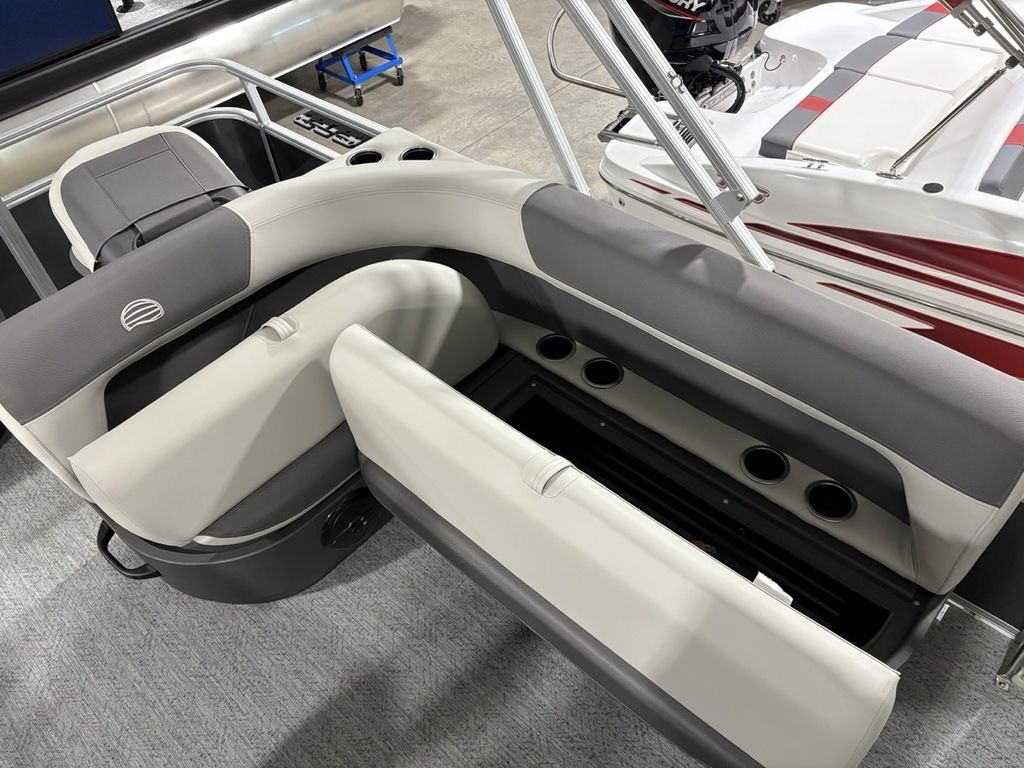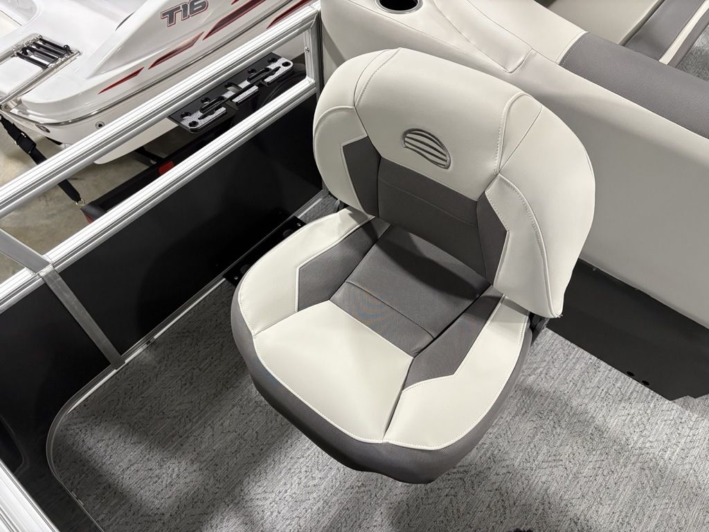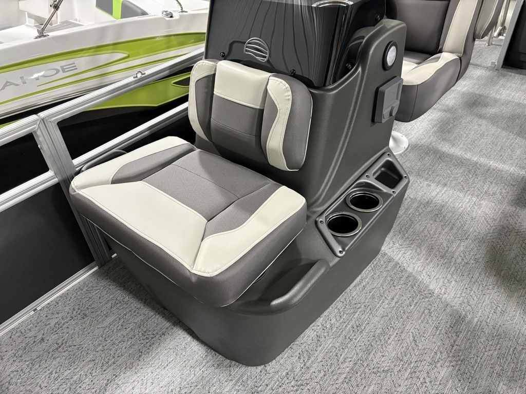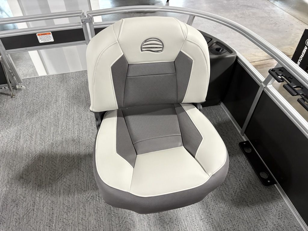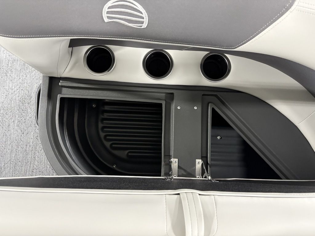 - Front fishing station w/2 pedestal seat base locations; rail-mounted rod & tool holders; & bow starboard storage compartment w/rod & drink holders