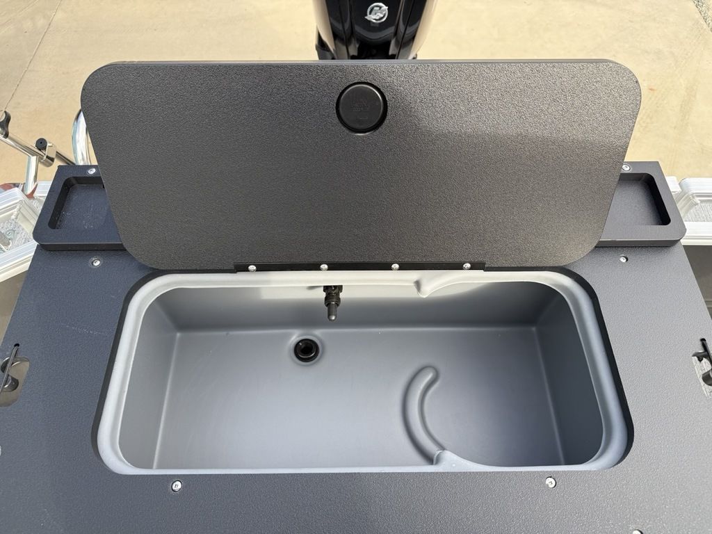 - Aft 15-gal. (56.78 L) aerated livewell/baitwell w/shutoff valve, drink holder, rod holder & composite lid w/fish ruler