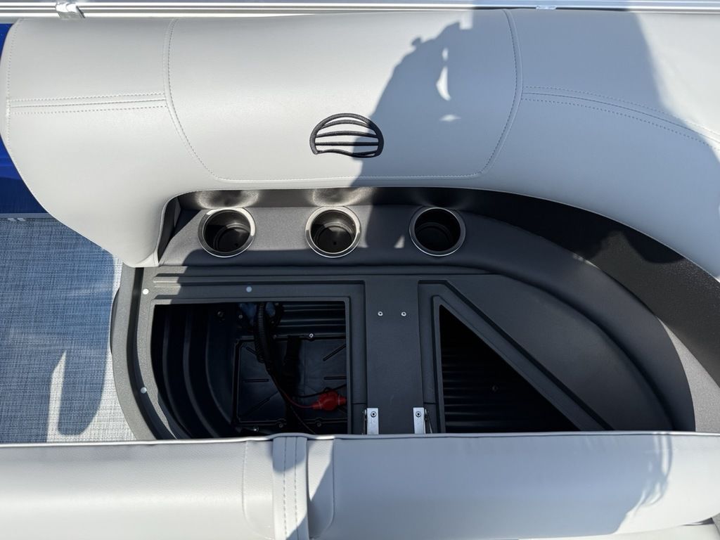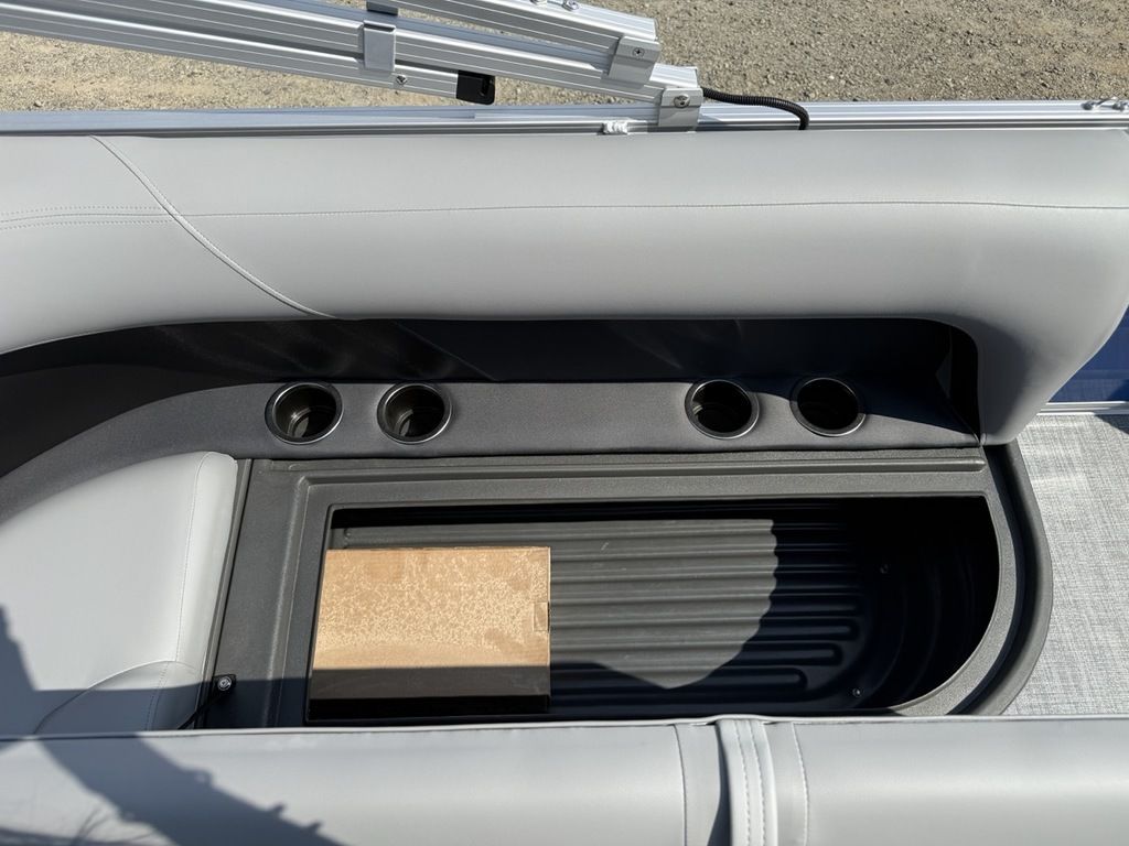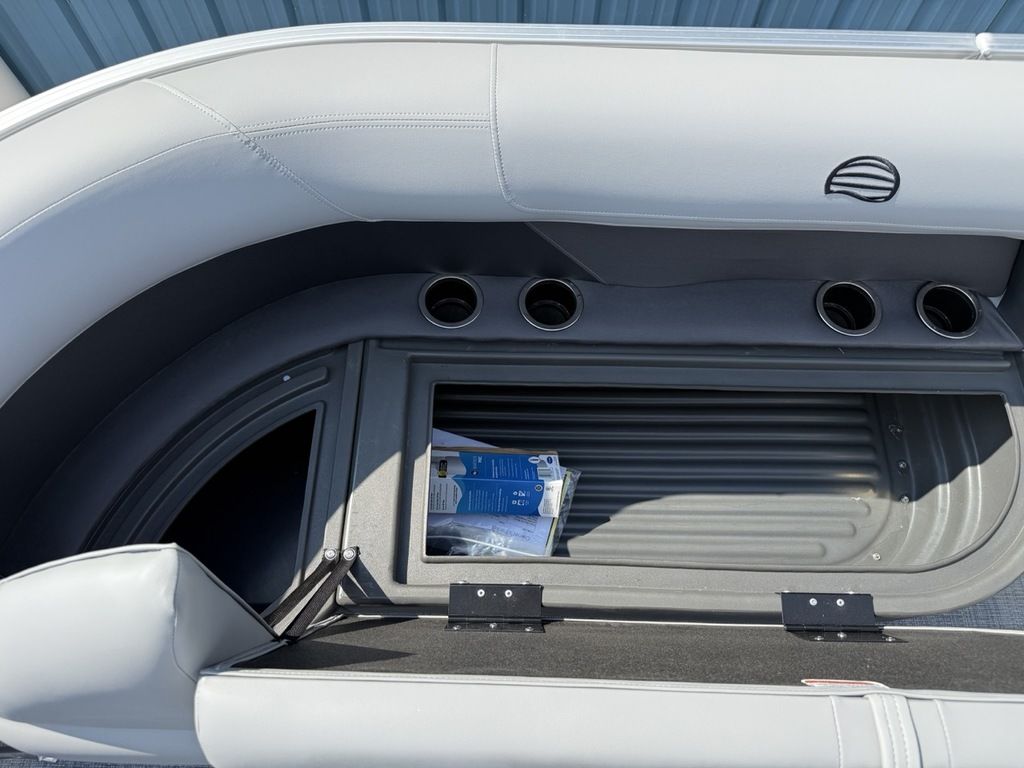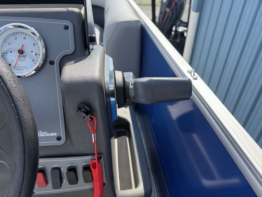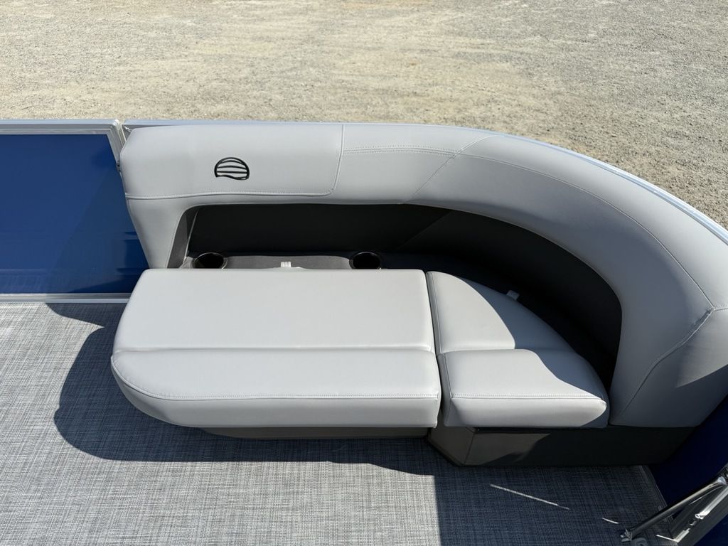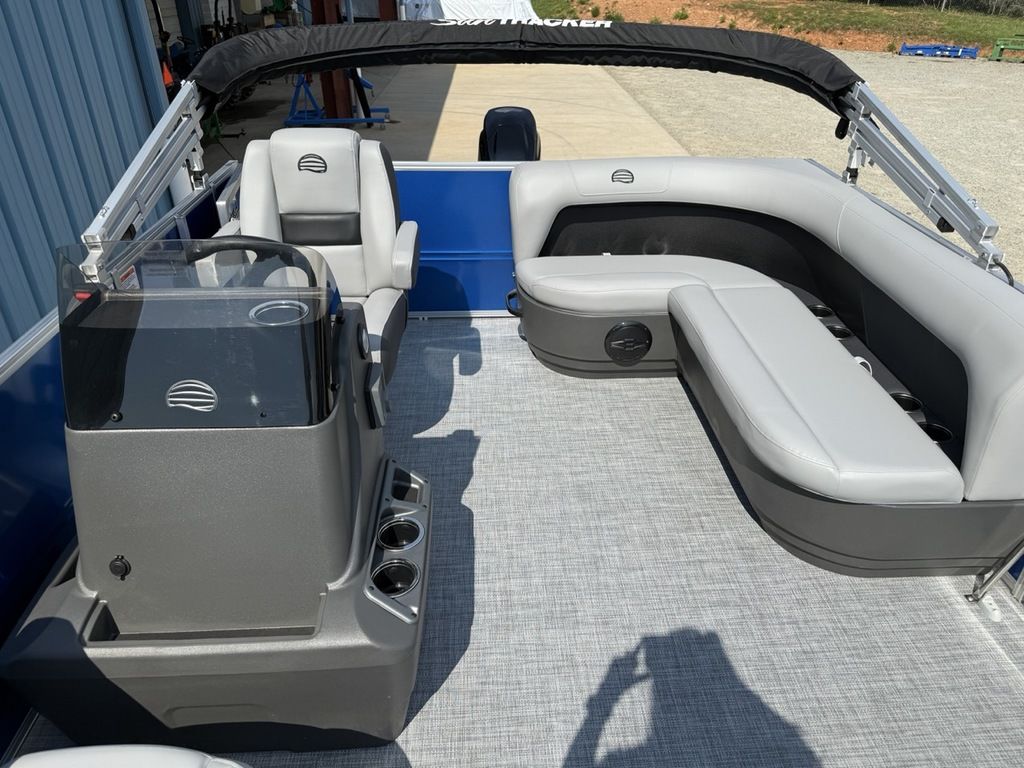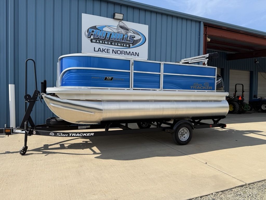 2026 Sun Tracker Party Barge® 16 DLX Our most compact PARTY BARGE is ready to bring the fun to the lake with a crew of up to 7. The first thing you'll notice after boarding are the 3 luxurious lounges—each wrapped in a durable and UV-resistant, hand-cut and hand-sewn 26 oz. vinyl, and you'll find ample storage under each, with an in-deck pedestal base will support an optional table. The molded fiberglass-reinforced console sports a removable, tinted windscreen, a new sport steering wheel, a below-console cooler/storage space, and a Mercury® binnacle control box.