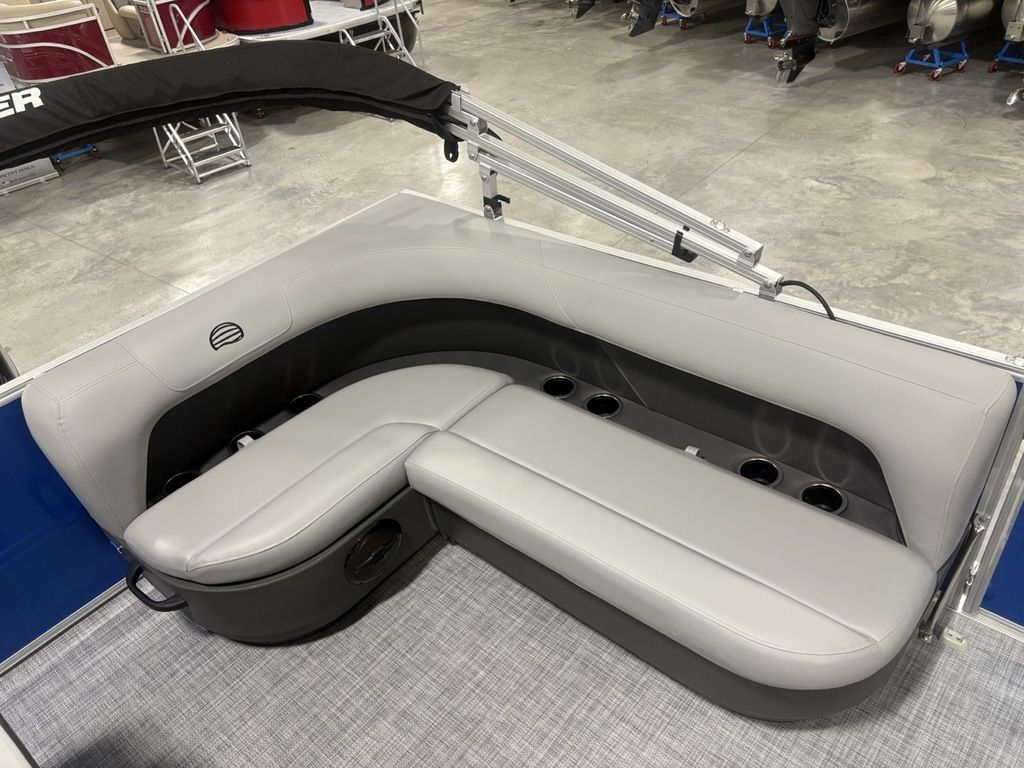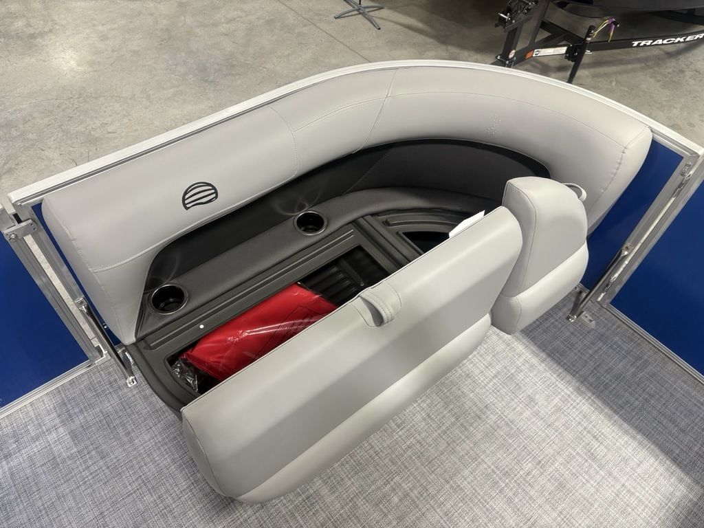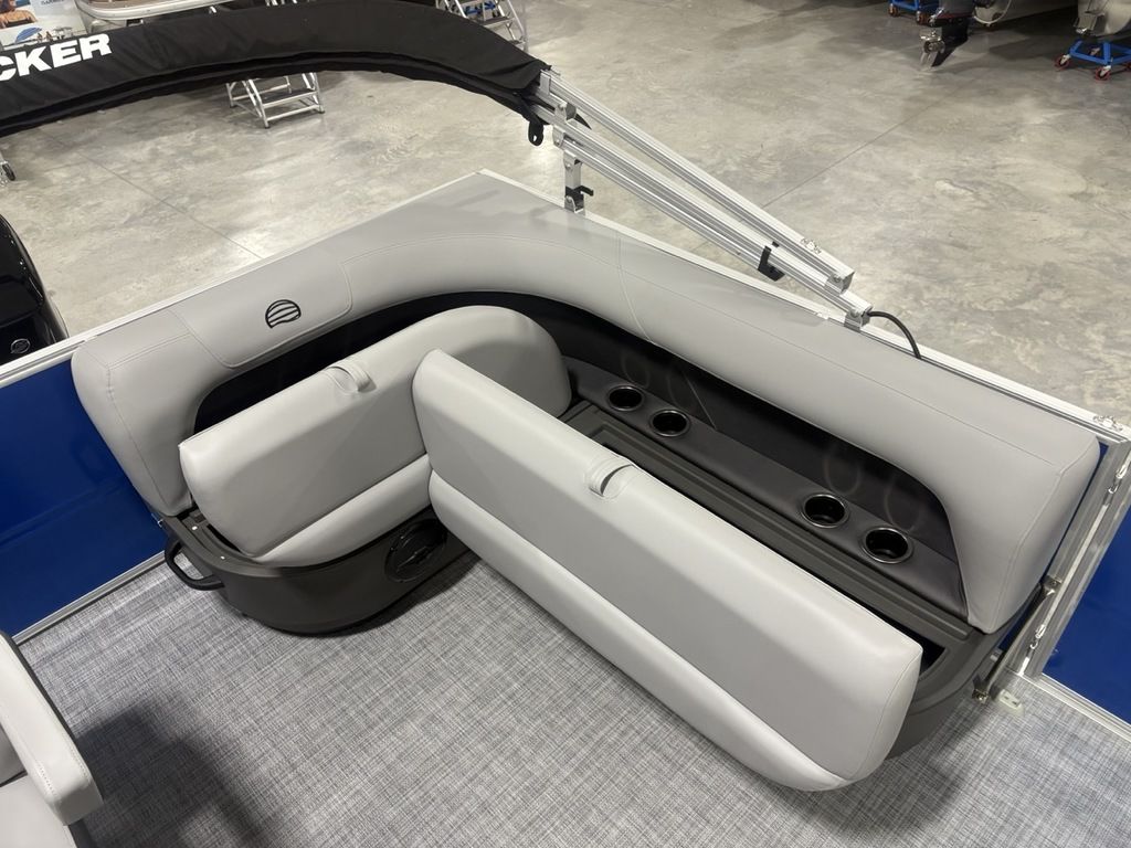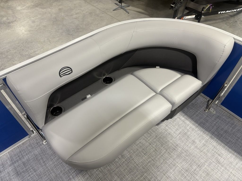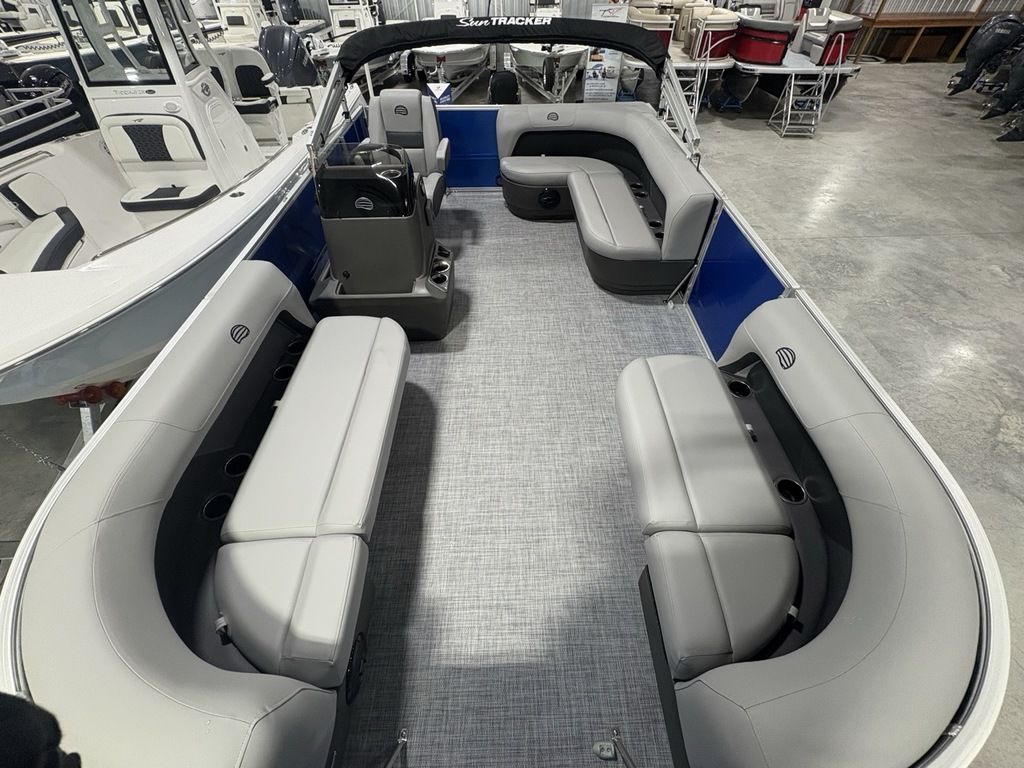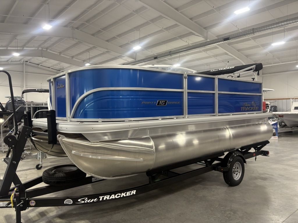 2026 Sun Tracker Party Barge® 16 DLX Our most compact PARTY BARGE is ready to bring the fun to the lake with a crew of up to 7. The first thing you'll notice after boarding are the 3 luxurious lounges—each wrapped in a durable and UV-resistant, hand-cut and hand-sewn 26 oz. vinyl, and you'll find ample storage under each, with an in-deck pedestal base will support an optional table. The molded fiberglass-reinforced console sports a removable, tinted windscreen, a new sport steering wheel, a below-console cooler/storage space, and a Mercury® binnacle control box.
