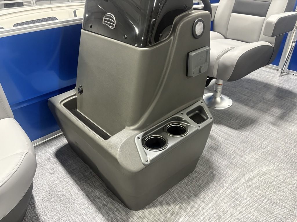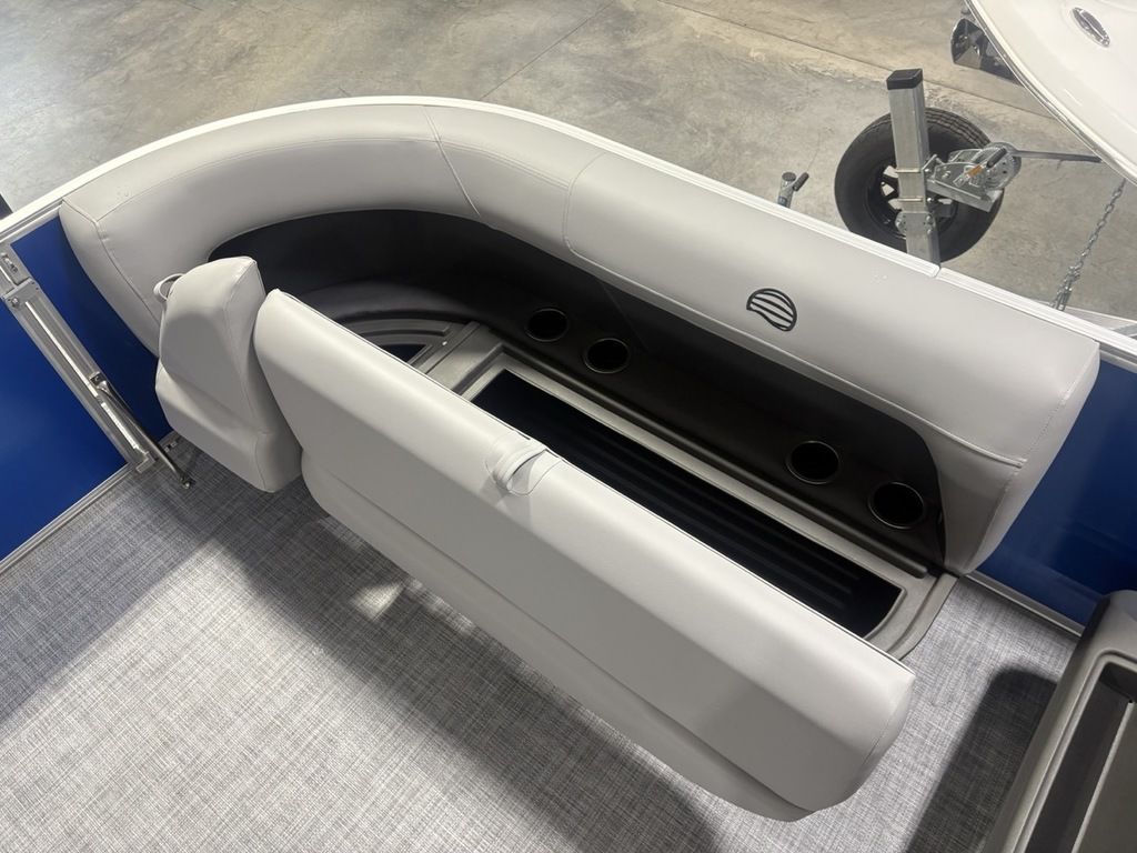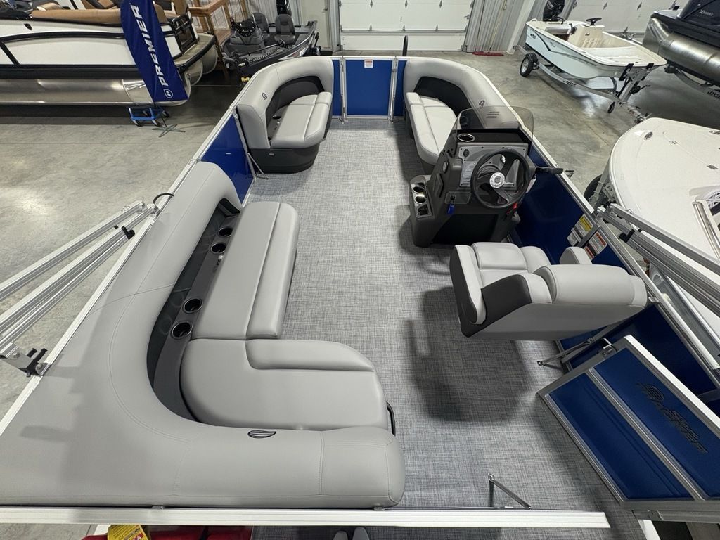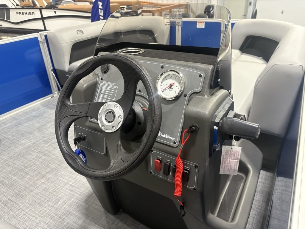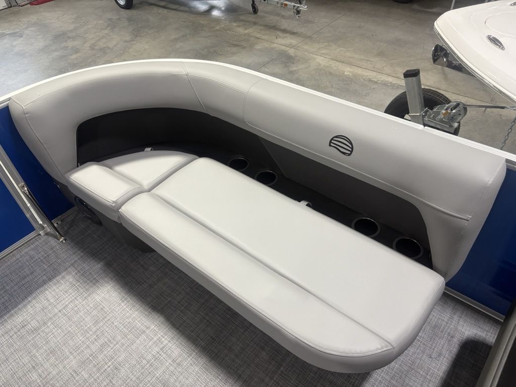 2026 Sun Tracker Party Barge® 16 DLX Our most compact PARTY BARGE is ready to bring the fun to the lake with a crew of up to 7. The first thing you'll notice after boarding are the 3 luxurious lounges—each wrapped in a durable and UV-resistant, hand-cut and hand-sewn 26 oz. vinyl, and you'll find ample storage under each, with an in-deck pedestal base will support an optional table. The molded fiberglass-reinforced console sports a removable, tinted windscreen, a new sport steering wheel, a below-console cooler/storage space, and a Mercury® binnacle control box.