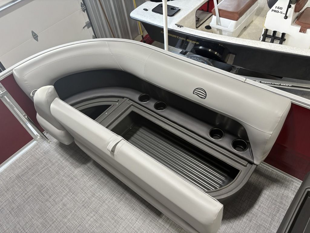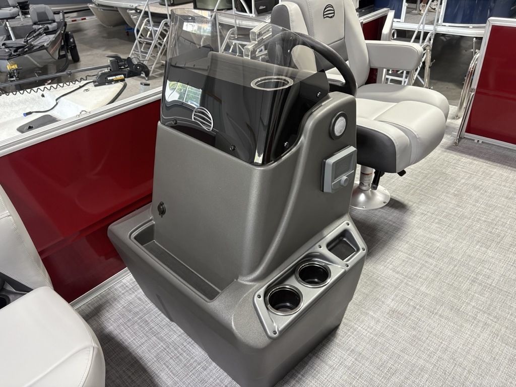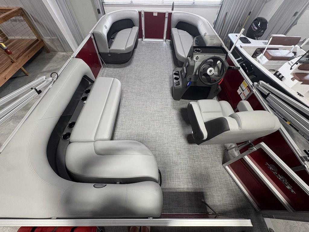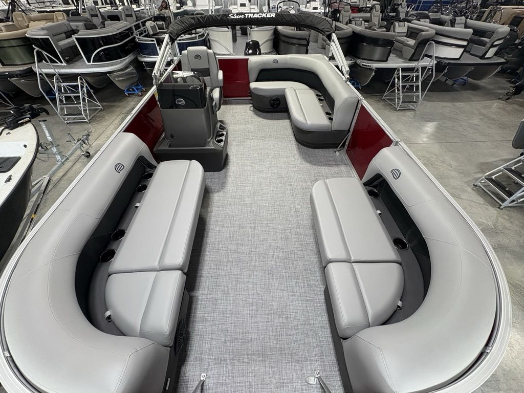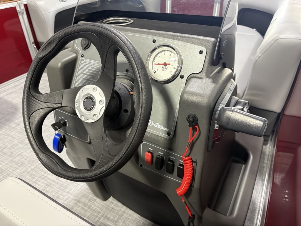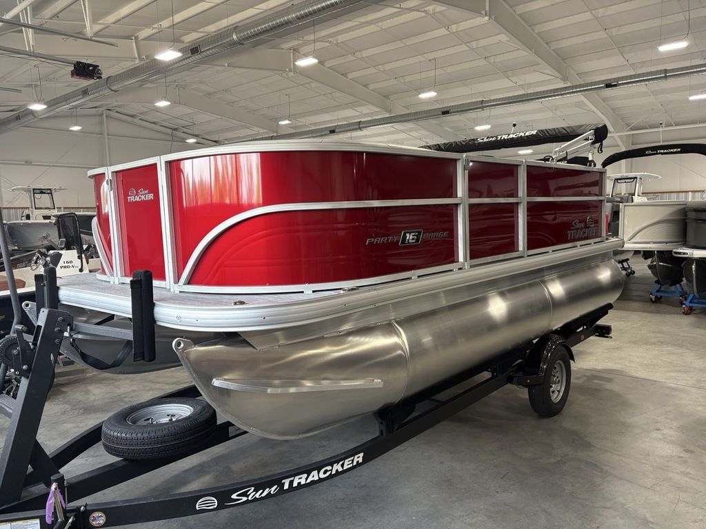 2026 Sun Tracker Party Barge® 16 DLX Our most compact PARTY BARGE is ready to bring the fun to the lake with a crew of up to 7. The first thing you'll notice after boarding are the 3 luxurious lounges—each wrapped in a durable and UV-resistant, hand-cut and hand-sewn 26 oz. vinyl, and you'll find ample storage under each, with an in-deck pedestal base will support an optional table. The molded fiberglass-reinforced console sports a removable, tinted windscreen, a new sport steering wheel, a below-console cooler/storage space, and a Mercury® binnacle control box.