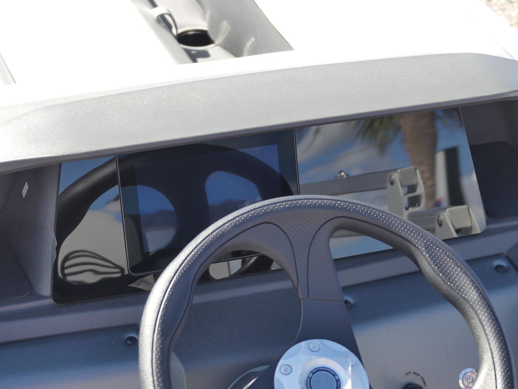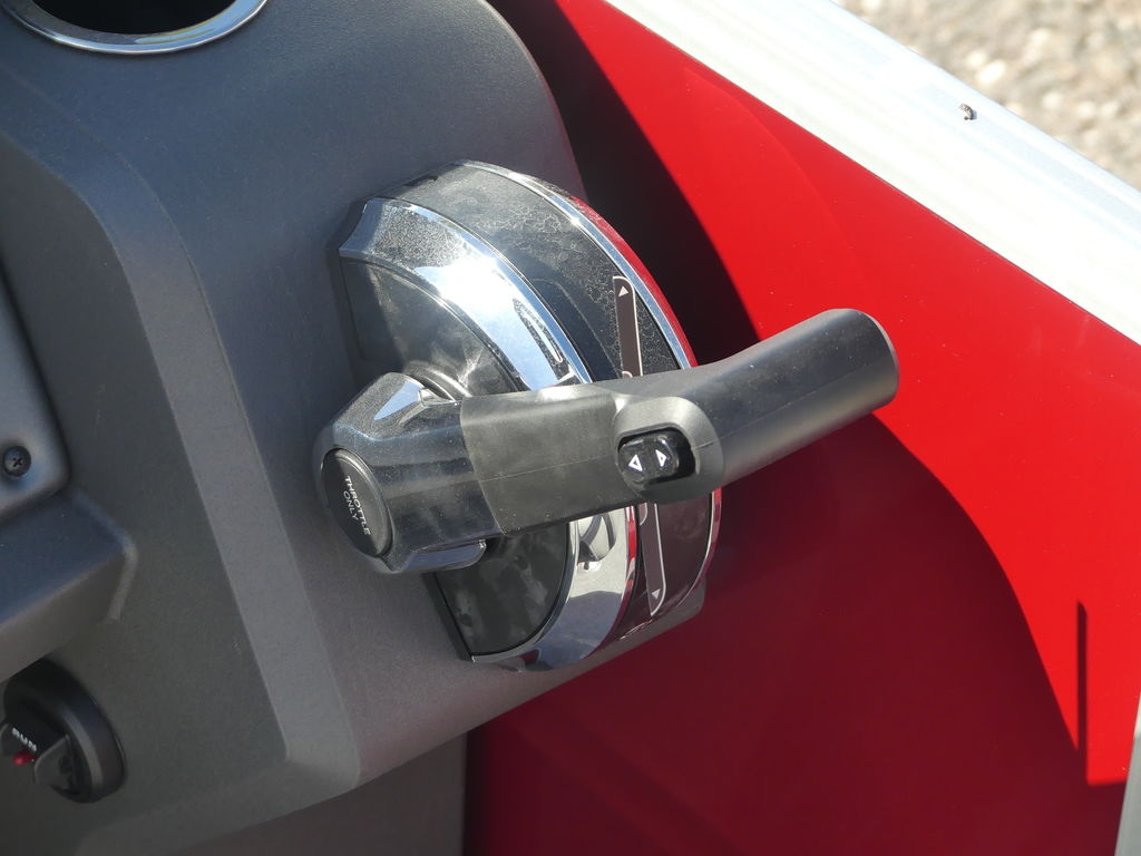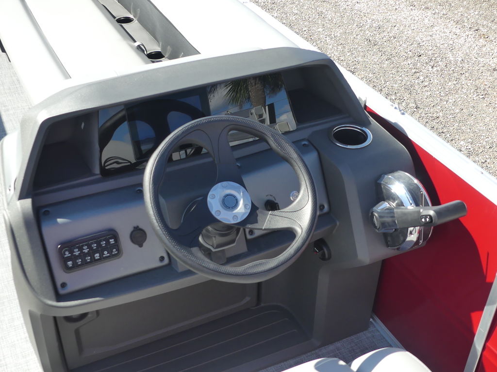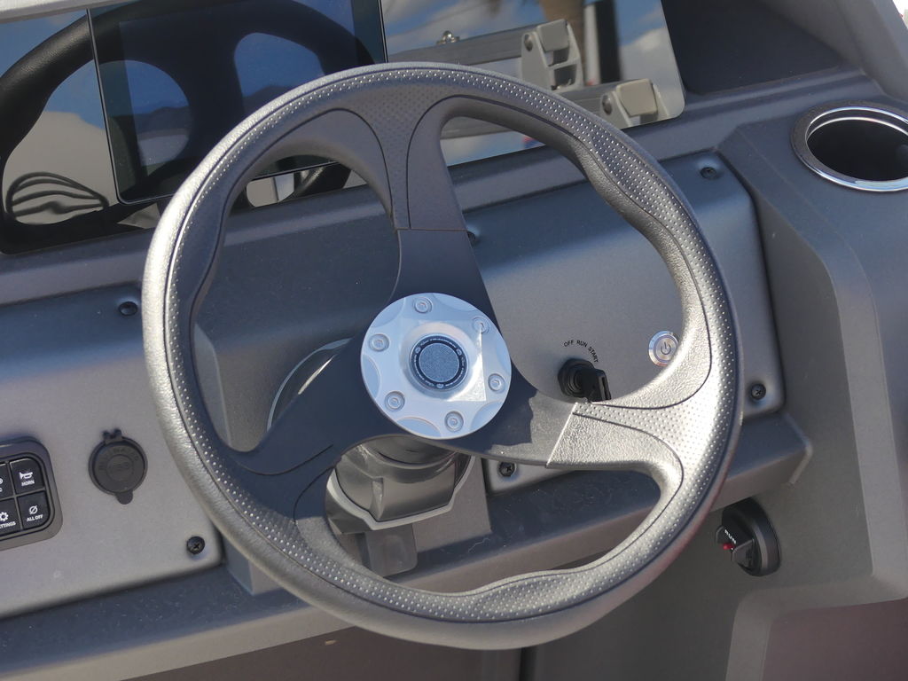 The helm is designed for confident handling and comfort, featuring intuitive controls, ample storage, and no-feedback sport steering that ensures smooth maneuvering on a variety of waters. A Bluetooth®-capable stereo system with quality speakers sets the soundtrack for your day, while the Bimini top offers generous shade to keep you cool on sunny afternoons.
