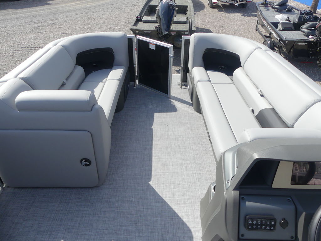 Some exciting new changes come with the 2026 model! The captain's console has received a complete facelift. The three corner lounges give your passengers plenty of space to relax in. These lounges have new accents that match the fence colors and also sport great new corner storage cubbies with more cupholders. Lift those pillow-top seats to reveal hidden storage compartments.