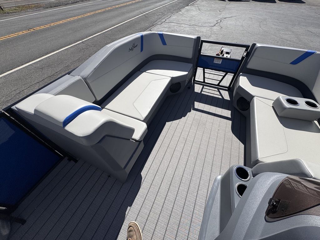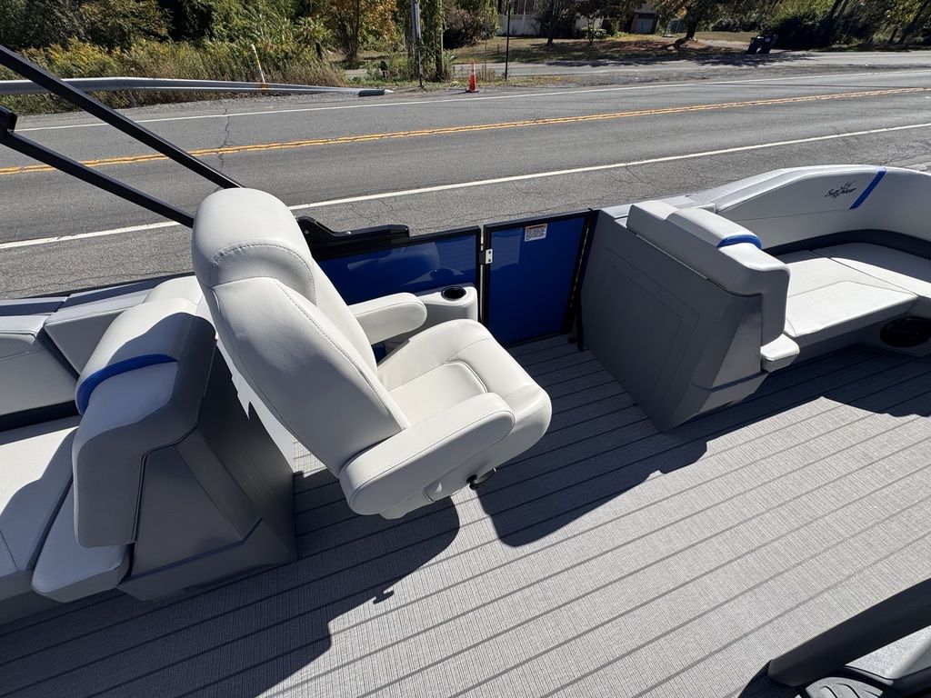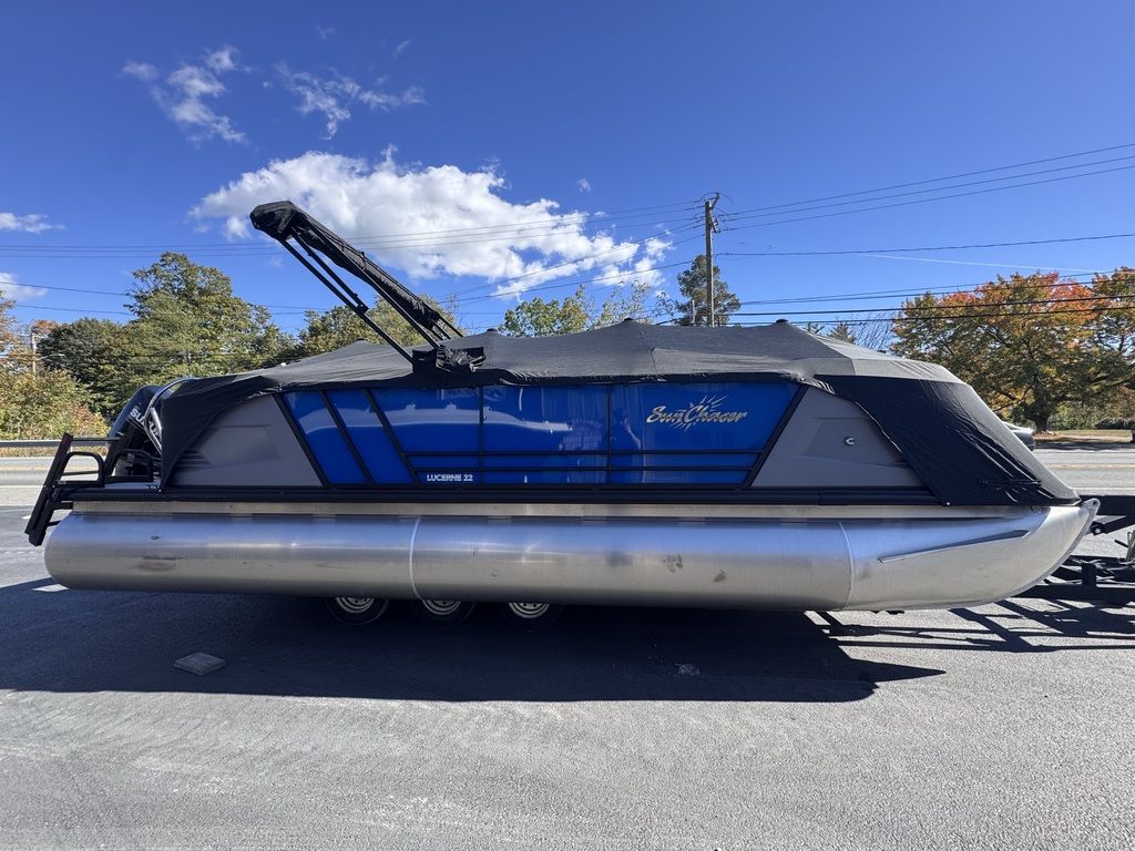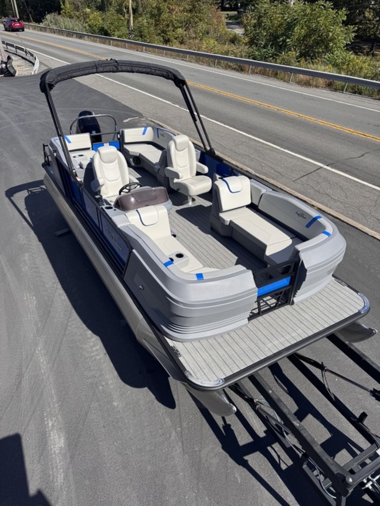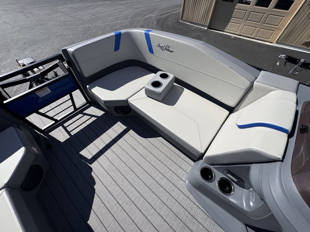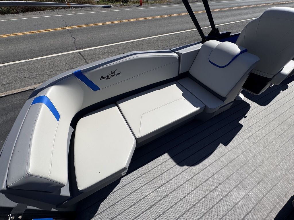 The new Sunchaser 22 LR DH Lucerne Sport is a sleek, value-driven pontoon boat designed for both comfort and style. The sport comes standard with a PTS package (third tube, performance strakes, performance shield). This 20-foot model features a practical layout with side-by-side helm chairs, offering a spacious and inviting cockpit. Its rotomolded corner pieces seamlessly integrate into the side panels, giving it a polished, modern look. Enhanced with black rails, deck trim, and a bimini frame, the Lucerne stands out in both functionality and design. Built with durable 23" diameter tubes and full sea weave flooring, it promises stability and longevity on the water, making it the perfect choice for those seeking a versatile and stylish pontoon experience.