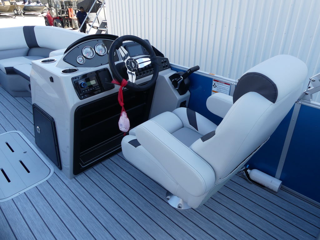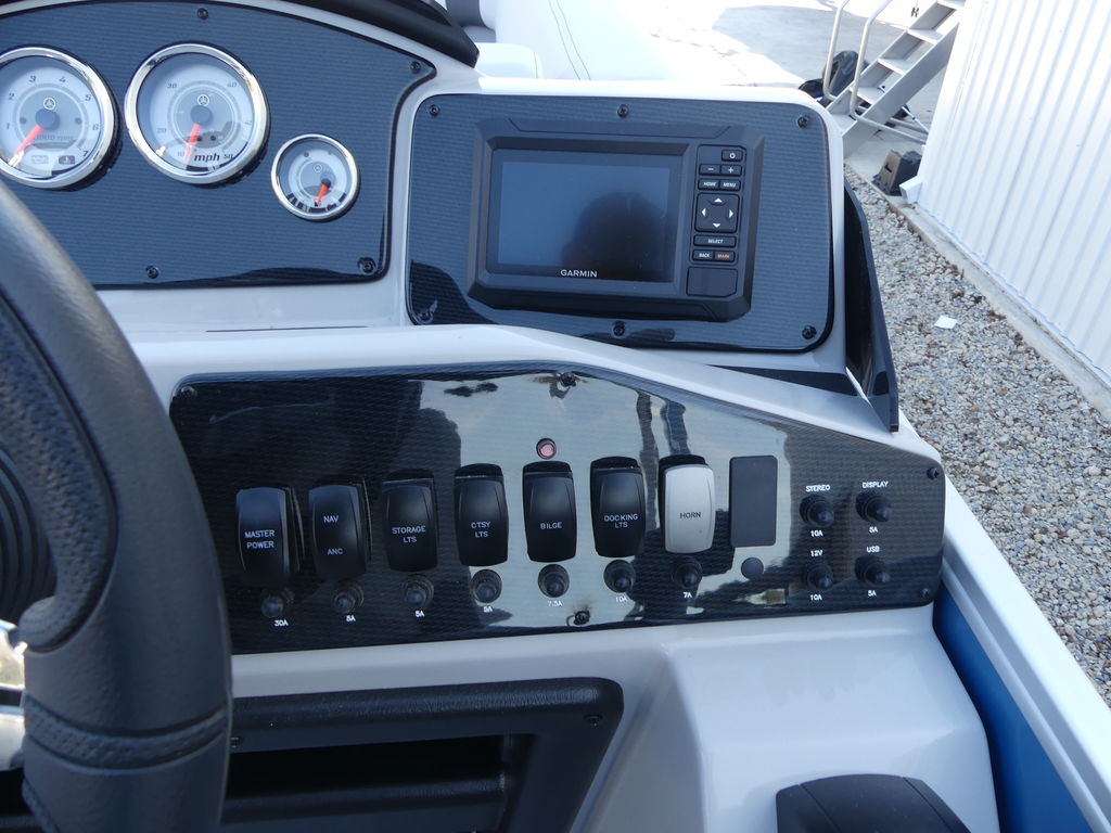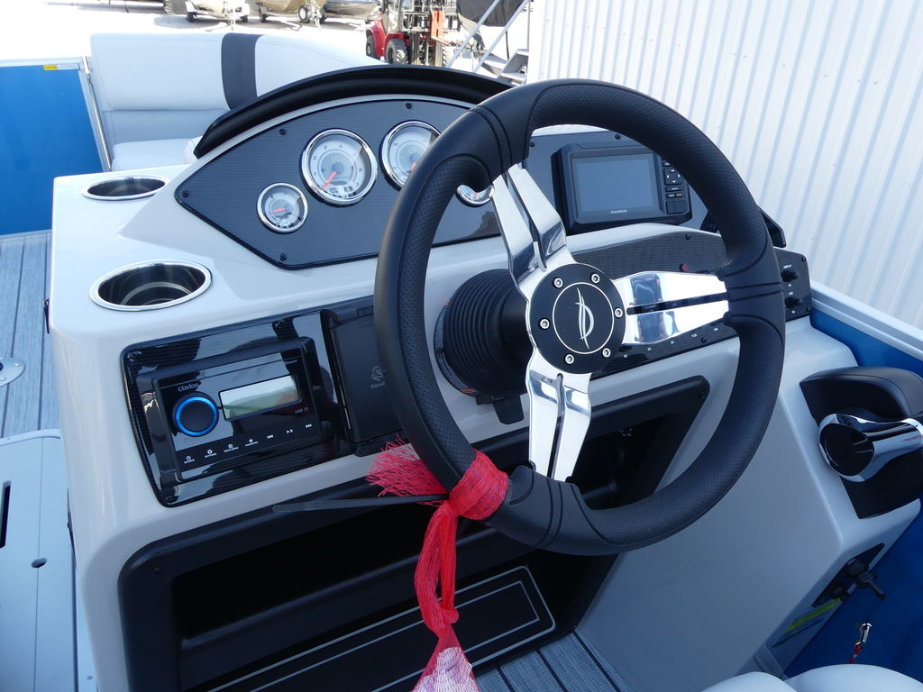 - Equipped with hydraulic steering, a tilt wheel, Clarion stereo system, Garmin 53cv, and a surface mount cell phone charger.