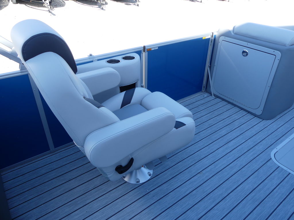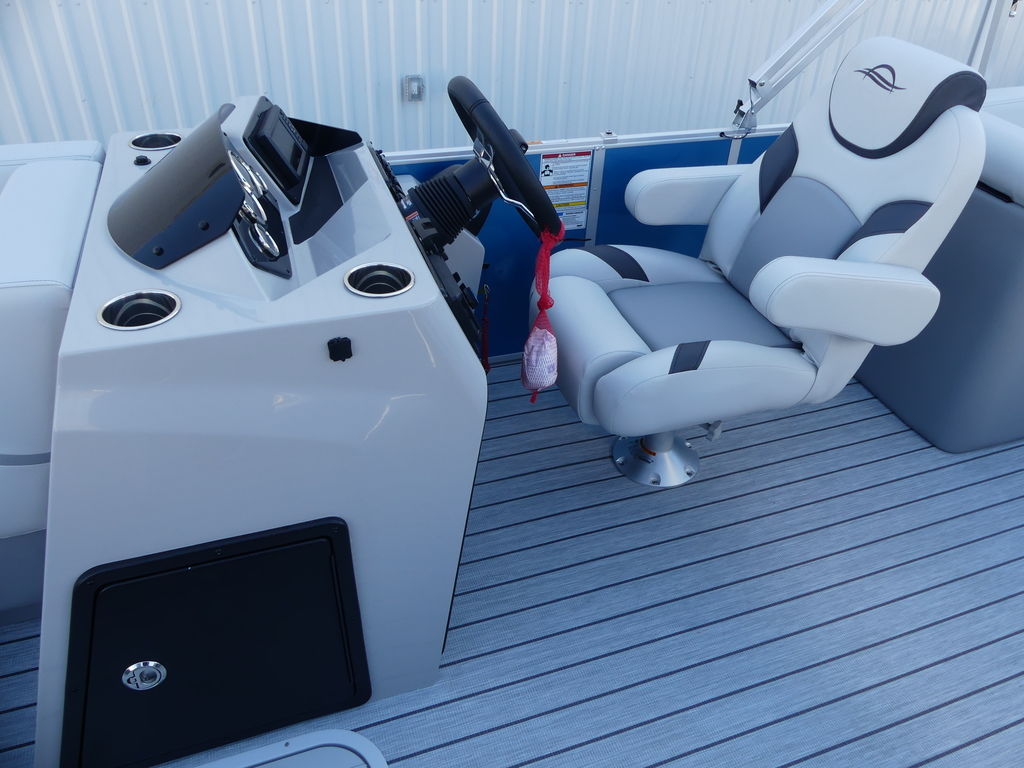 - Bolster high-back helm seat, spacious footwell, and handy shelf provide the captain with lasting comfort at the helm.